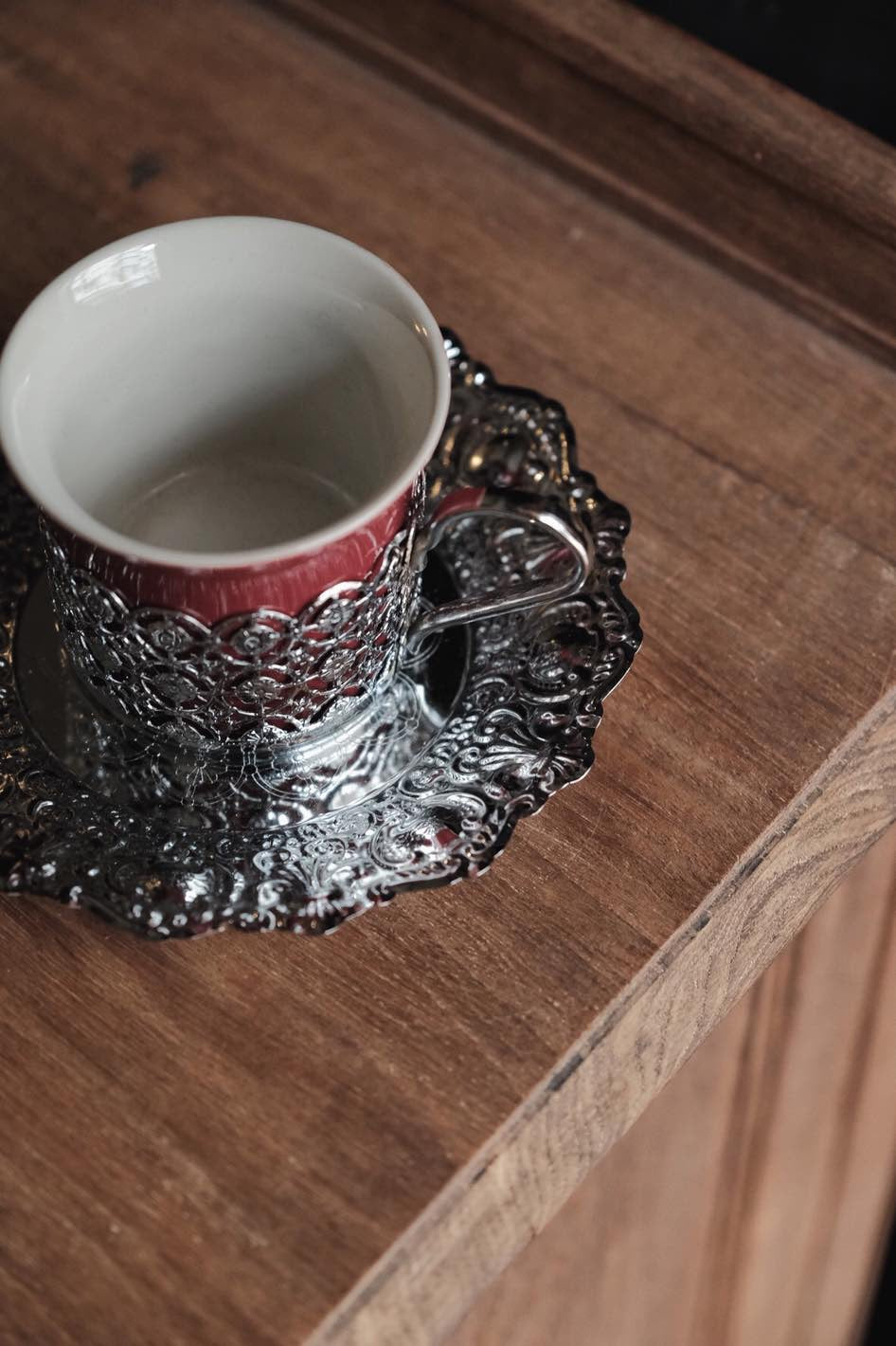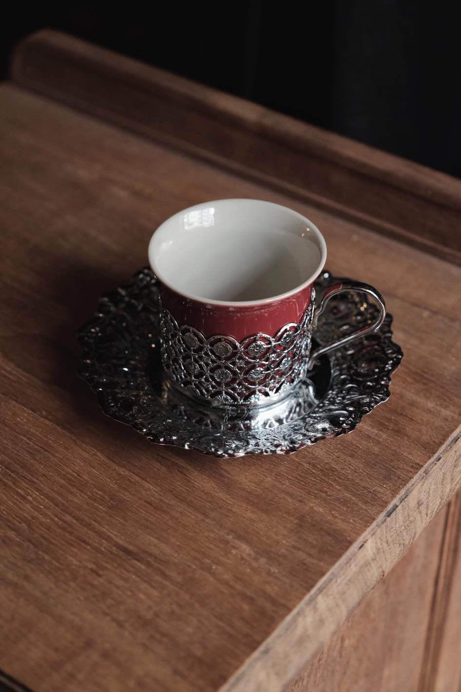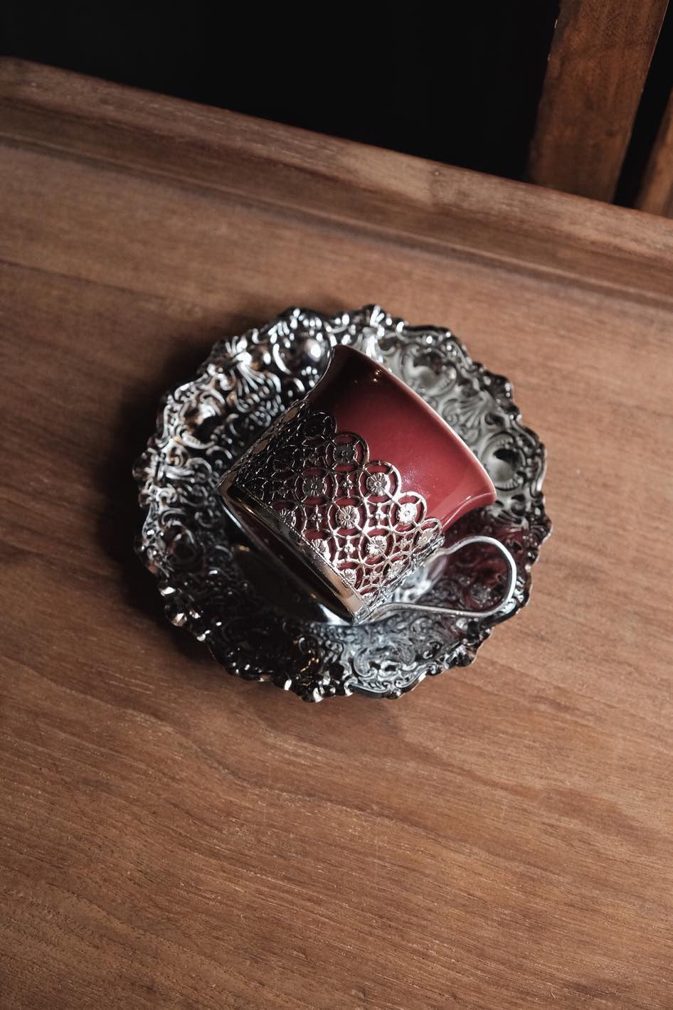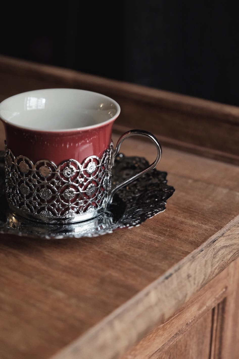 鏤空金屬花紋配優雅酒紅色,底碟有刻紋整體高雅,陶瓷杯可獨立拆出清潔,鍍銀表面有氧化痕跡。