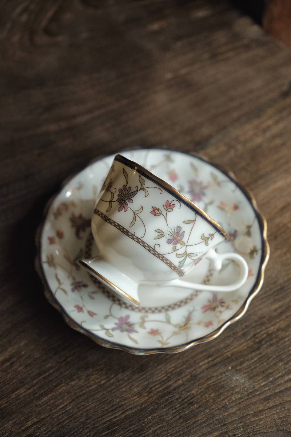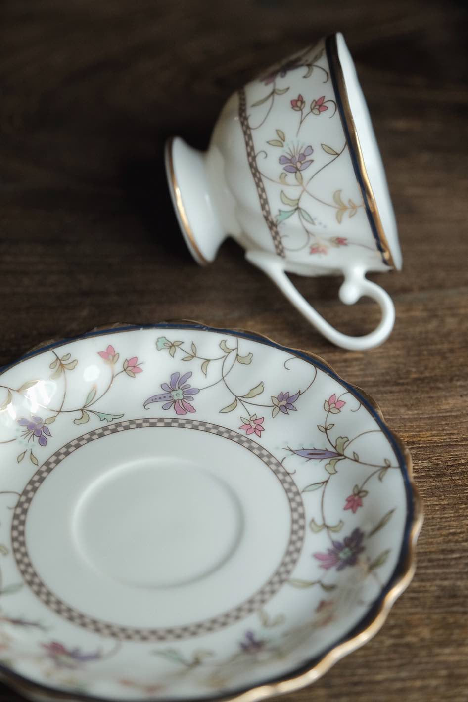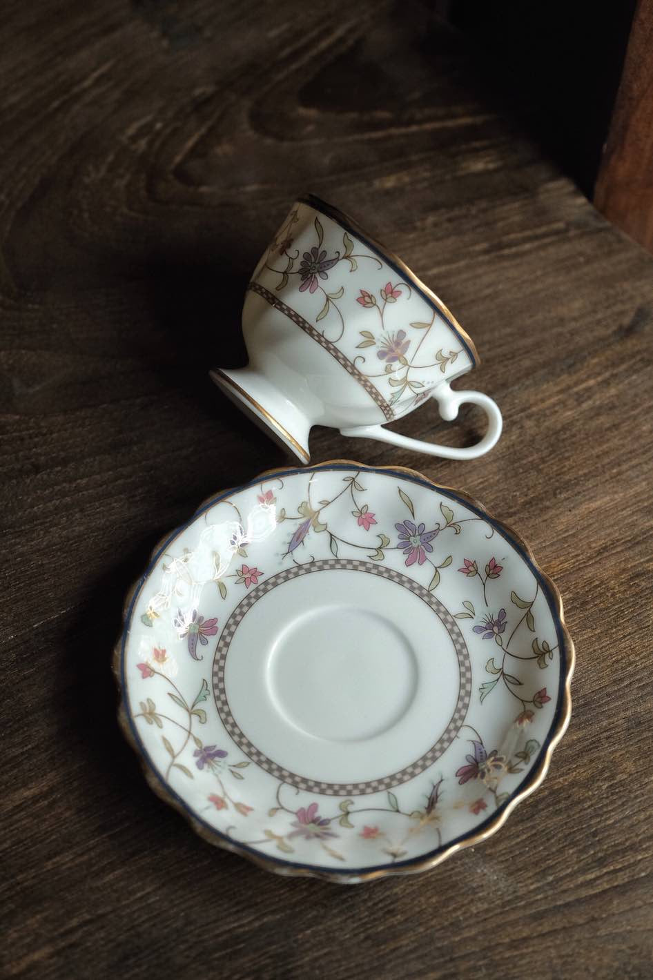 描金彩花,描金邊線,葵口高足杯碟,細瓷薄胎透光