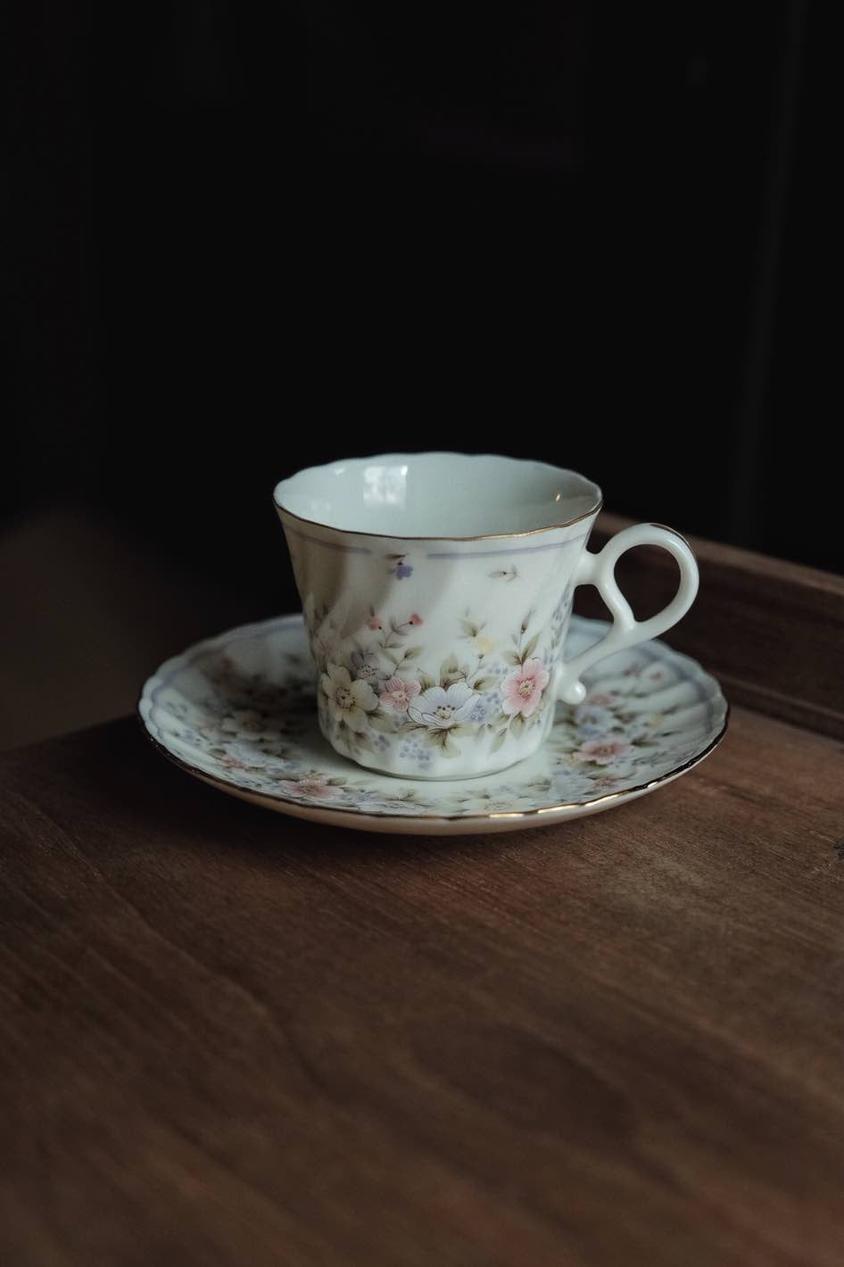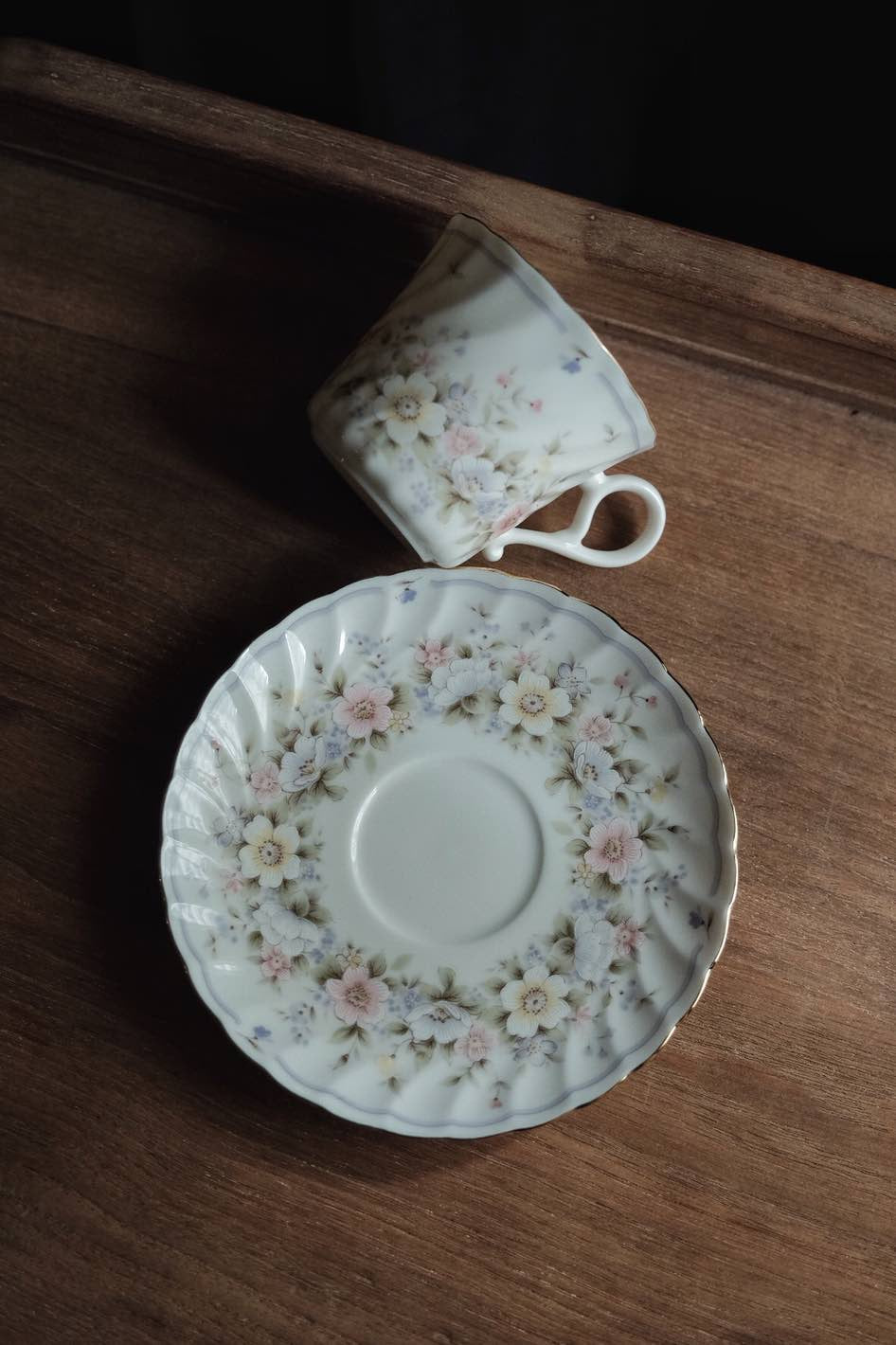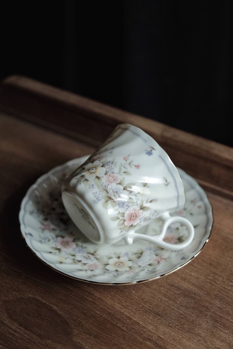 輕淡冷暖色碎花色調帶出溫柔感,杯身和碟身用上旋轉花形,有餘裙擺舞蹈中飄逸輕柔
