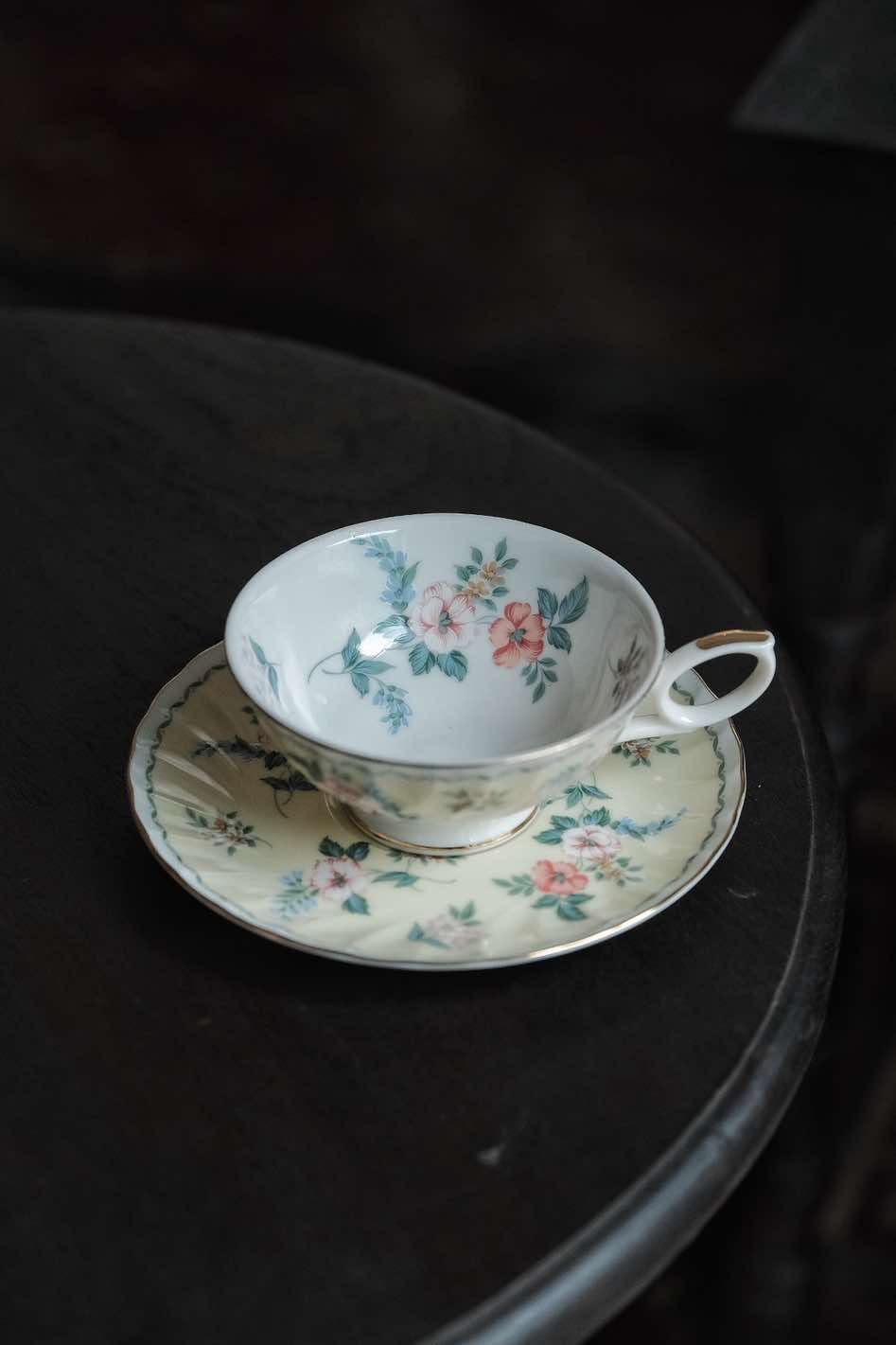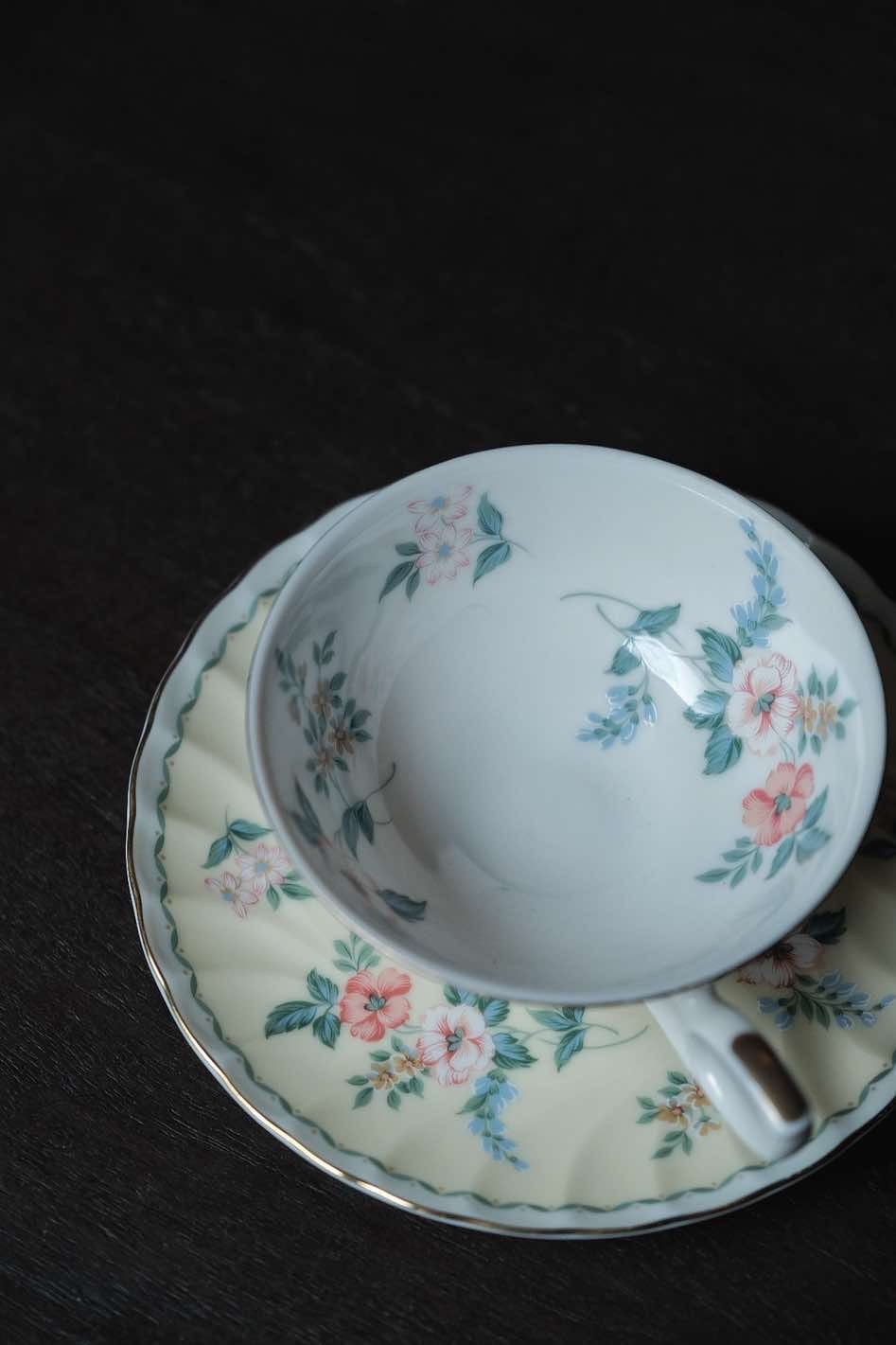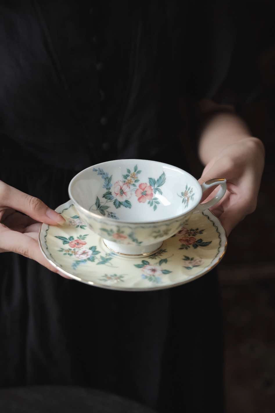 奶油黃彩花色調帶出溫柔感,水繪留白花的比例剛剛好,矮身紅茶杯,杯身和碟身用上旋轉花形,