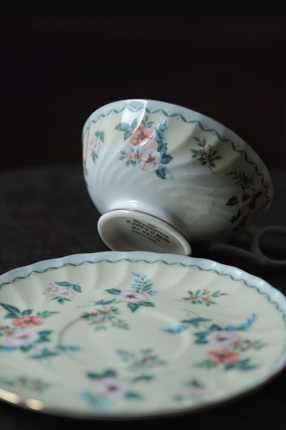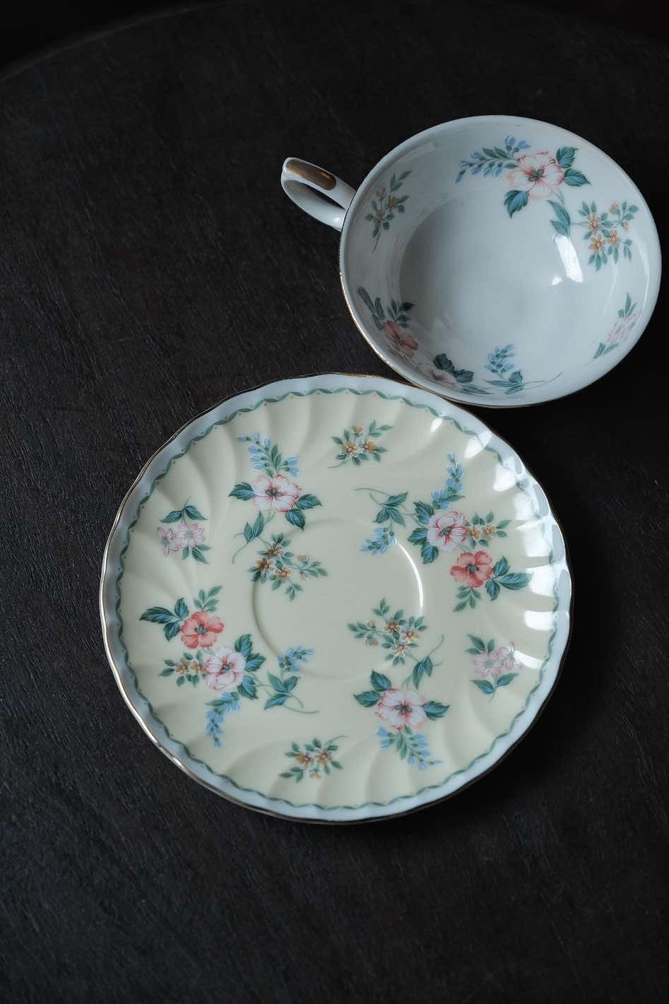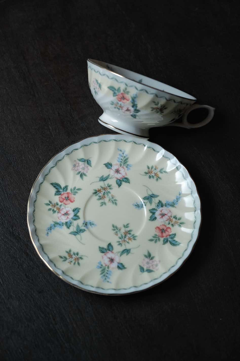 奶油黃彩花色調帶出溫柔感,水繪留白花的比例剛剛好,矮身紅茶杯,杯身和碟身用上旋轉花形,