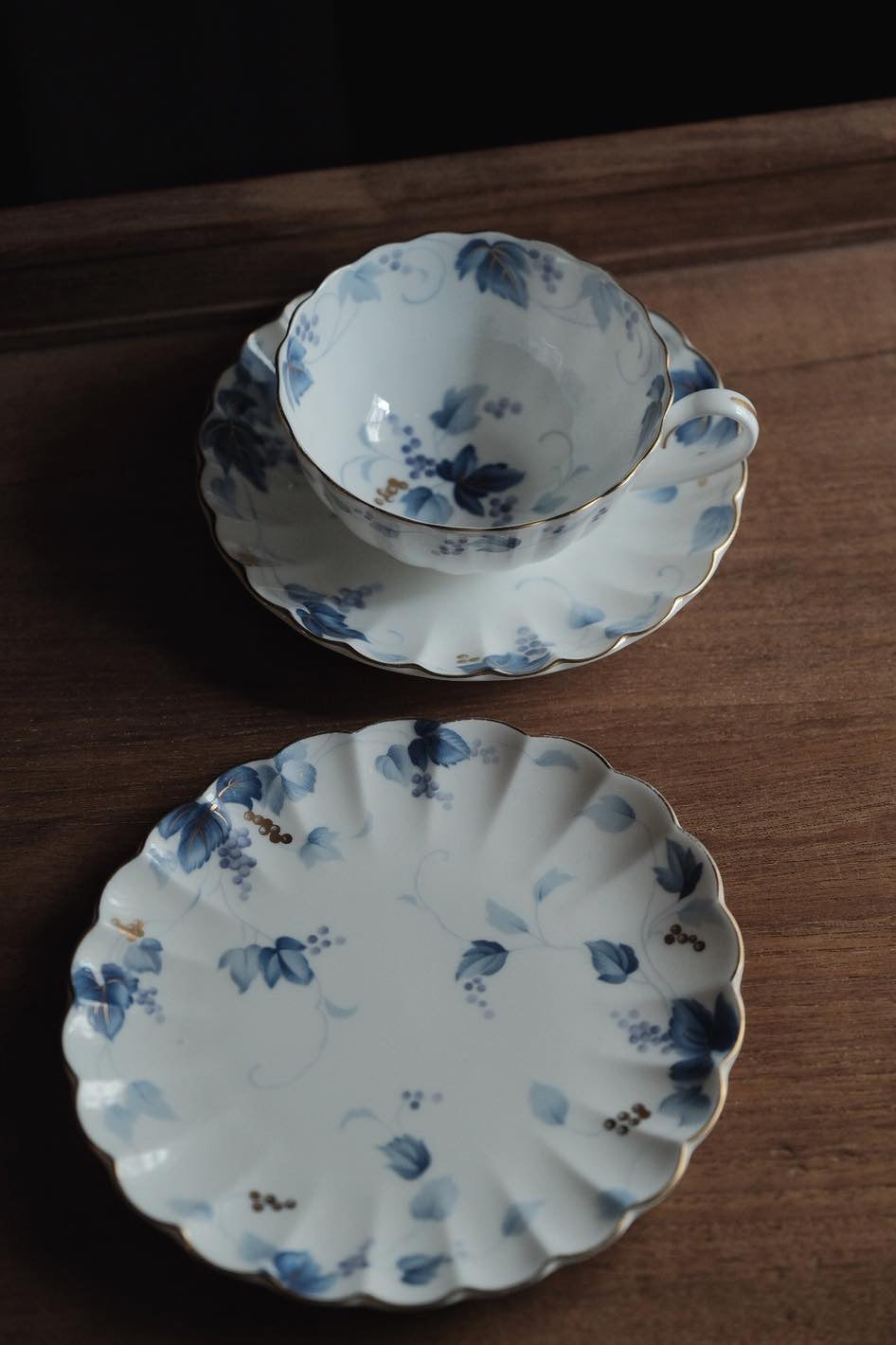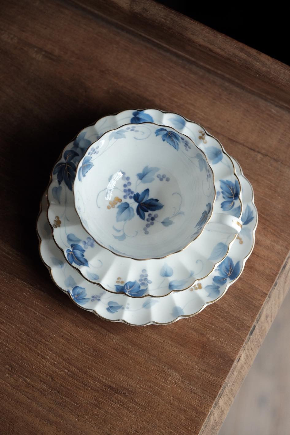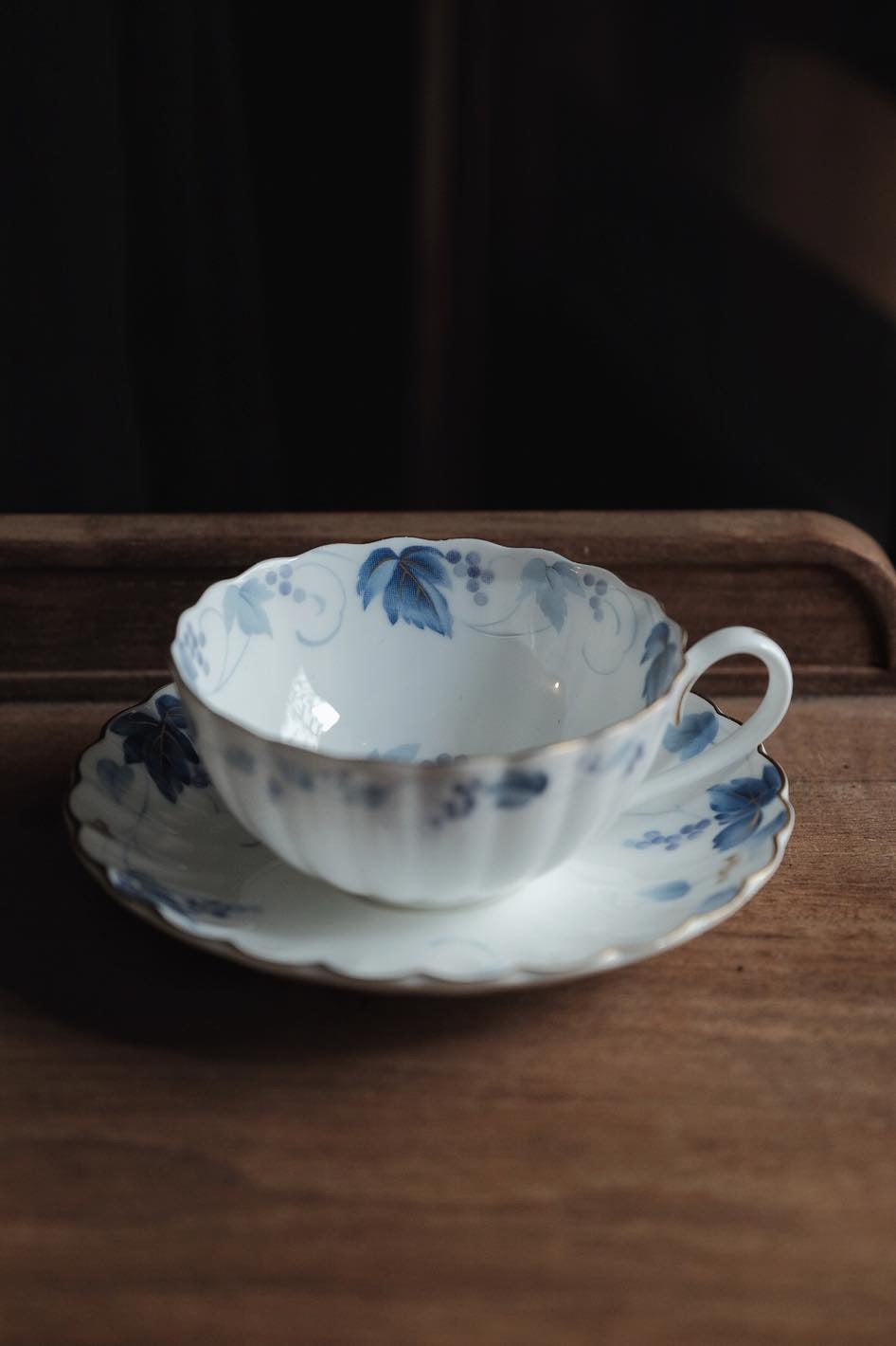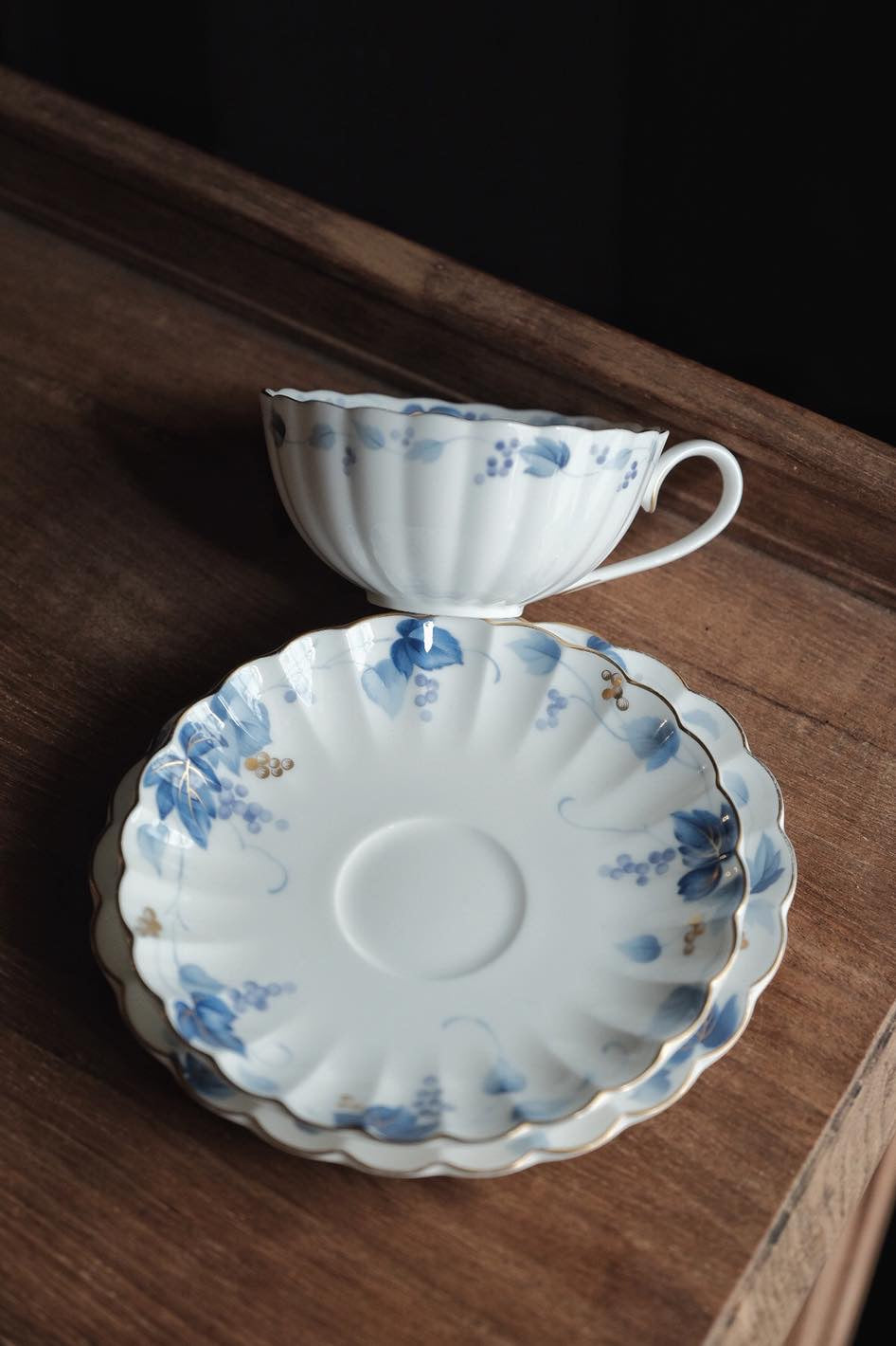 日本製NIKKO骨瓷青花付染葡萄藤葉描金杯連甜點碟三件(220ml)