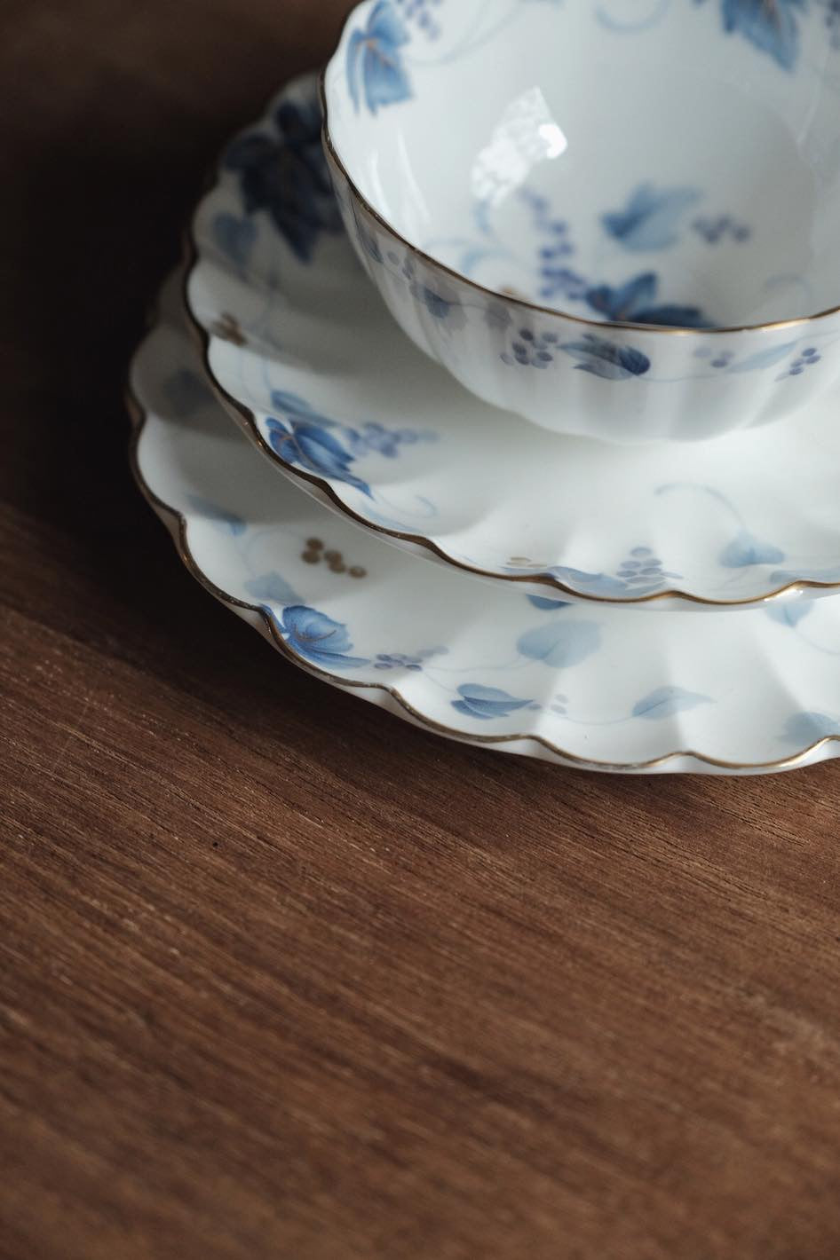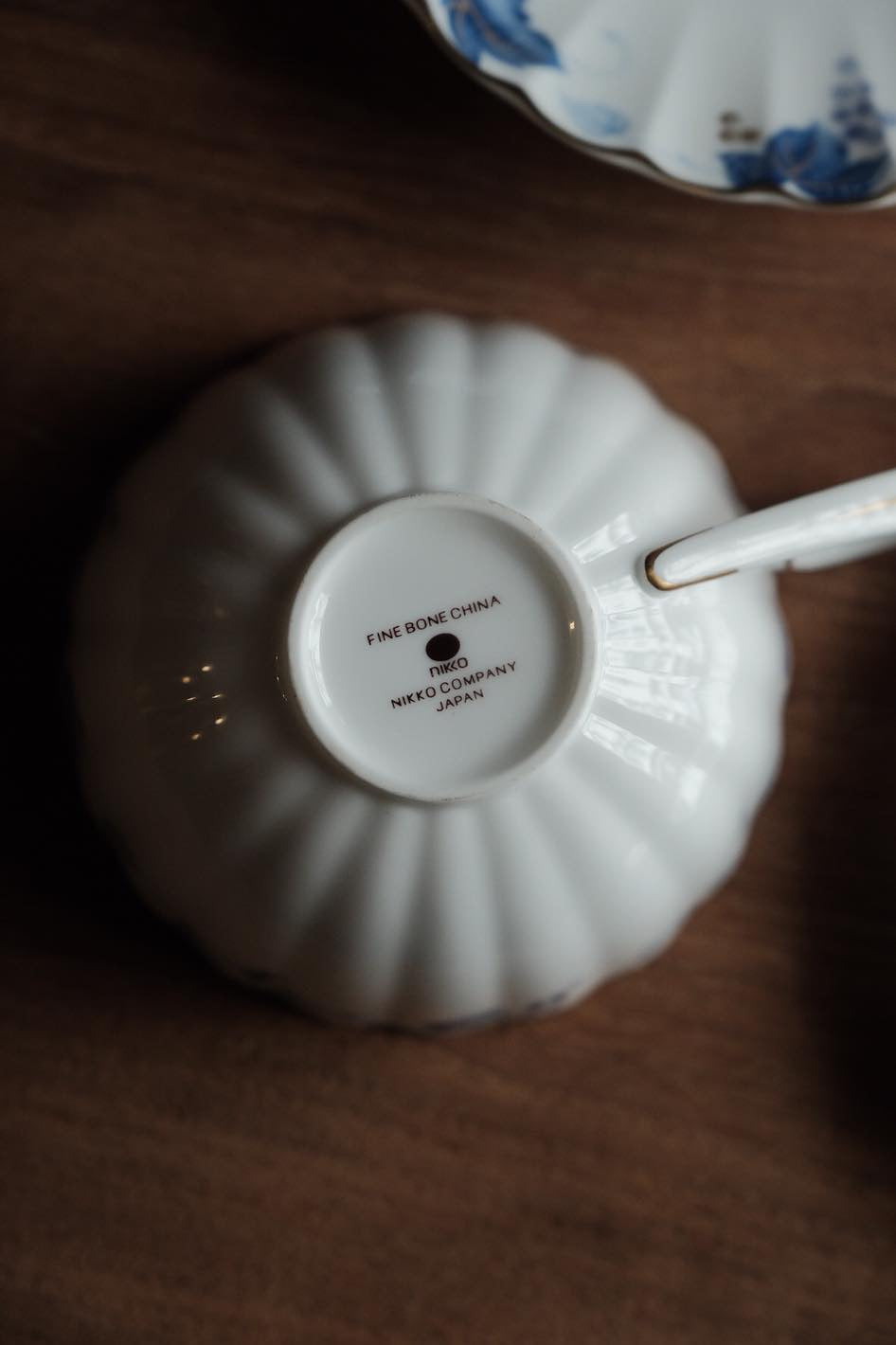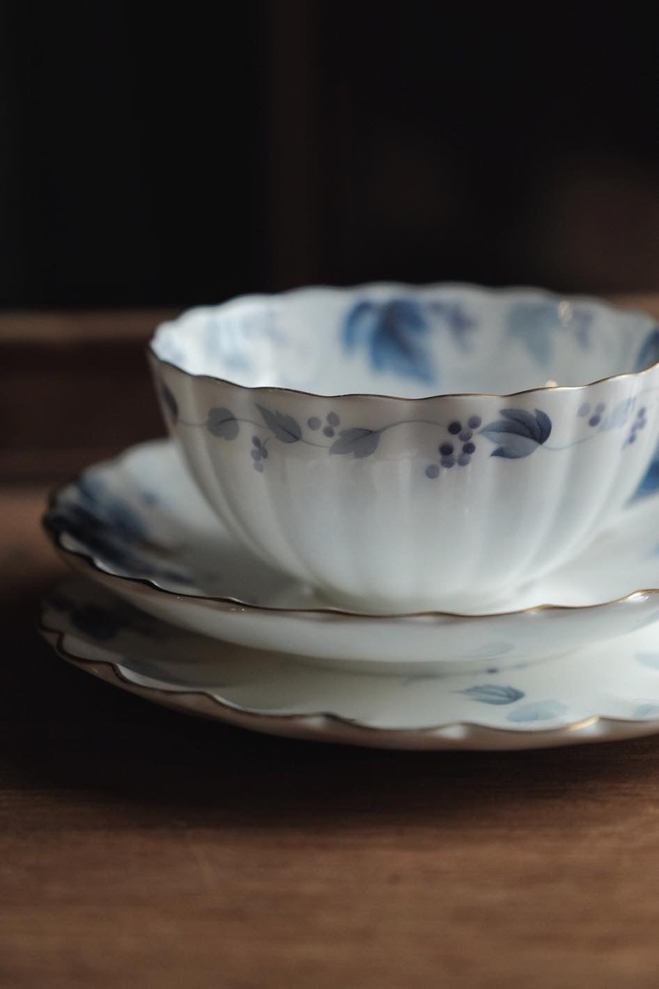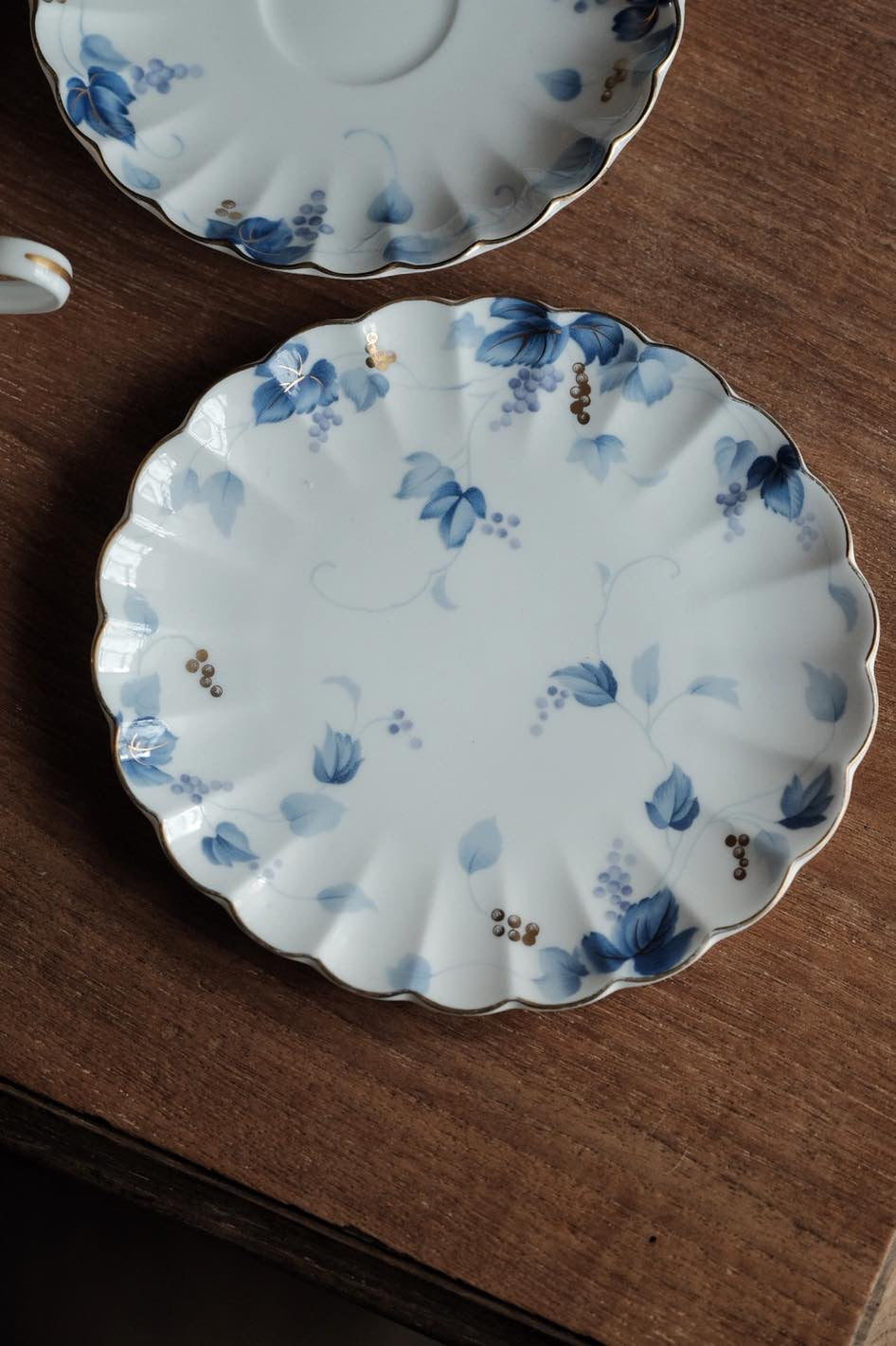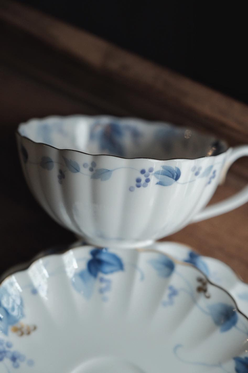 日本製NIKKO骨瓷青花付染葡萄藤葉描金杯連甜點碟三件(220ml)