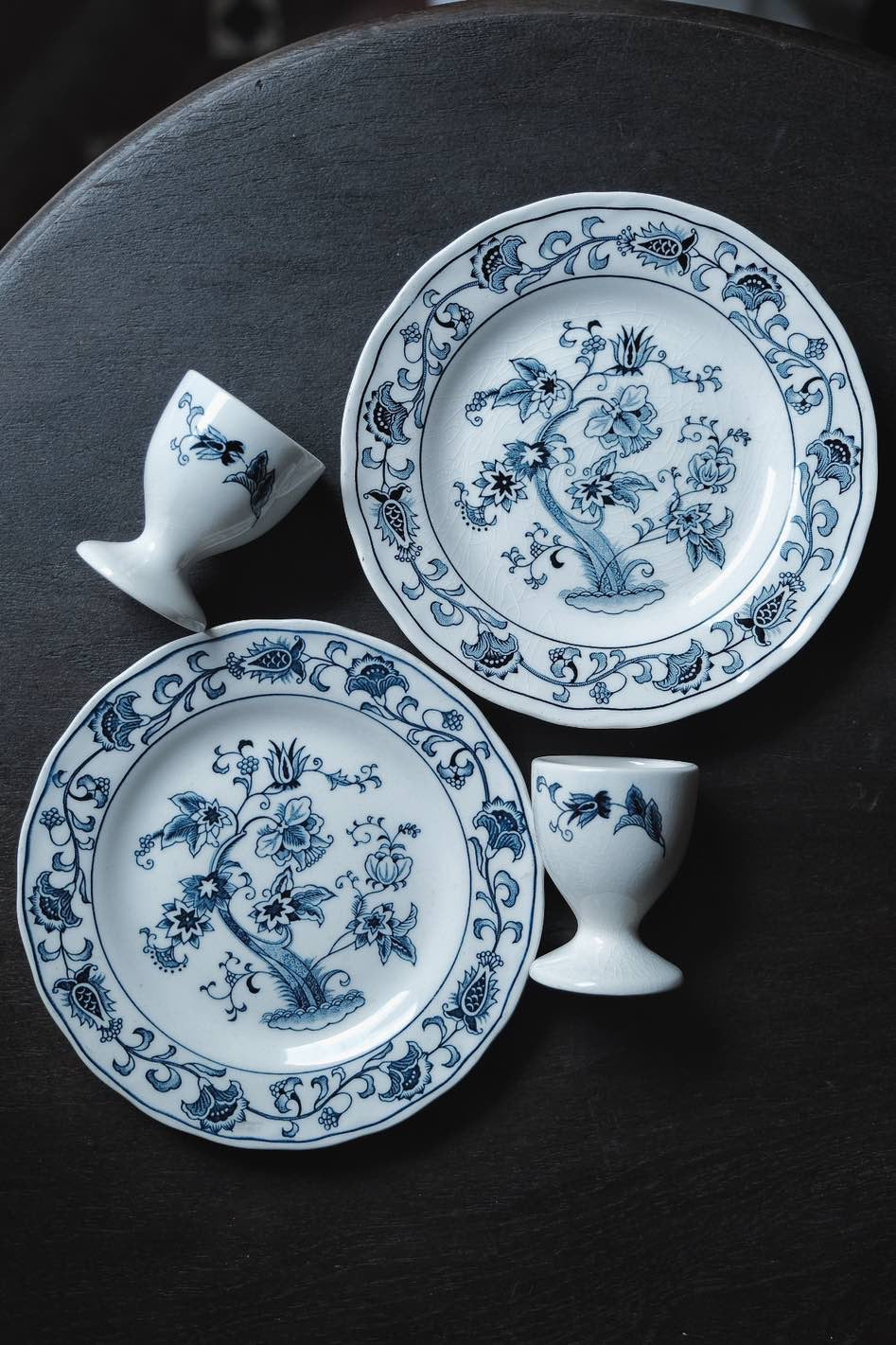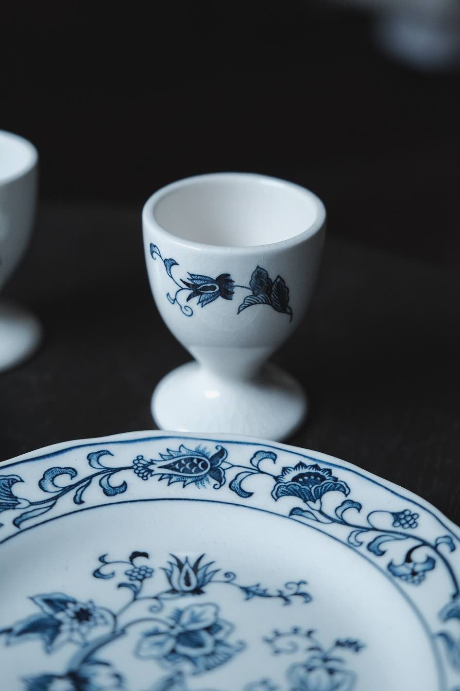 現代餐桌上少見的蛋杯,配以餐碟作為早餐器皿使用,為晨早增添儀式感,東方青花加上西式元素,描金開片