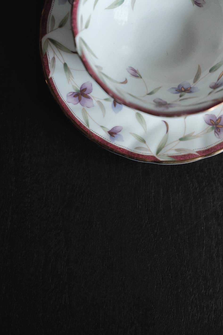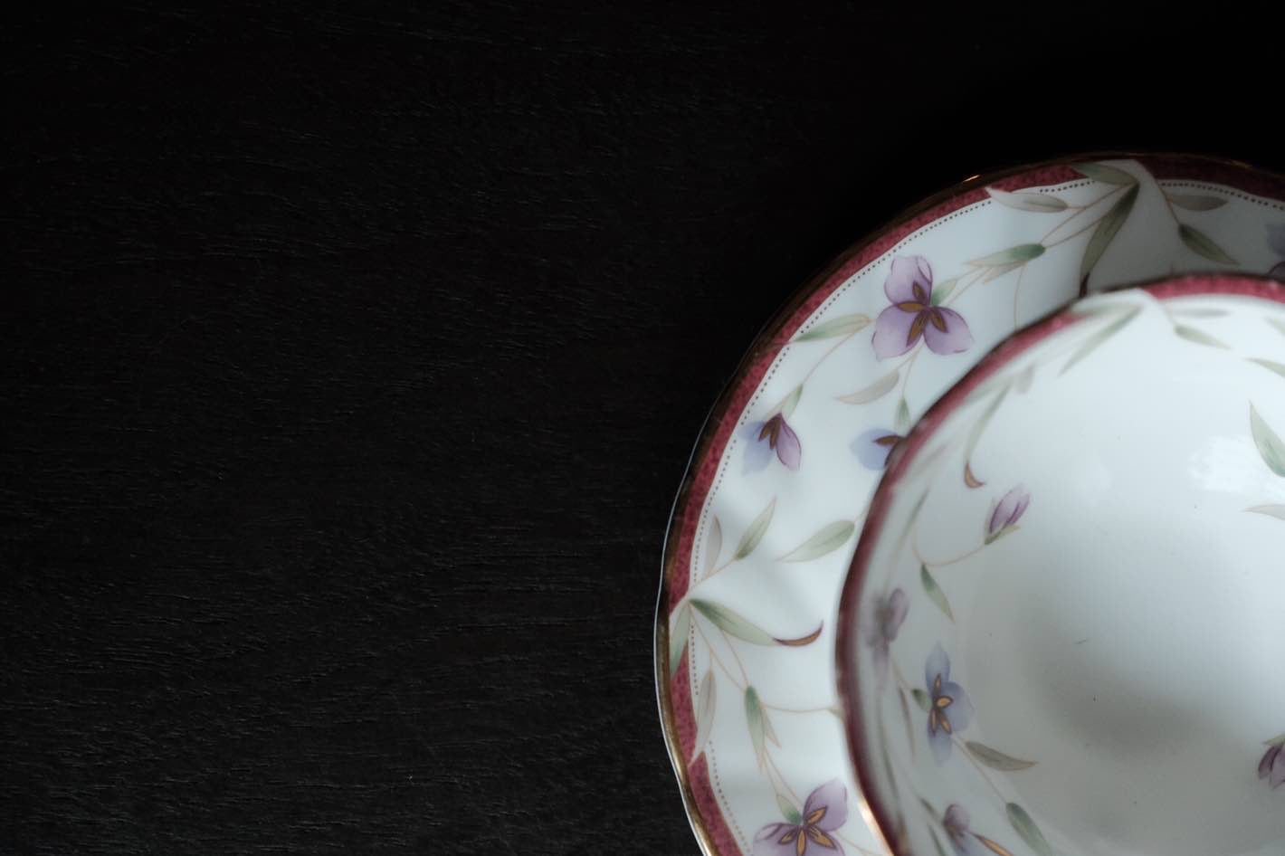 矮身闊杯口,骨瓷類別高級的設計。紫紅色較少見,色感典雅。
