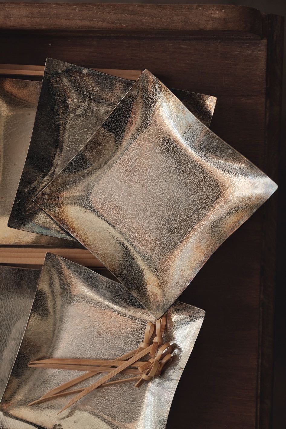 五客碟連竹籤,竹籤形狀可愛,系了一小結。方型盛器,表面有氧化痕跡。