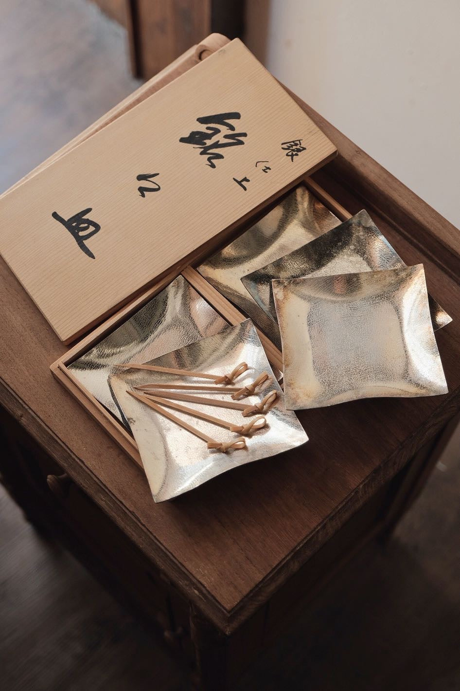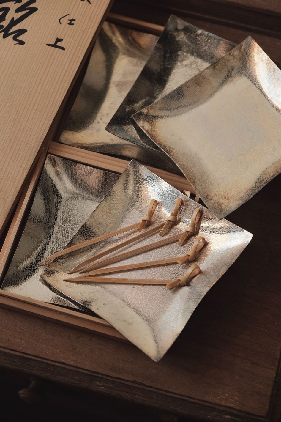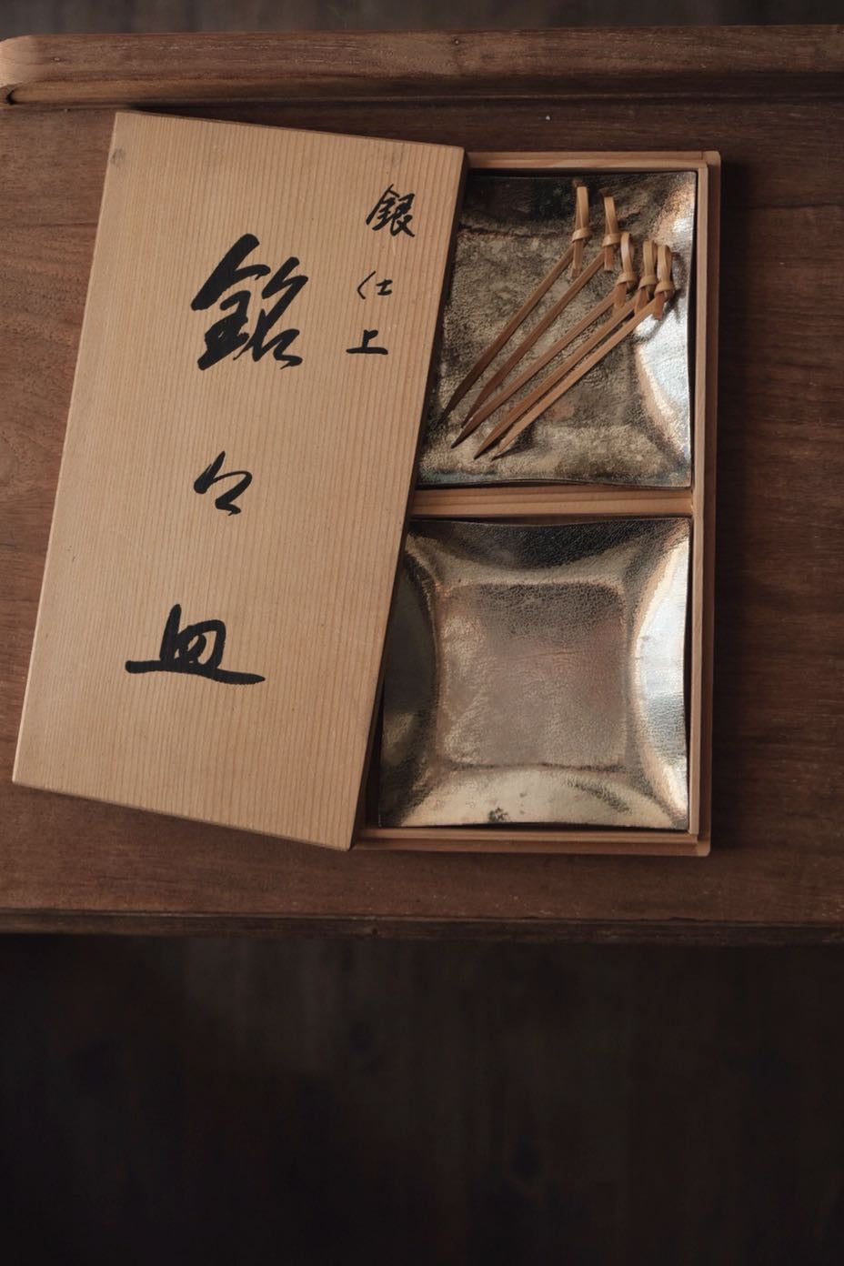 日本銀仕上點心碟竹籤(五客)連原木盒一套