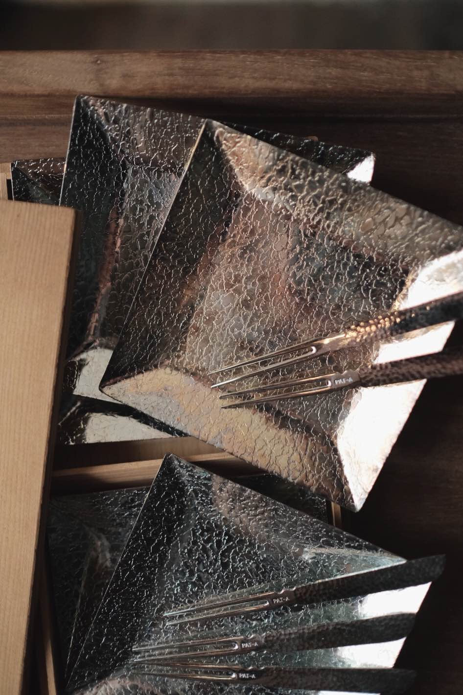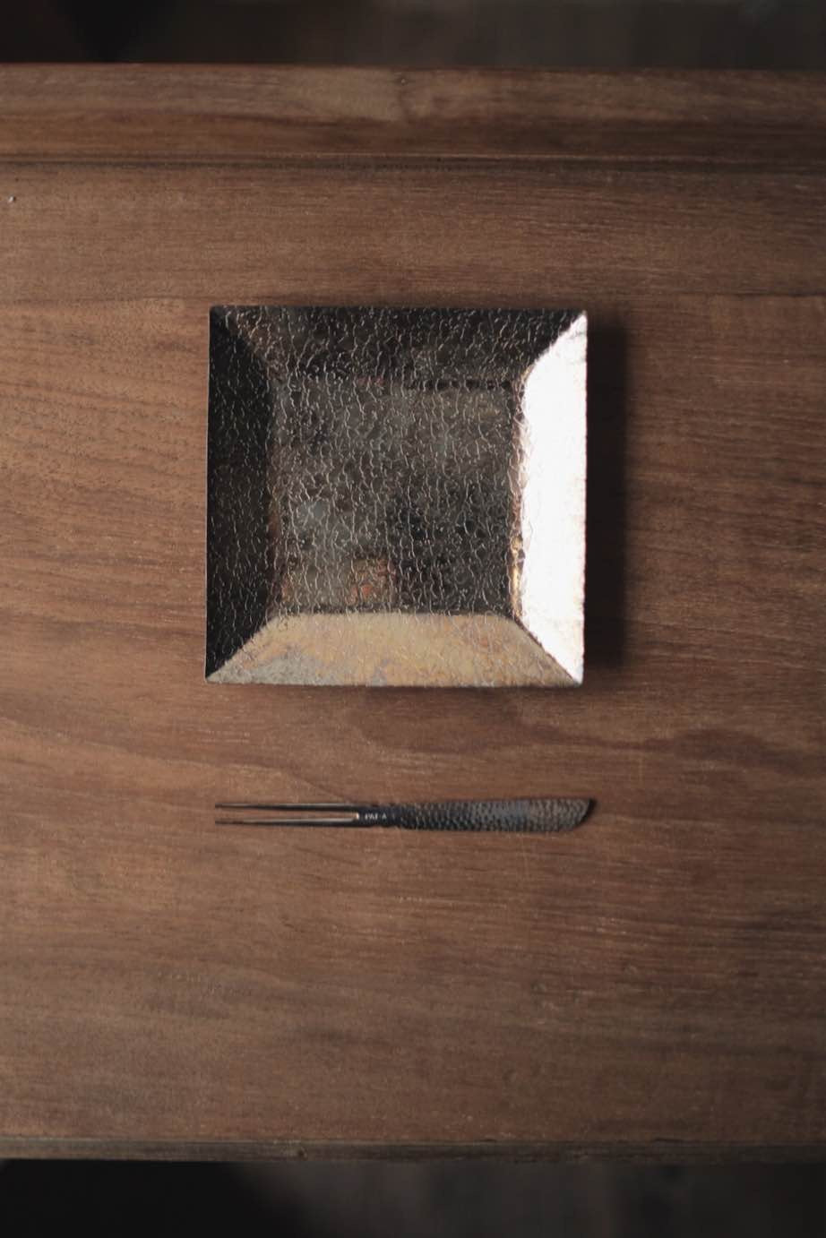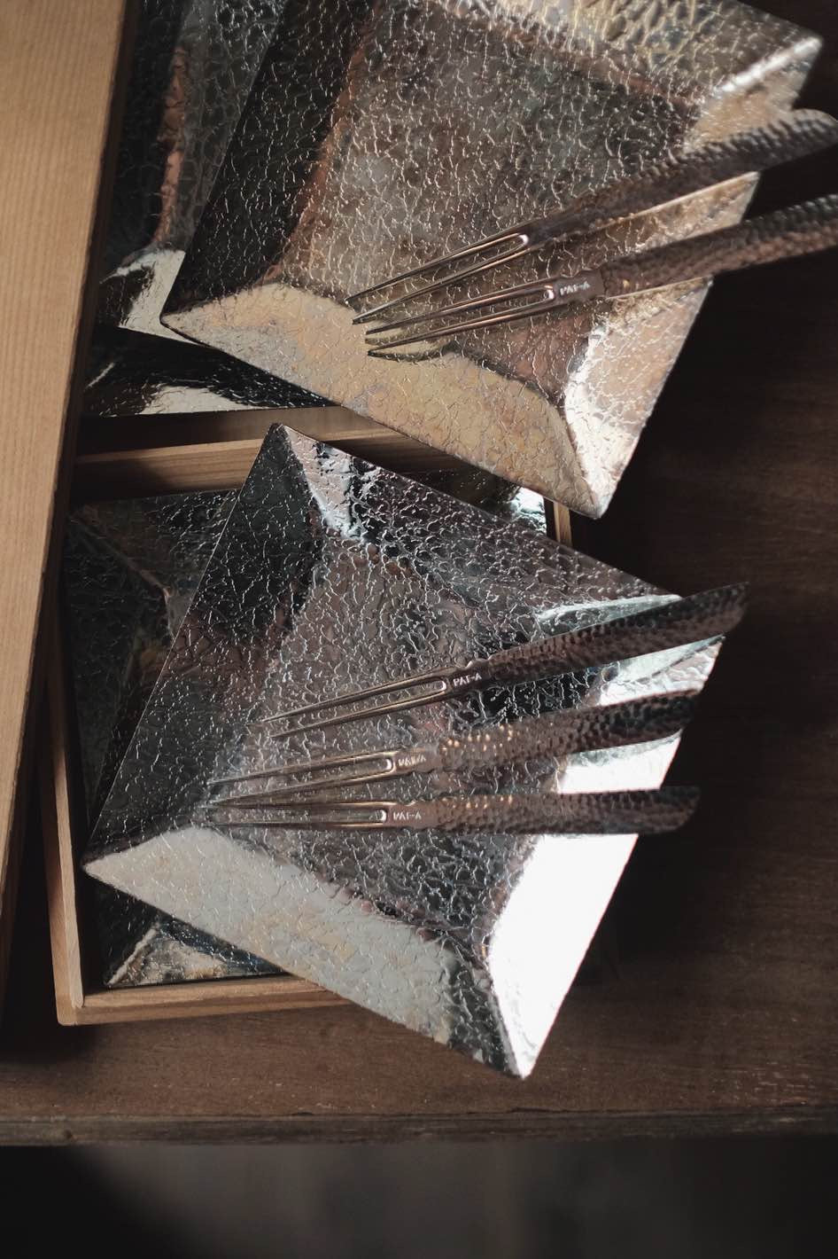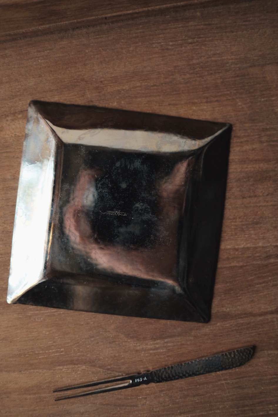 五客碟連叉 叉後為小刀可前幾兩用,適合需要再切細件的點心。方型盛器,表面有氧化痕跡,無傷大雅。