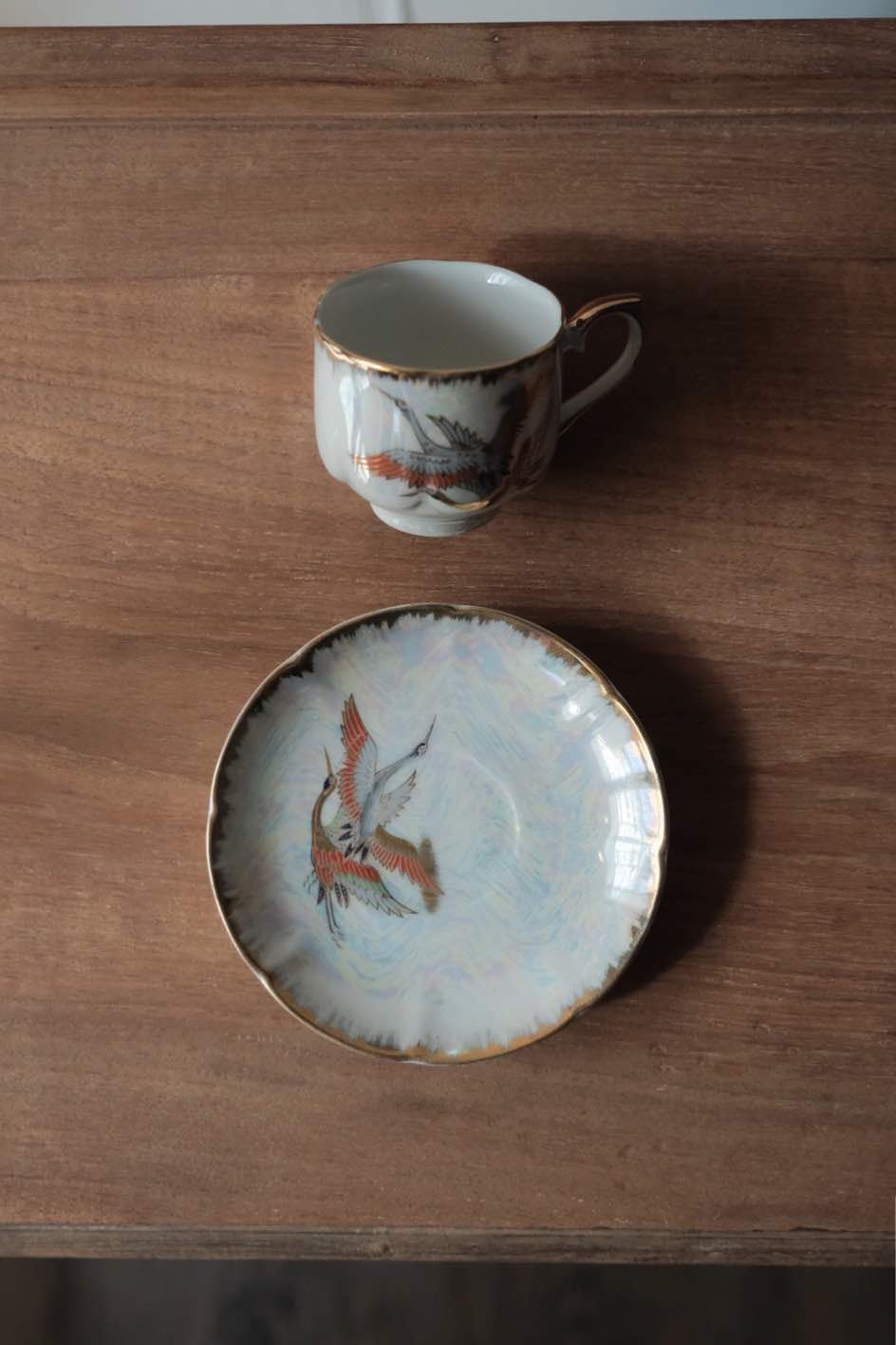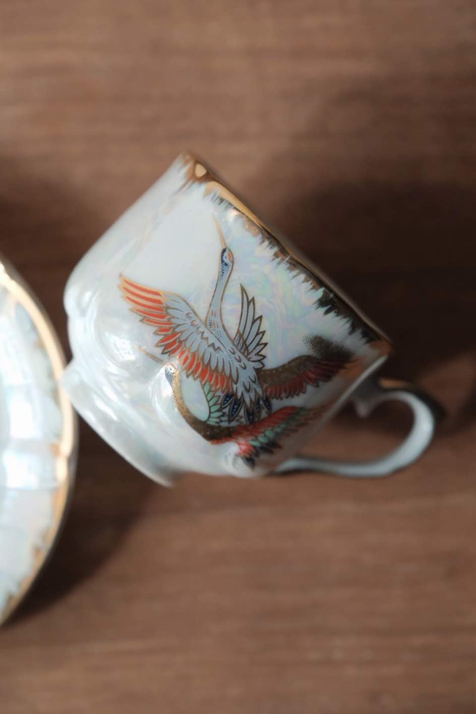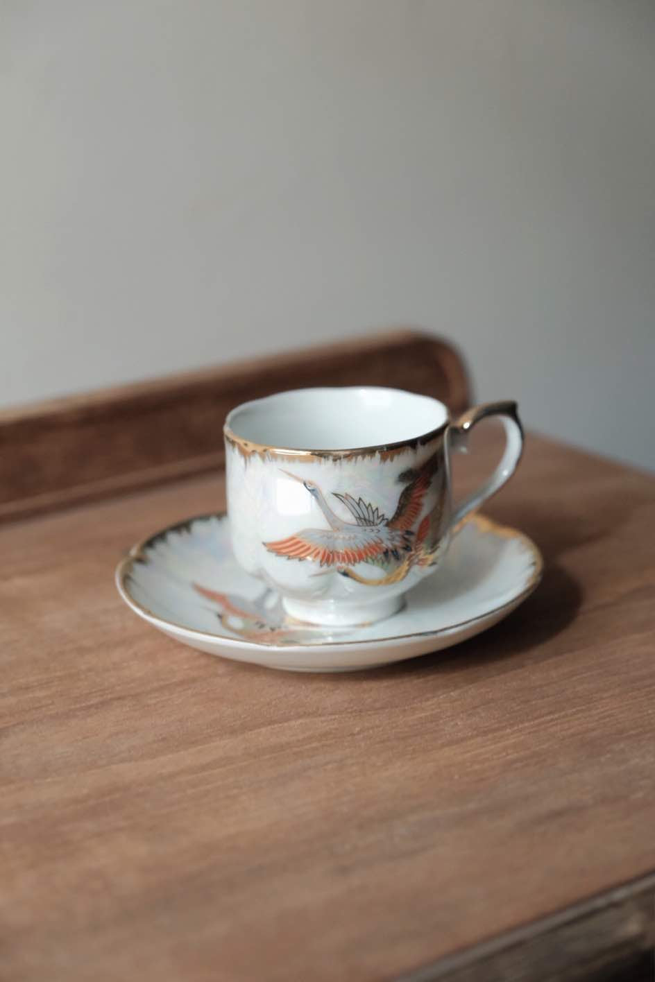 咖啡杯把手及杯口套有精緻描金,杯身碟身皆有日本丹頂鶴花。