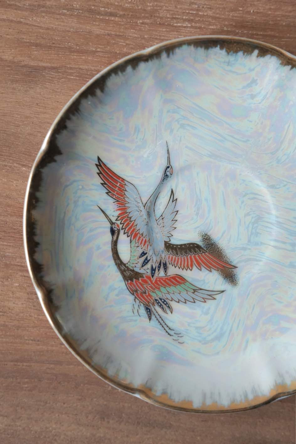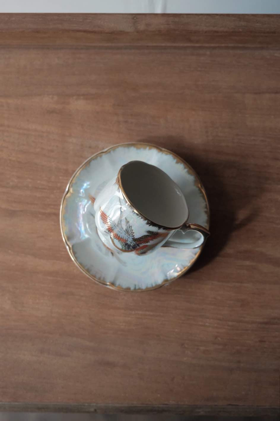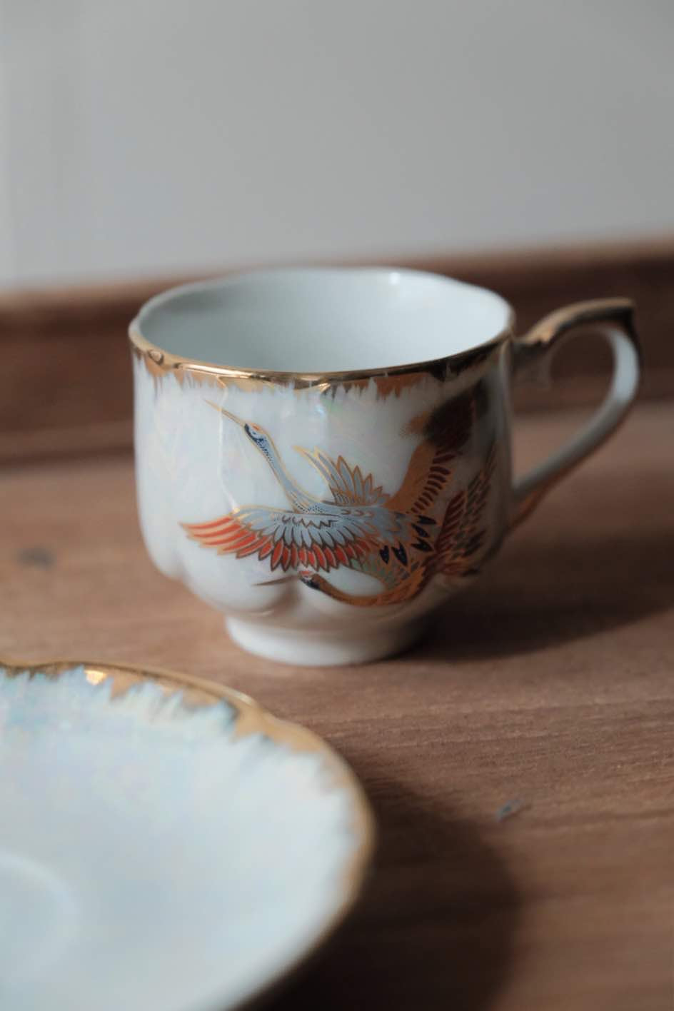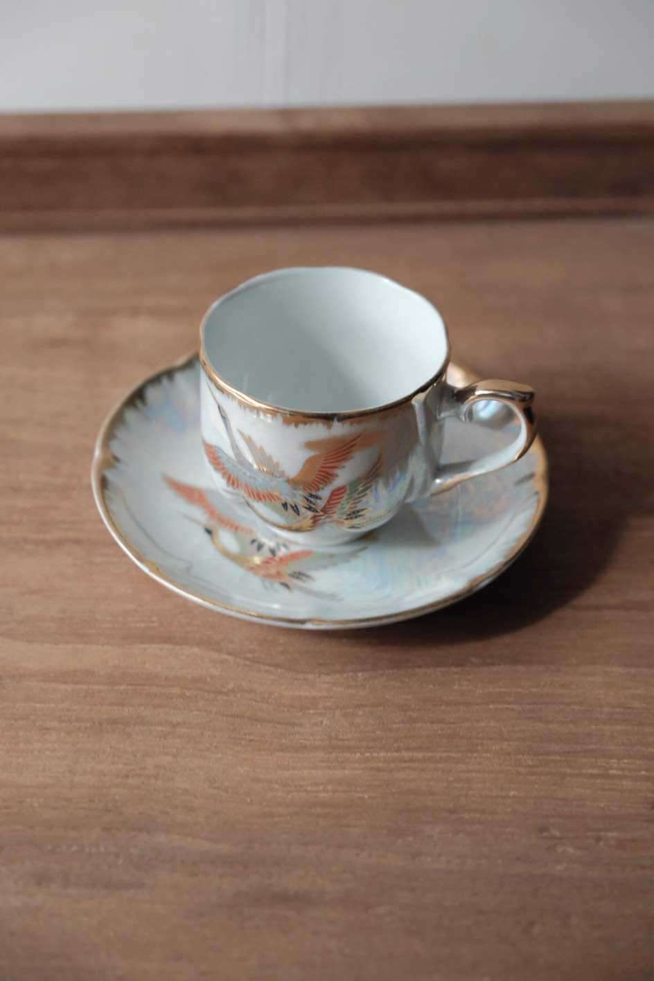 咖啡杯把手及杯口套有精緻描金,杯身碟身皆有日本丹頂鶴花。