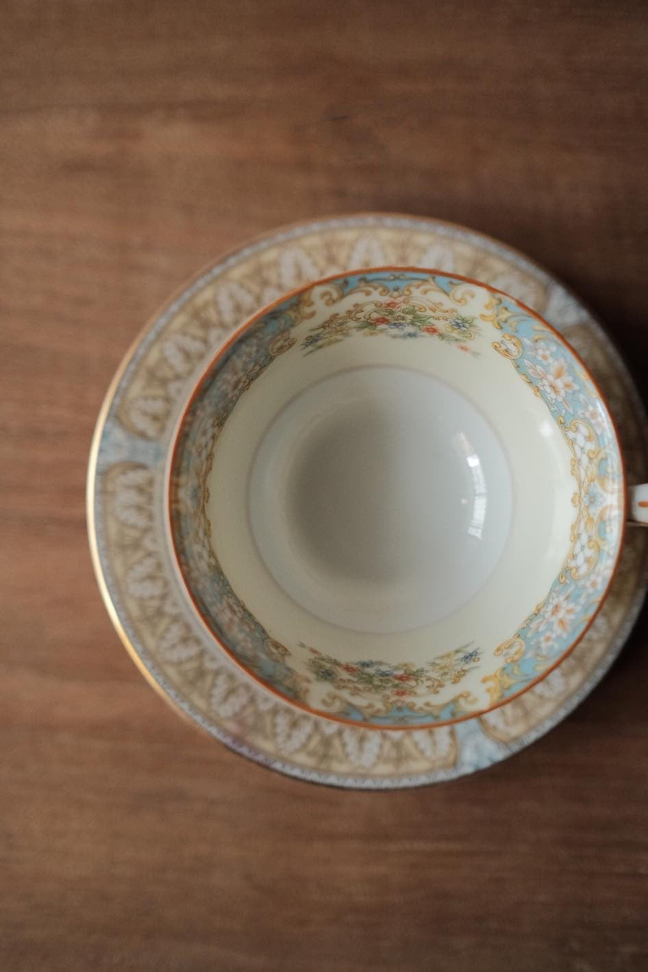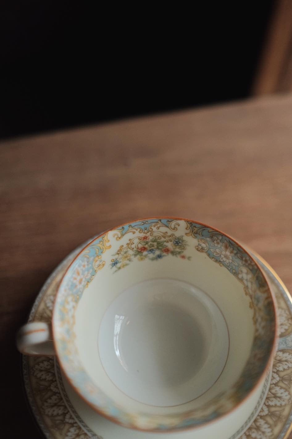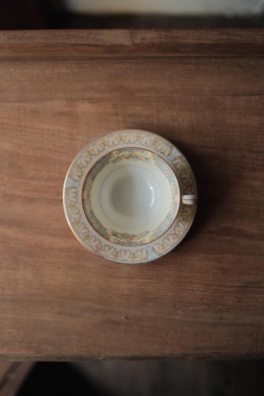 洋風花紋加上描金邊,淺藍配暖咖啡色,低調溫柔的典雅。