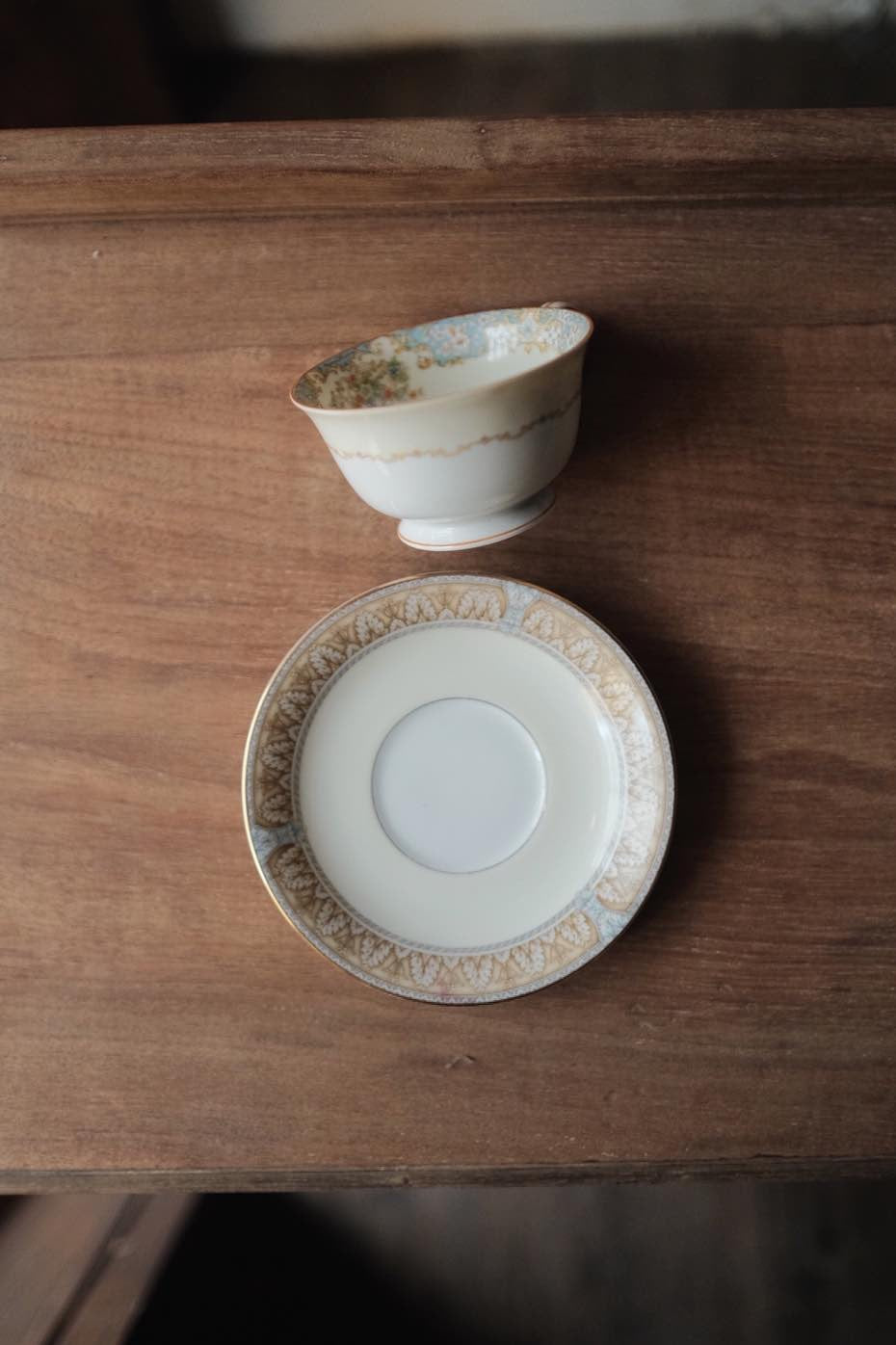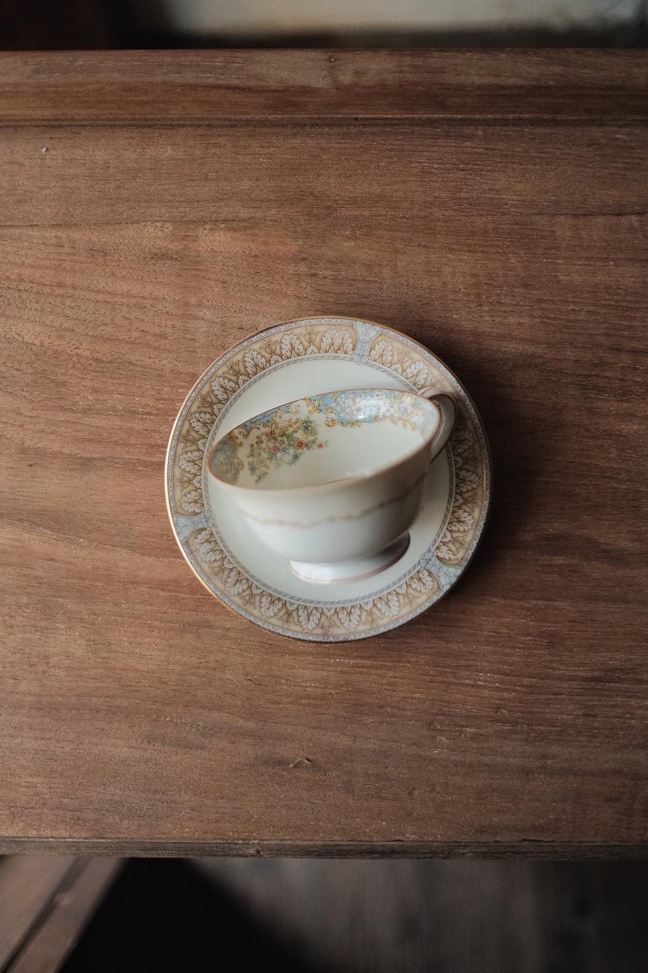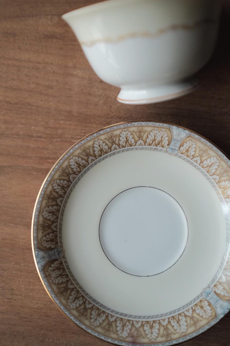 洋風花紋加上描金邊,淺藍配暖咖啡色,低調溫柔的典雅。