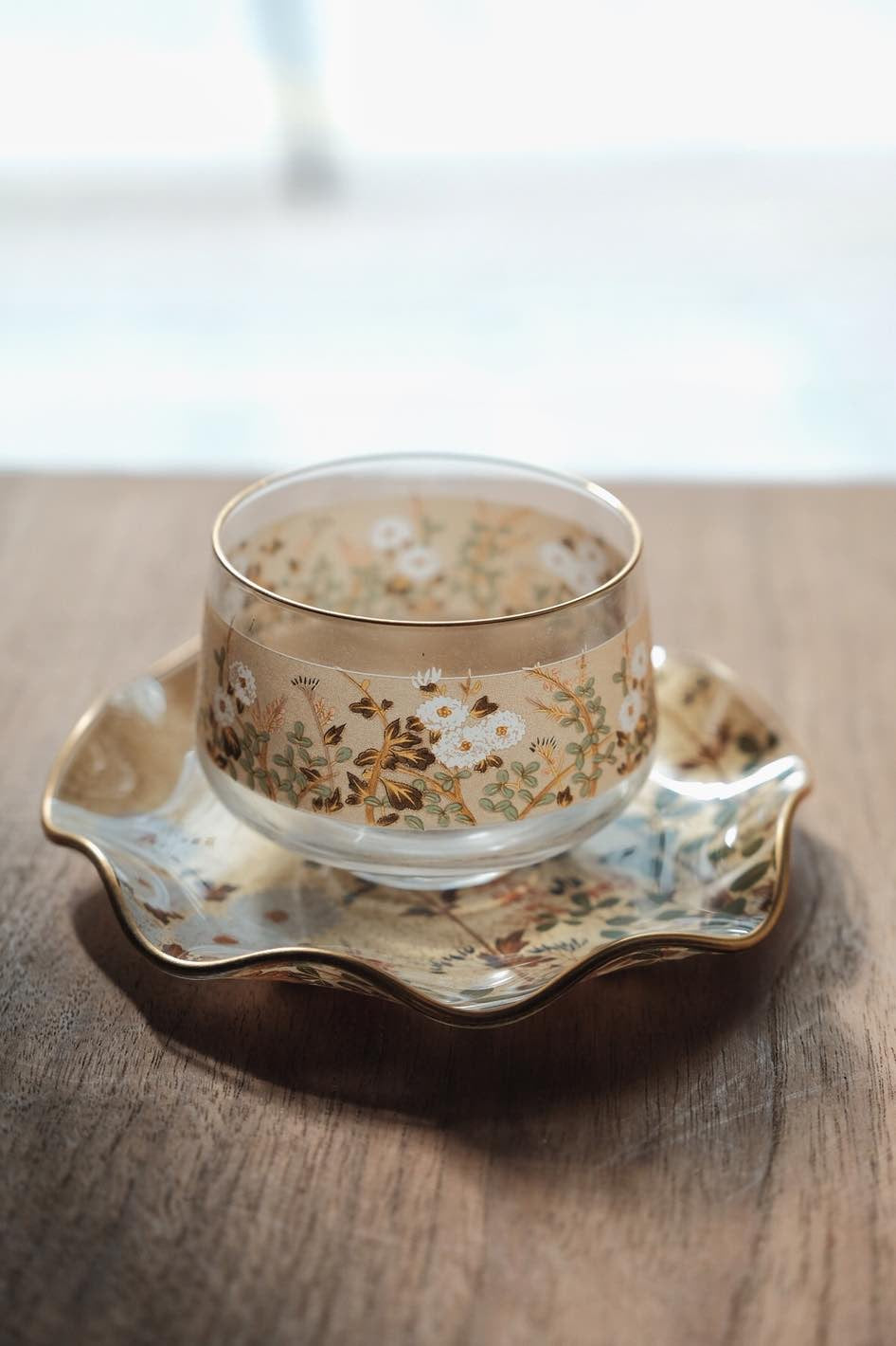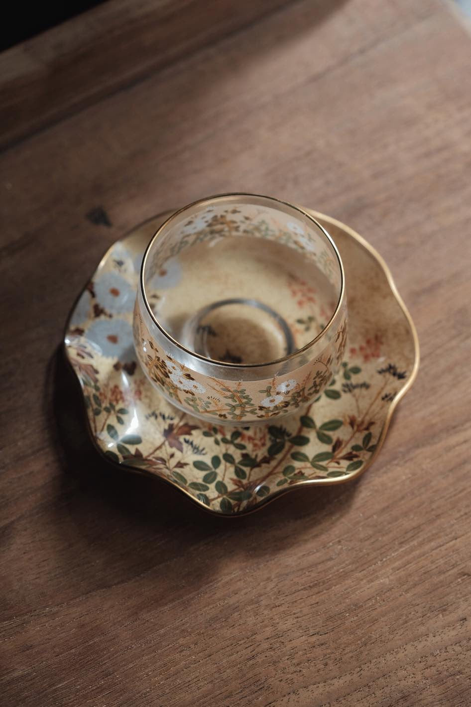 描金玻璃杯玻璃碟透光有質感,四季花鳥圖金箔底,