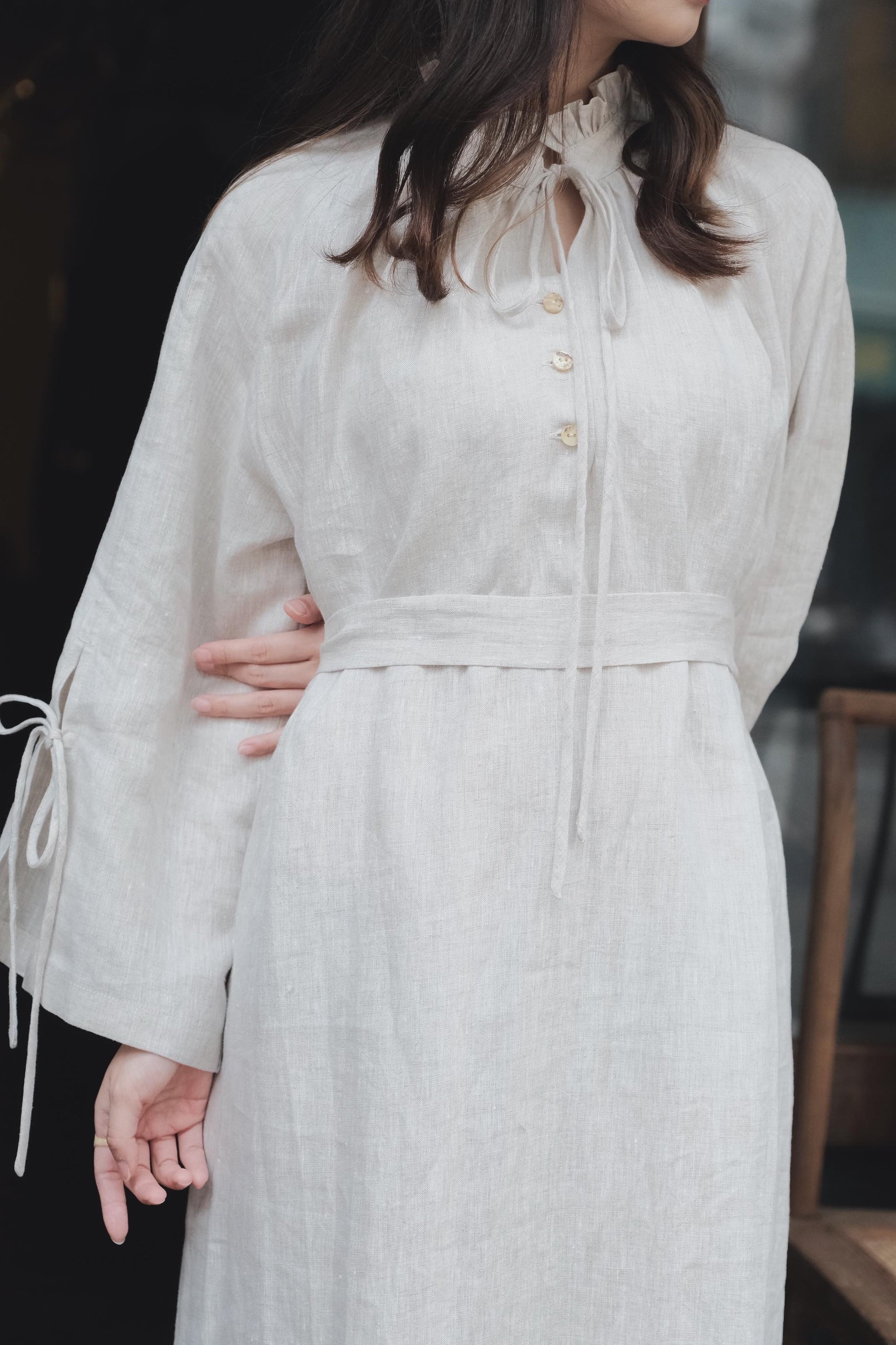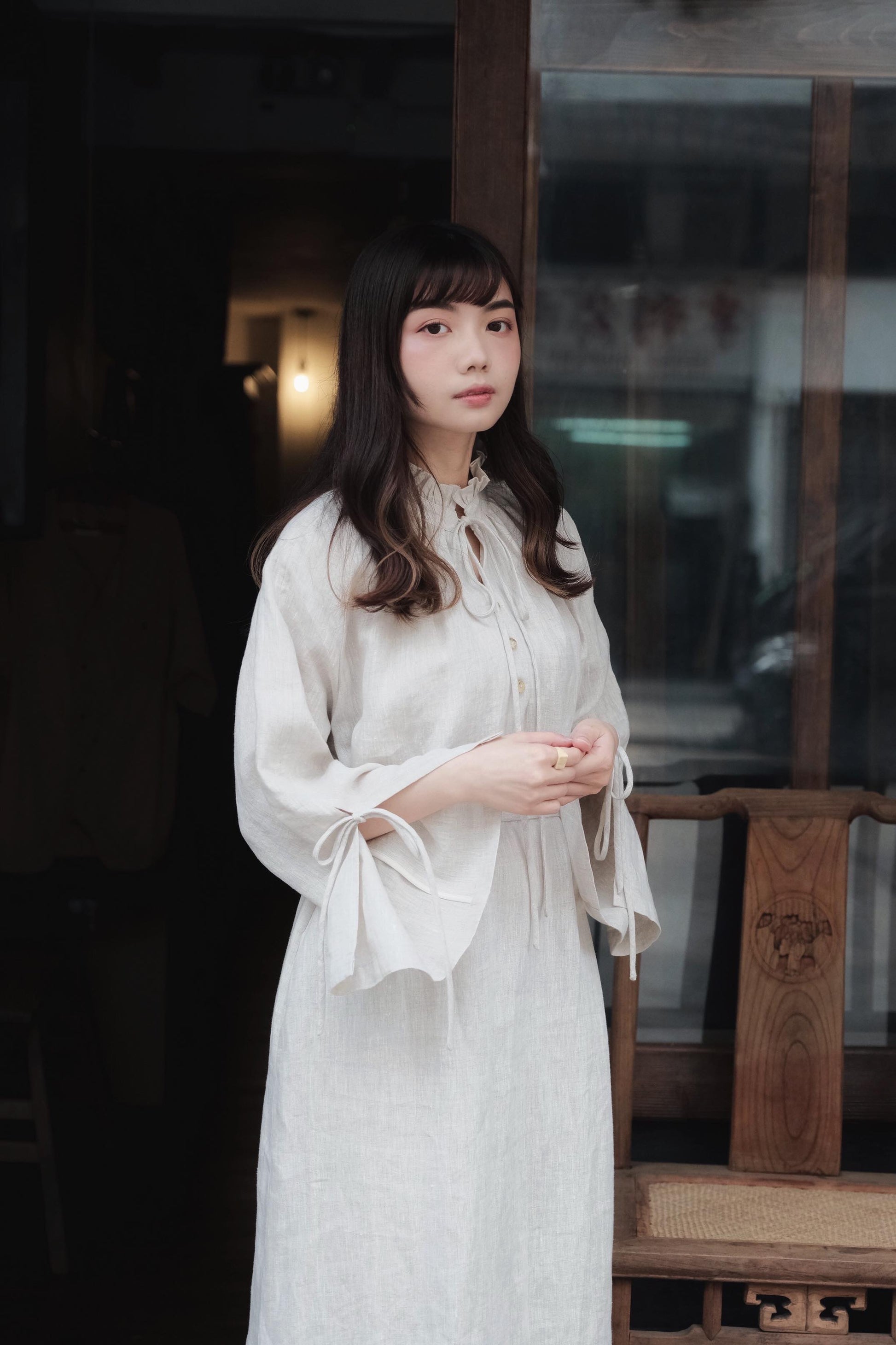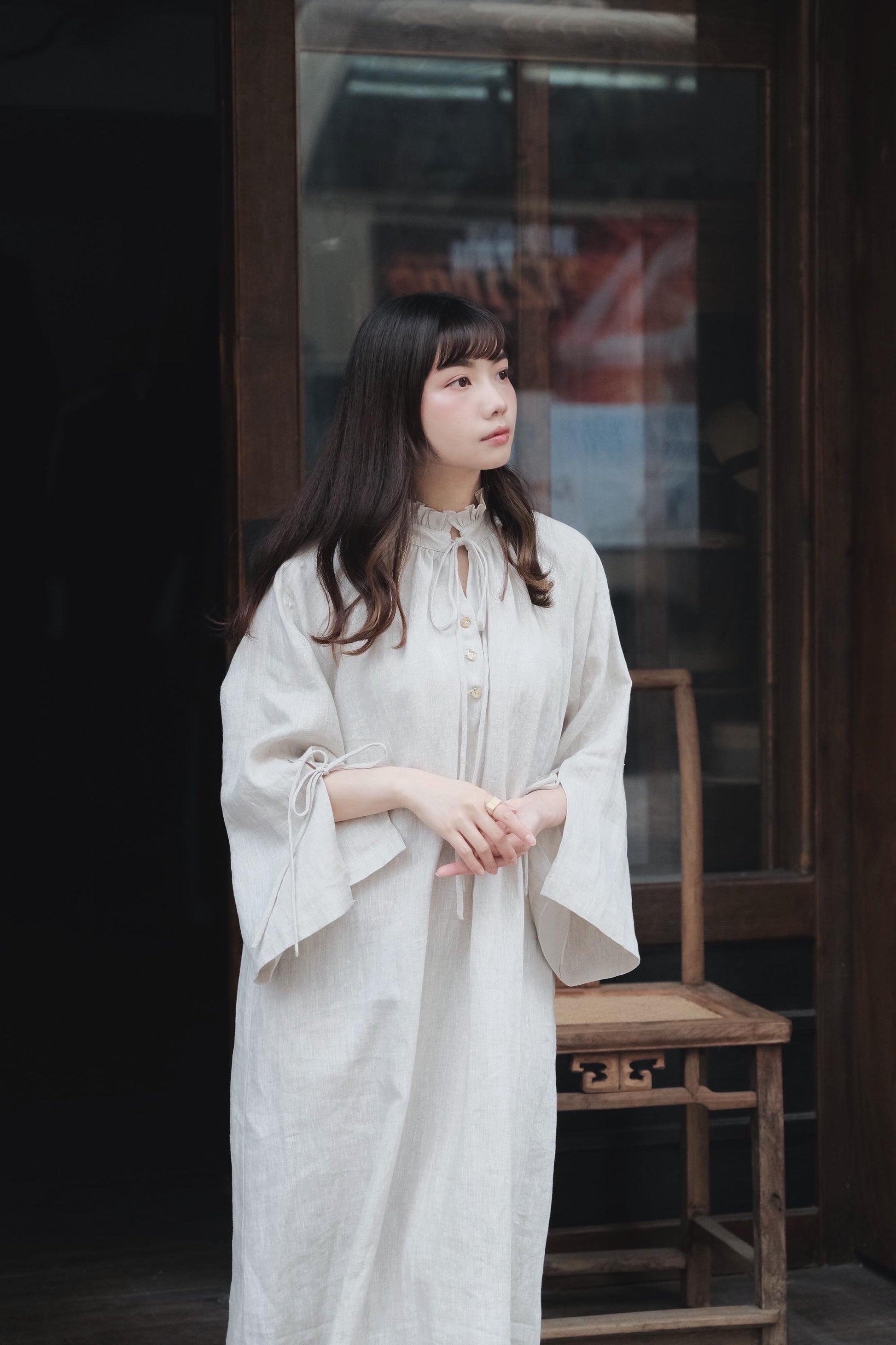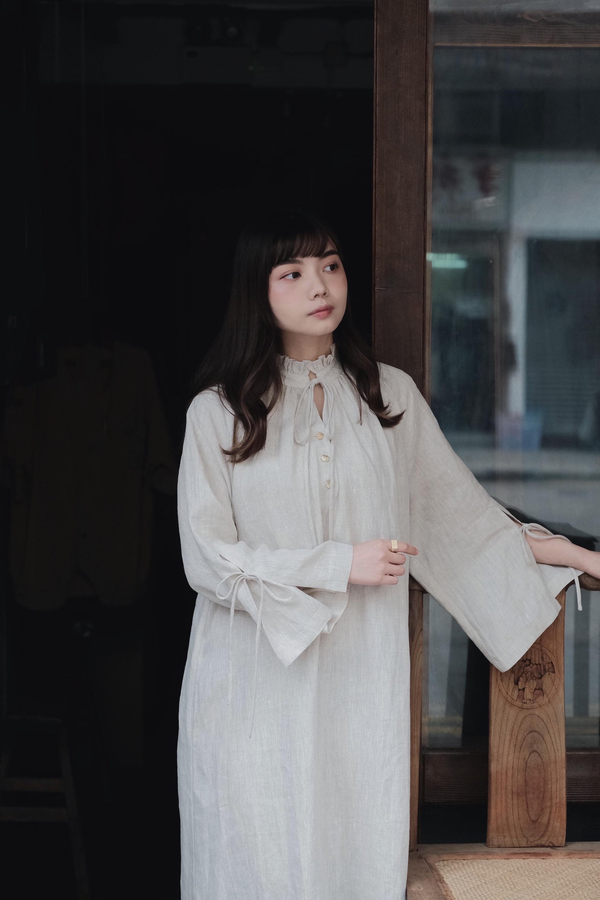 款為簡化十九世紀教堂罩衣設計,領有碎摺綁帶,袖口破開綁帶,裙左右側開微叉,單穿連衣裙或配作罩衣著用皆可。