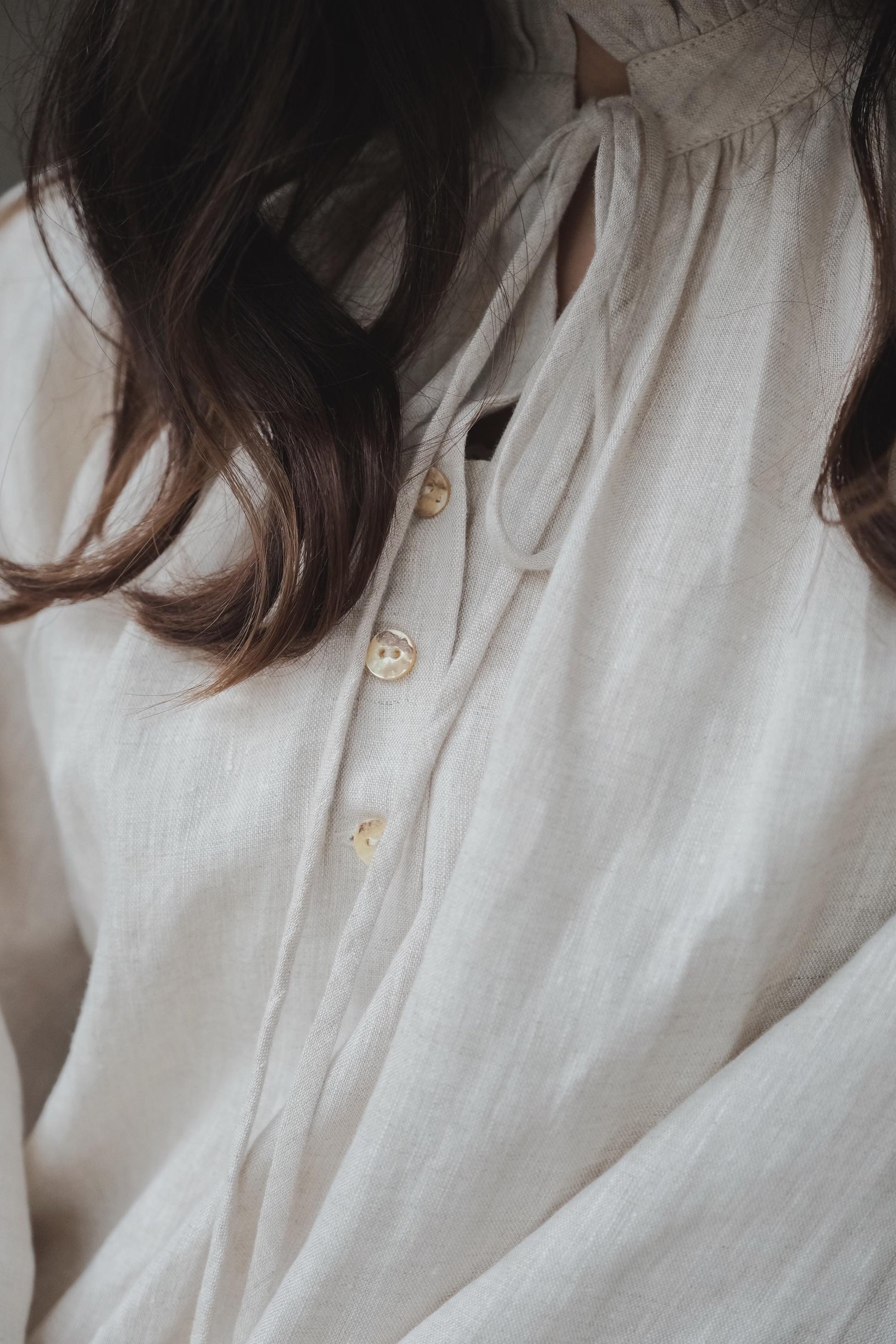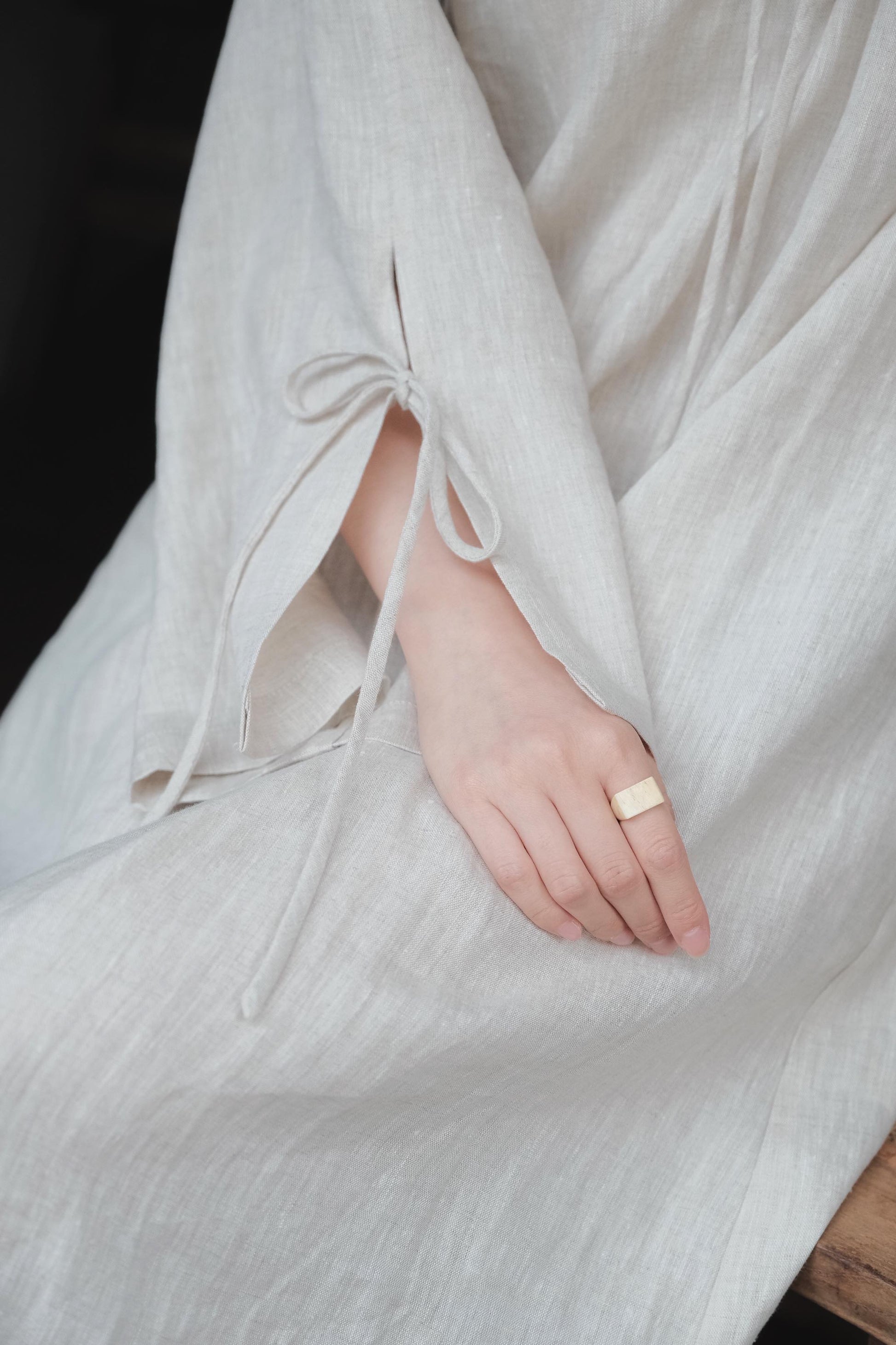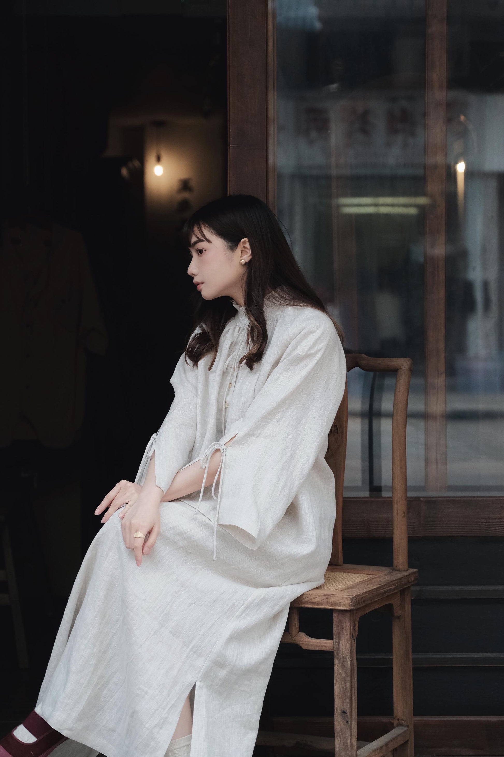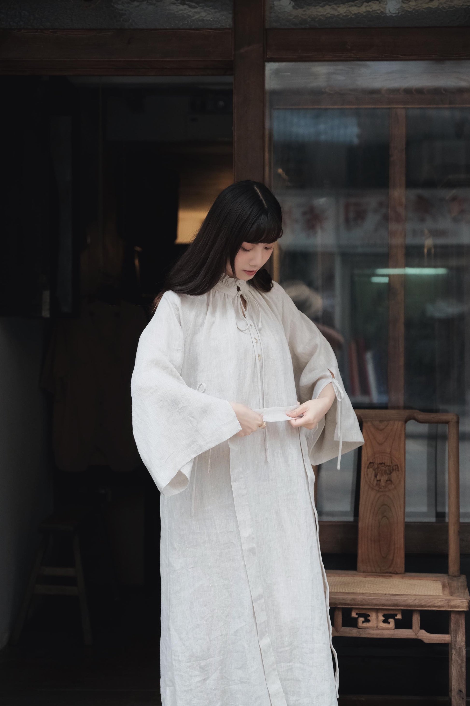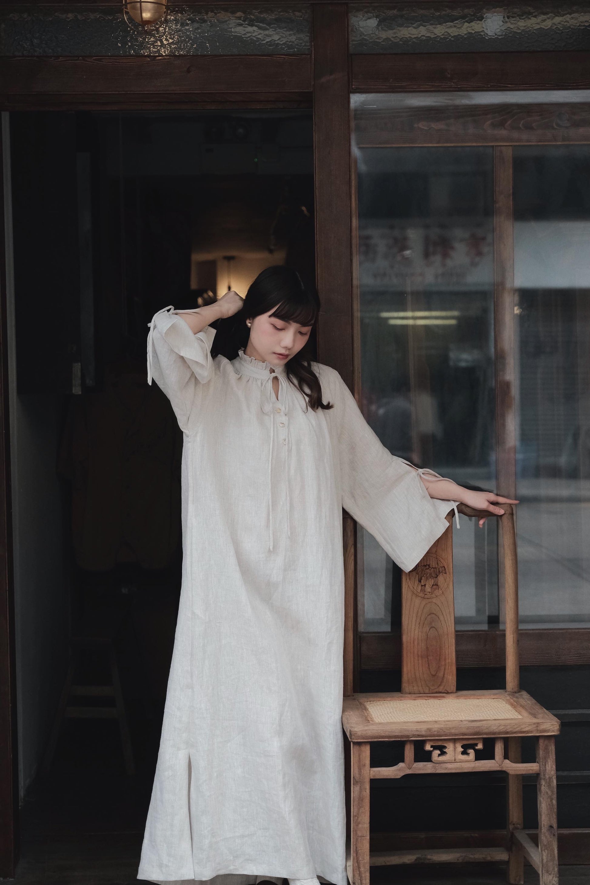 款為簡化十九世紀教堂罩衣設計,領有碎摺綁帶,袖口破開綁帶,裙左右側開微叉,單穿連衣裙或配作罩衣著用皆可。