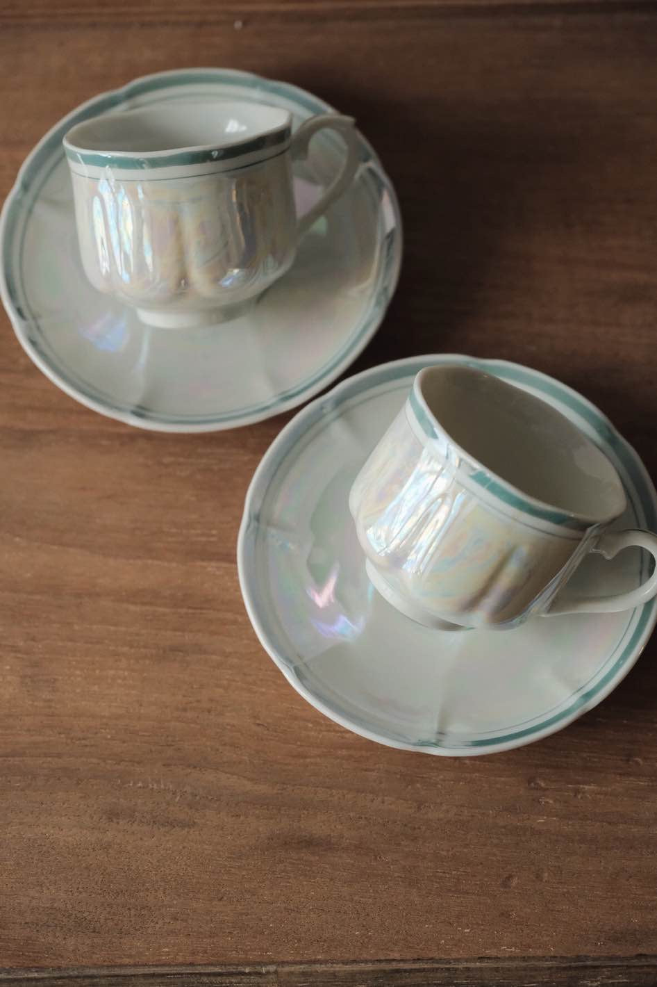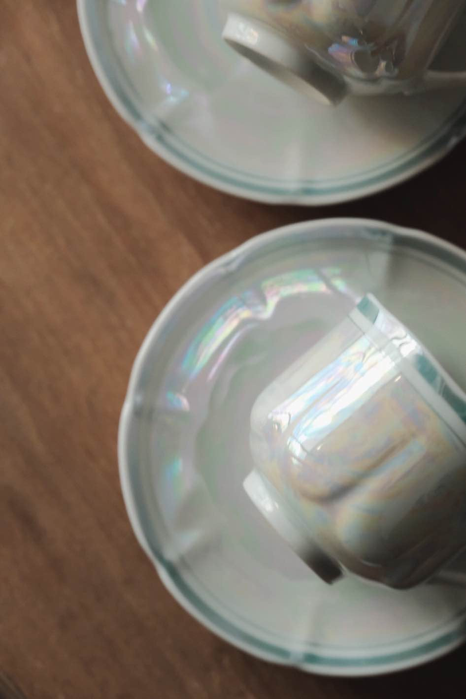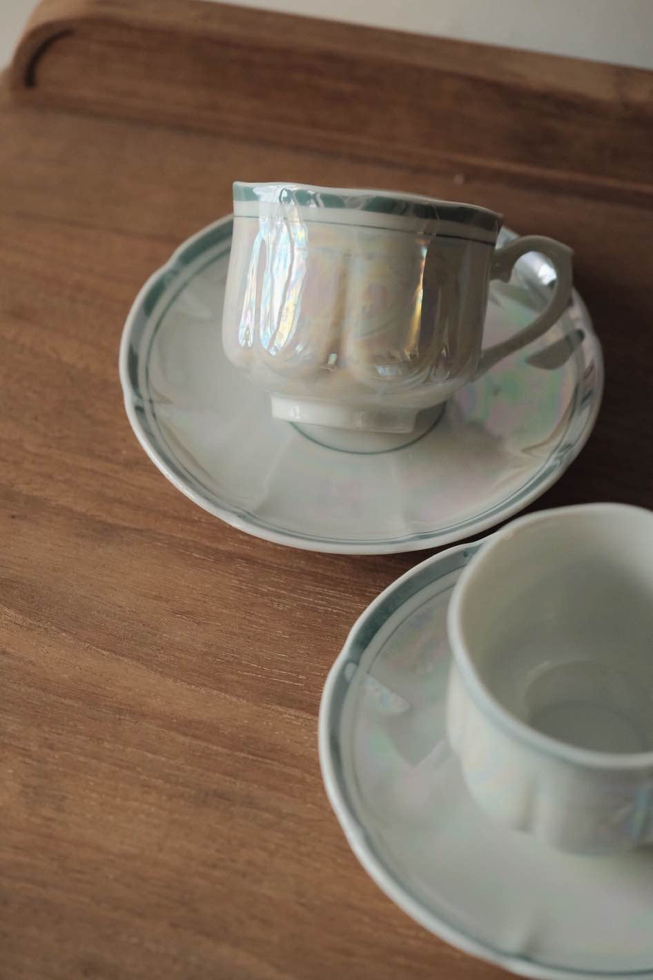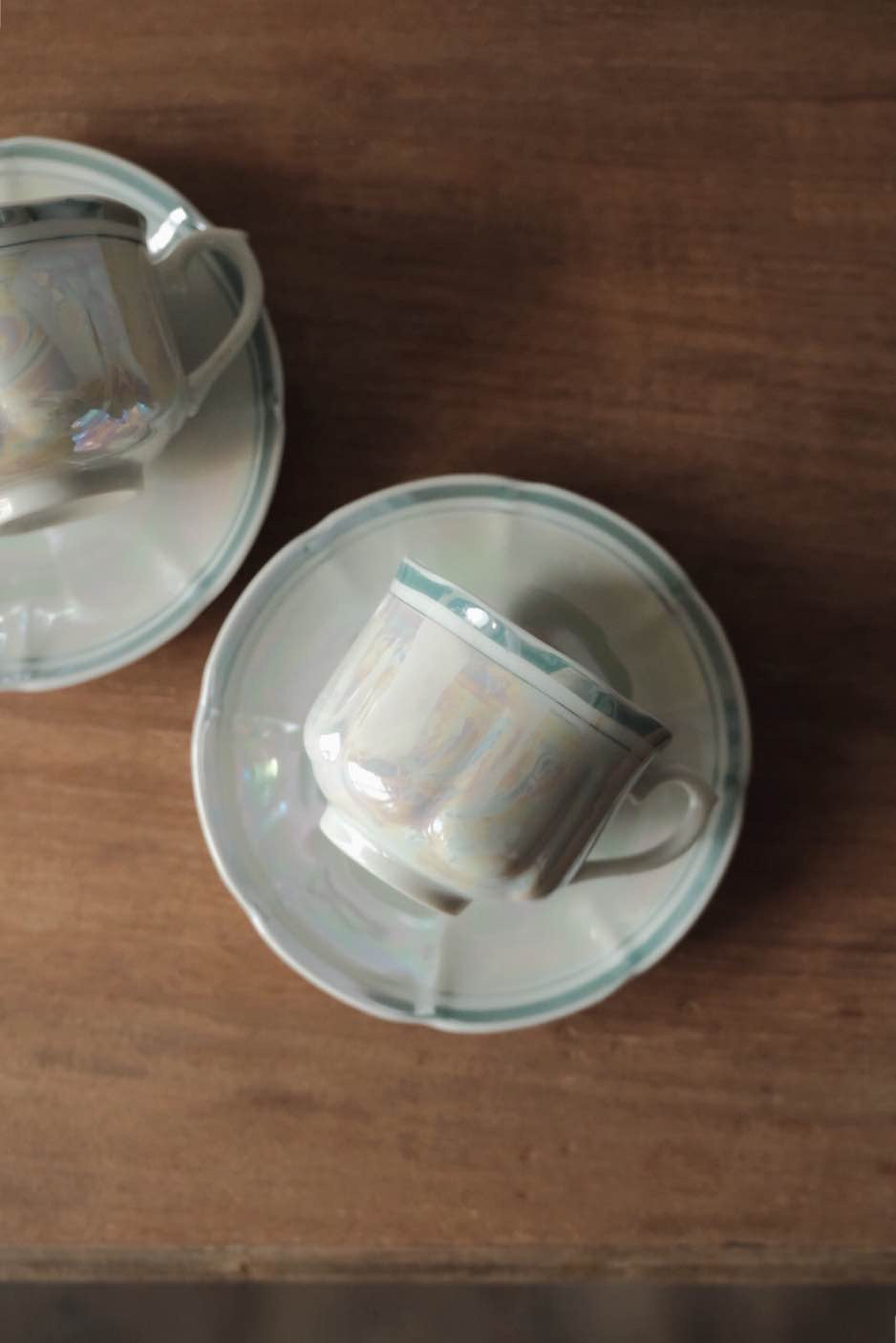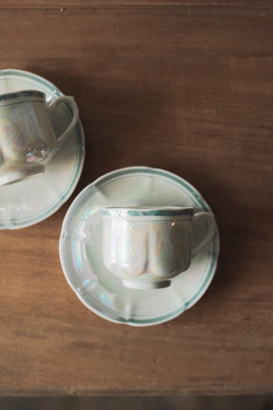 湖水綠簡約條紋帶出優雅美感,花瓣般形狀的浮雕杯身碟身,光線照射呈現的七彩珍珠色落為簡潔配色呈現高貴感。