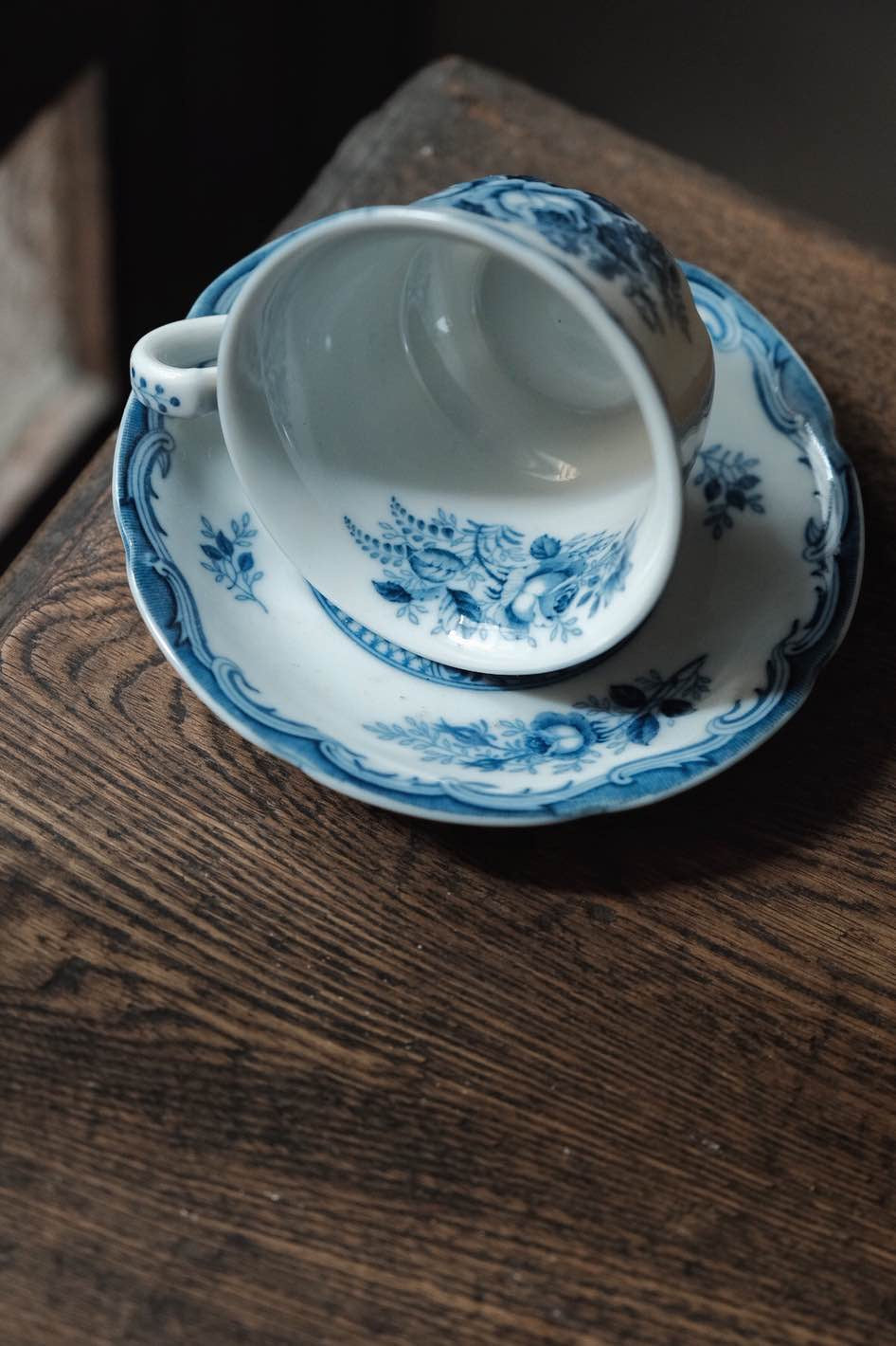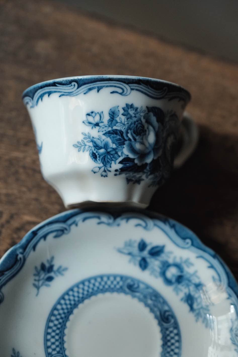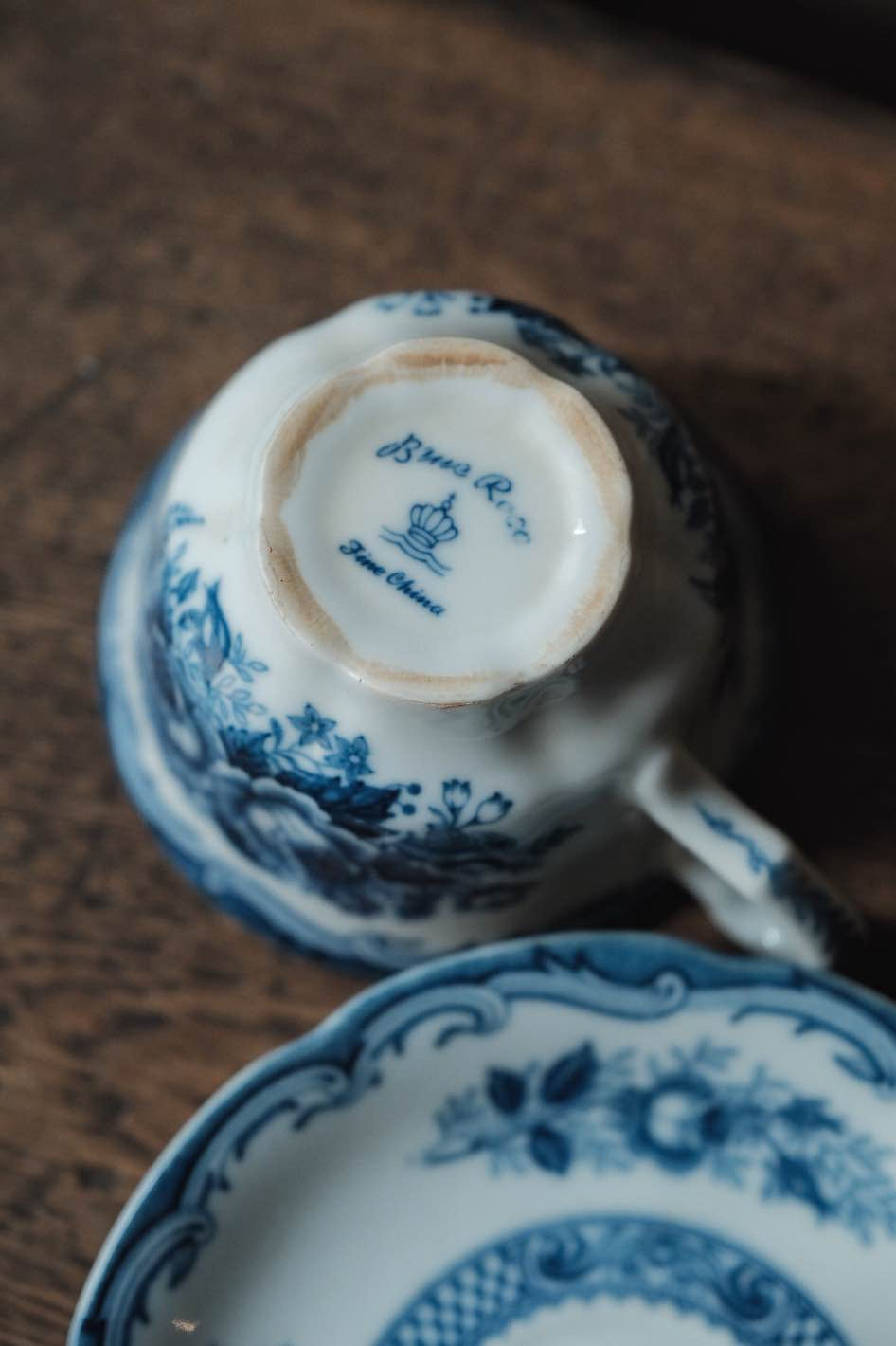 以東方青花為調,西方玫瑰花小麥作形,中底收束花型,瓷質牙白細瓷,杯底有施釉,整體古感完整