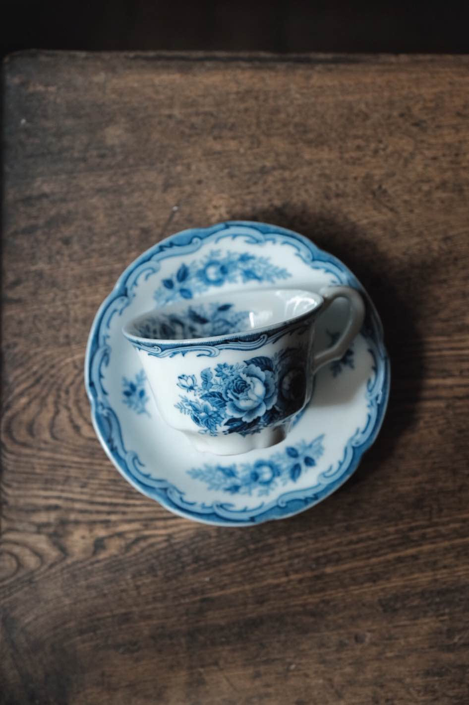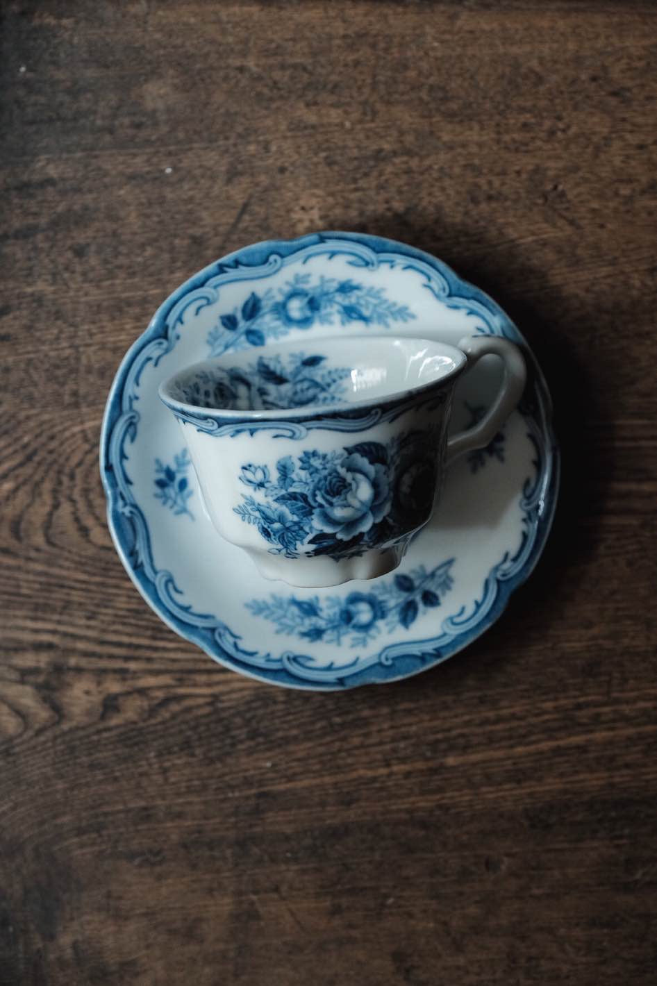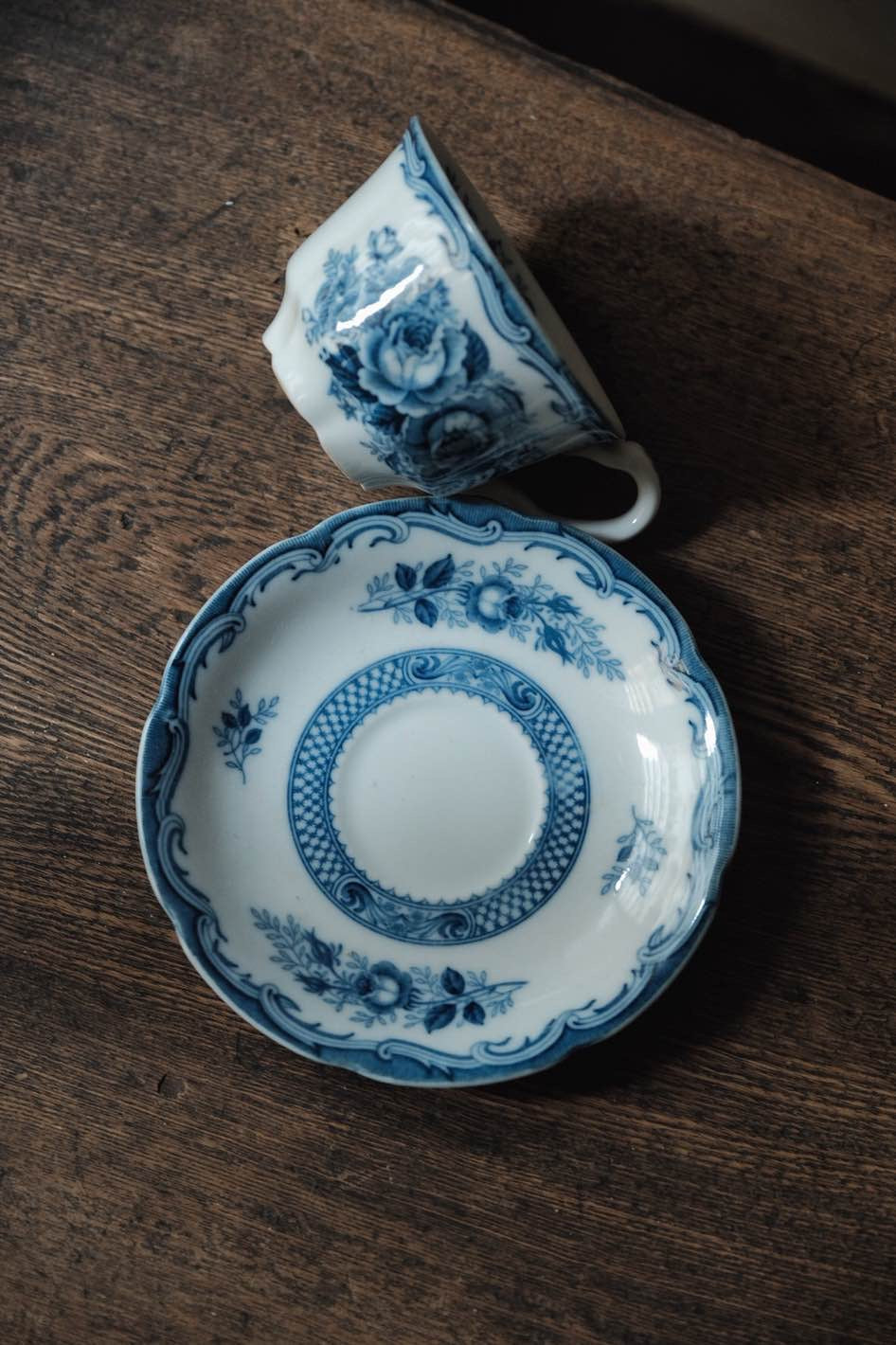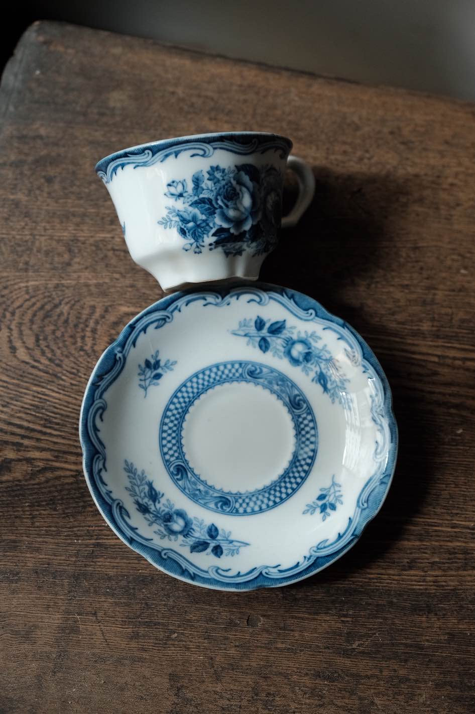 以東方青花為調,西方玫瑰花小麥作形,中底收束花型,瓷質牙白細瓷,杯底有施釉,整體古感完整