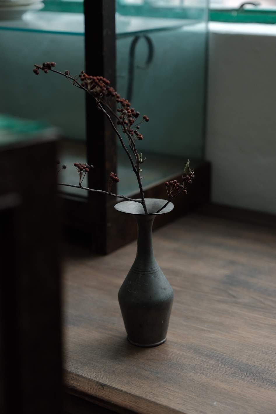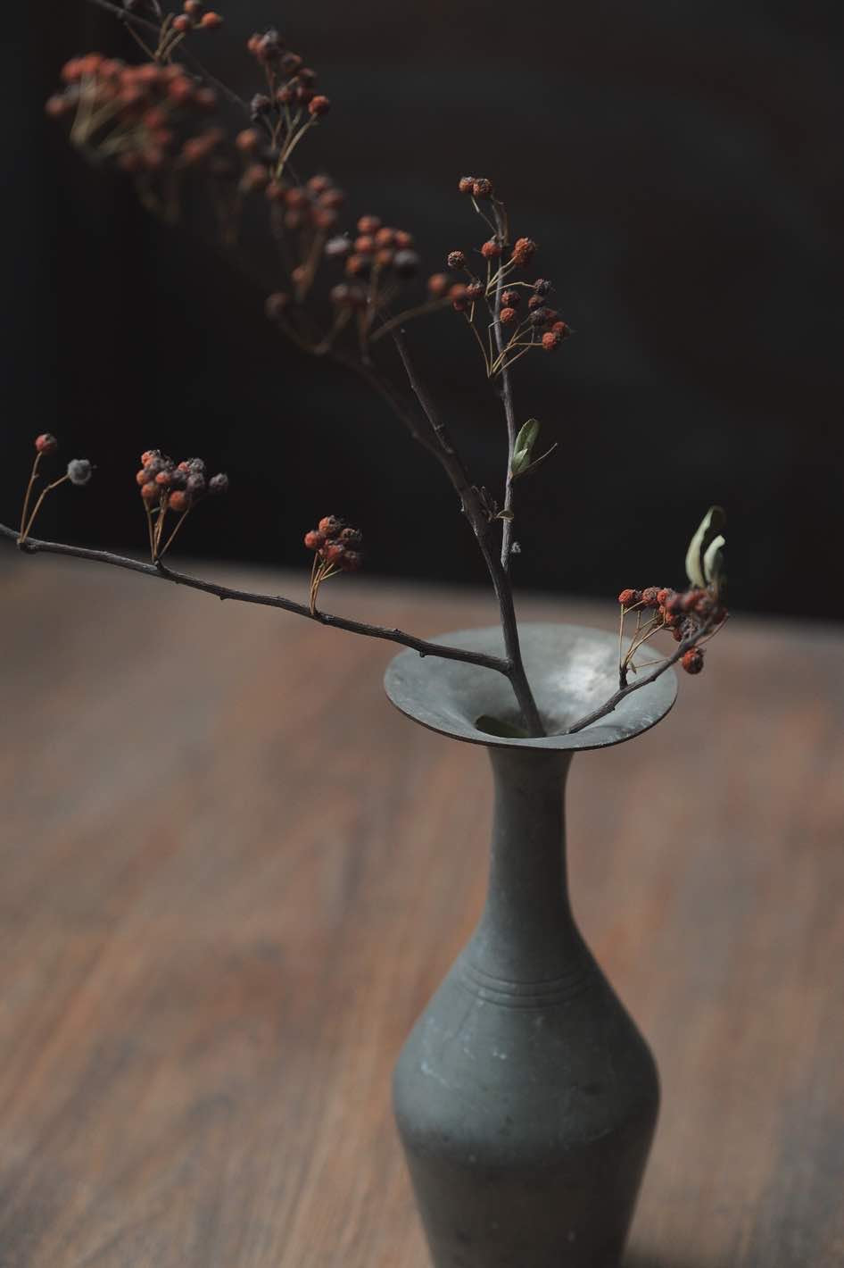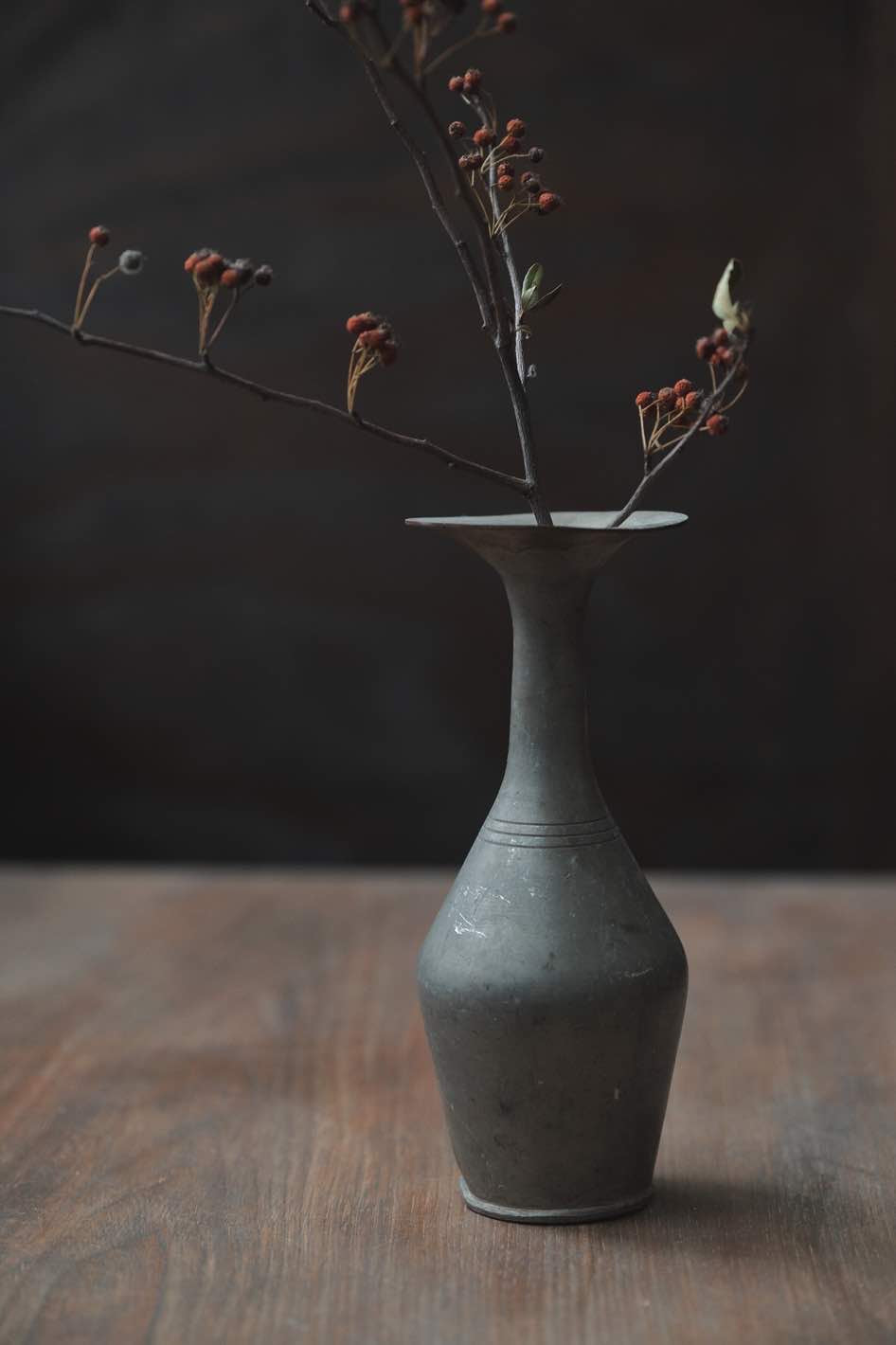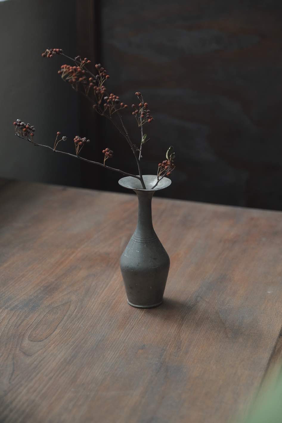 配搭單支紅花,錫金屬氧化後的成色古樸有層次,非常適合用作餐枱上的裝飾花瓶。