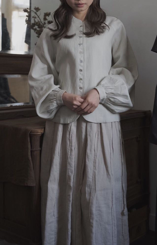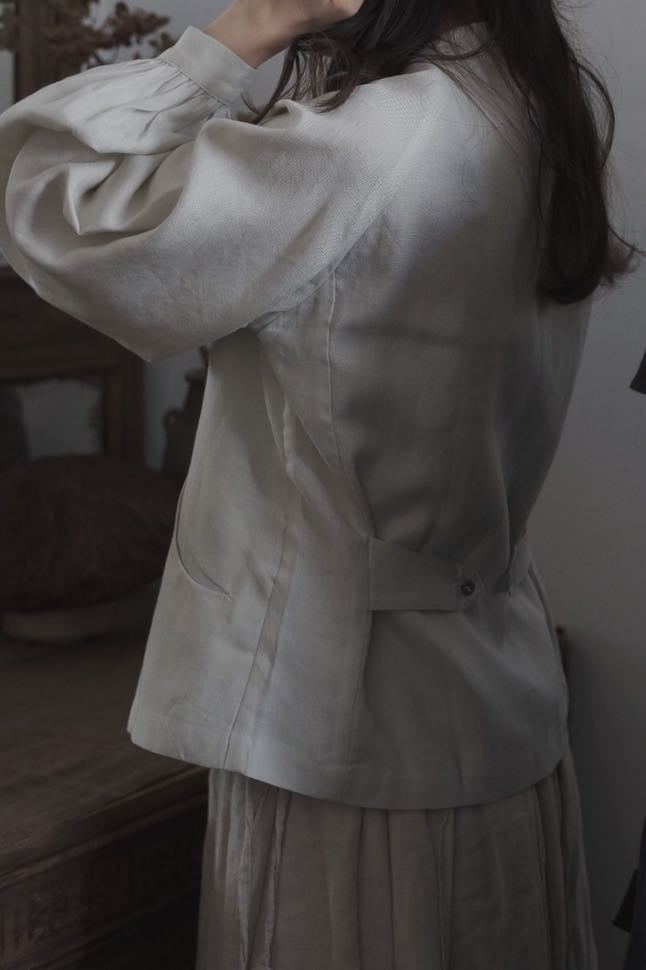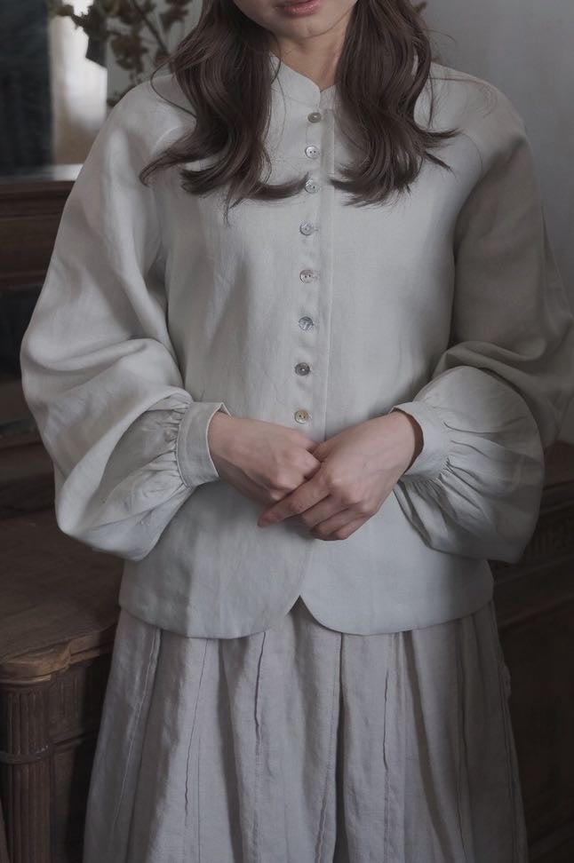 設計源自法國中世紀男恤衫 泡袖插肩 袖口有兩扣作調節 後腰有腰扣 可順腰或修腰出腰線
