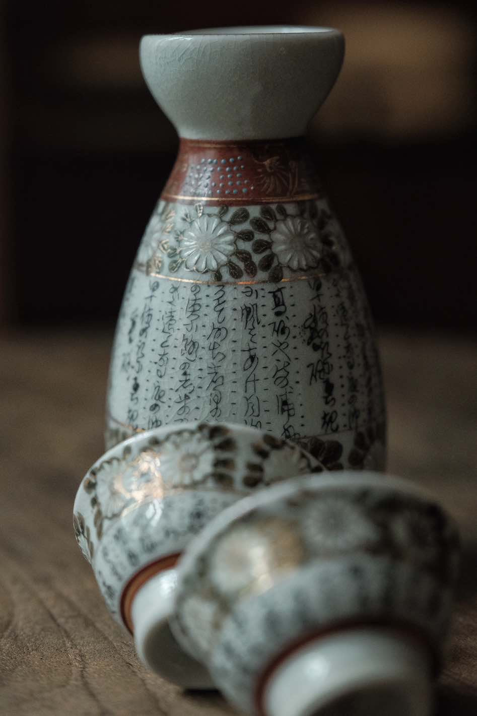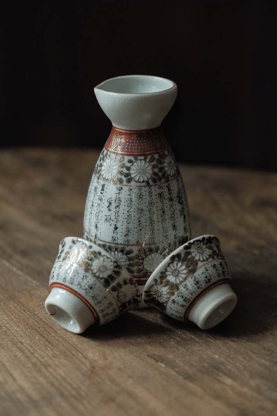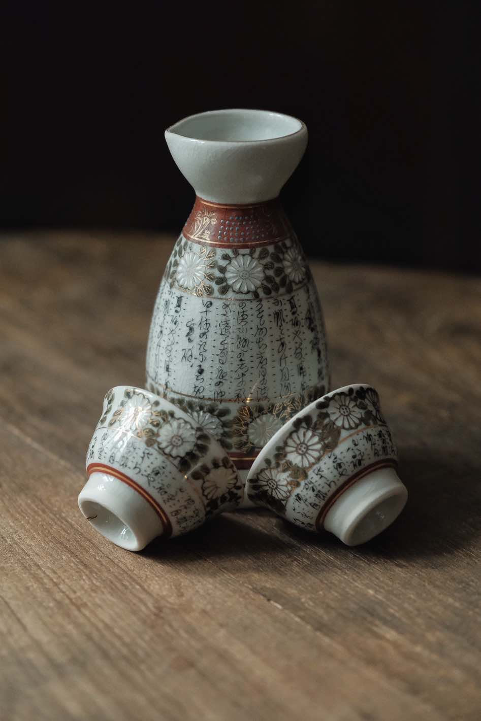 日本製·日本九谷燒手寫詩文赤繪清酒杯連酒瓶