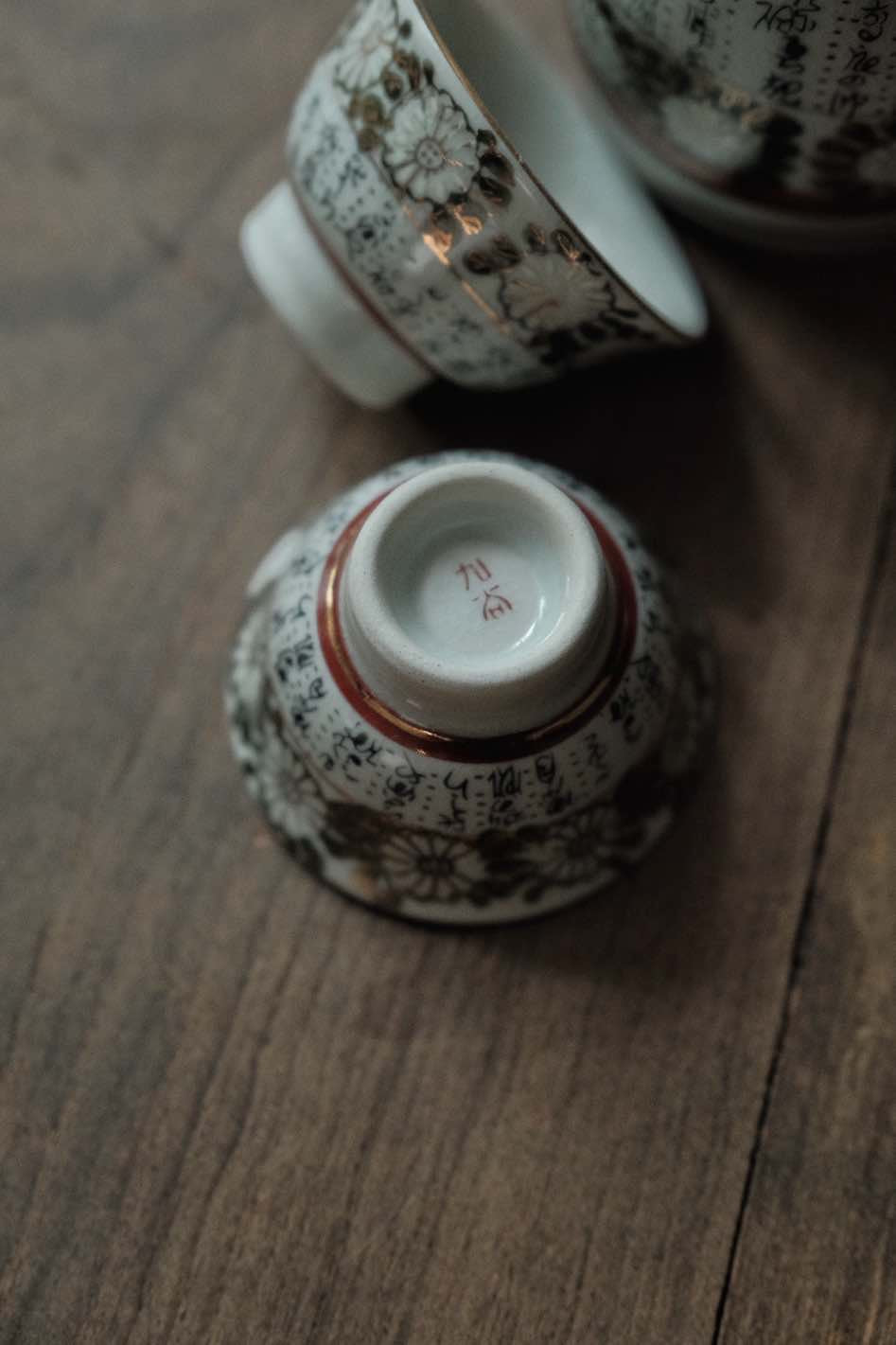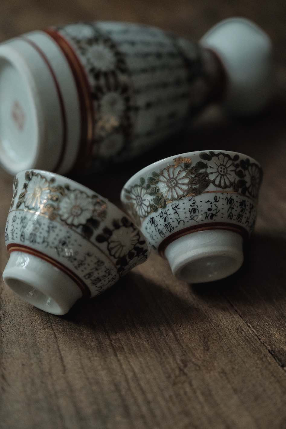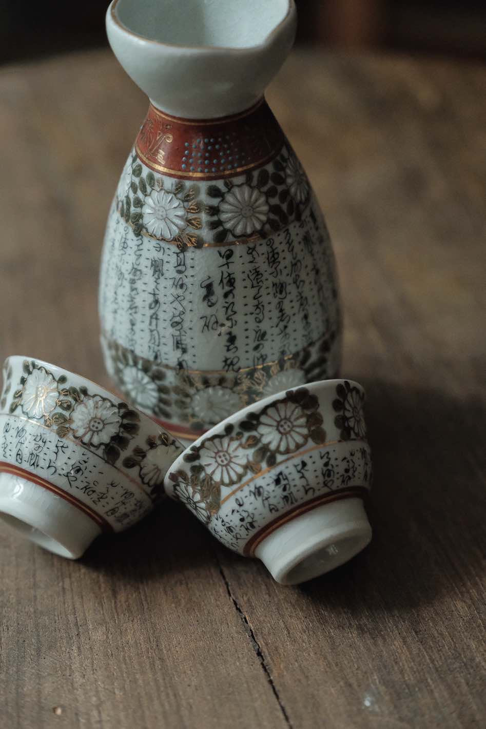 日本製·日本九谷燒手寫詩文赤繪清酒杯連酒瓶