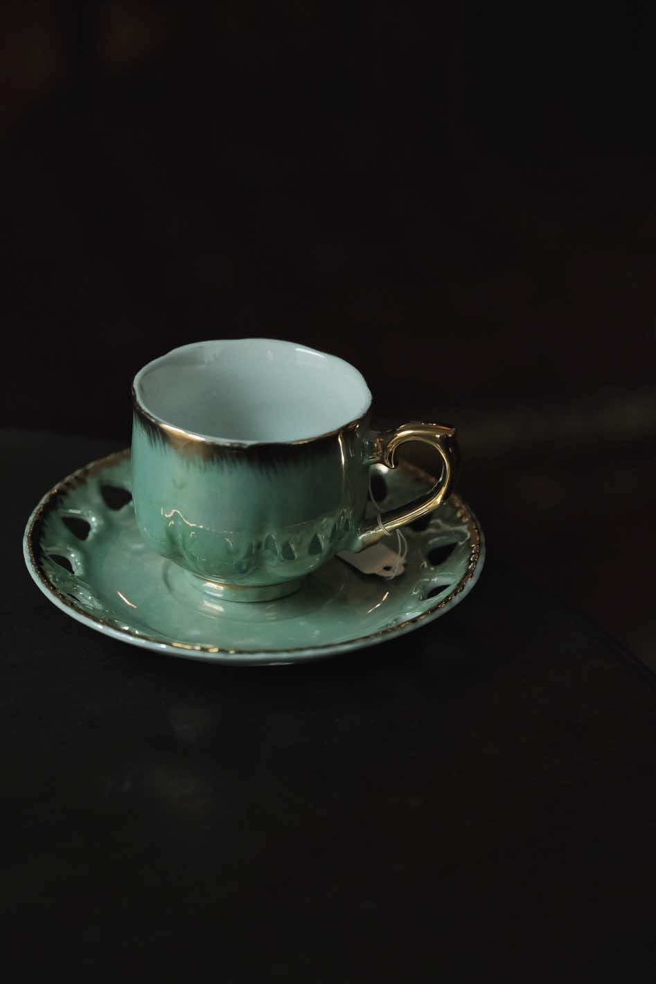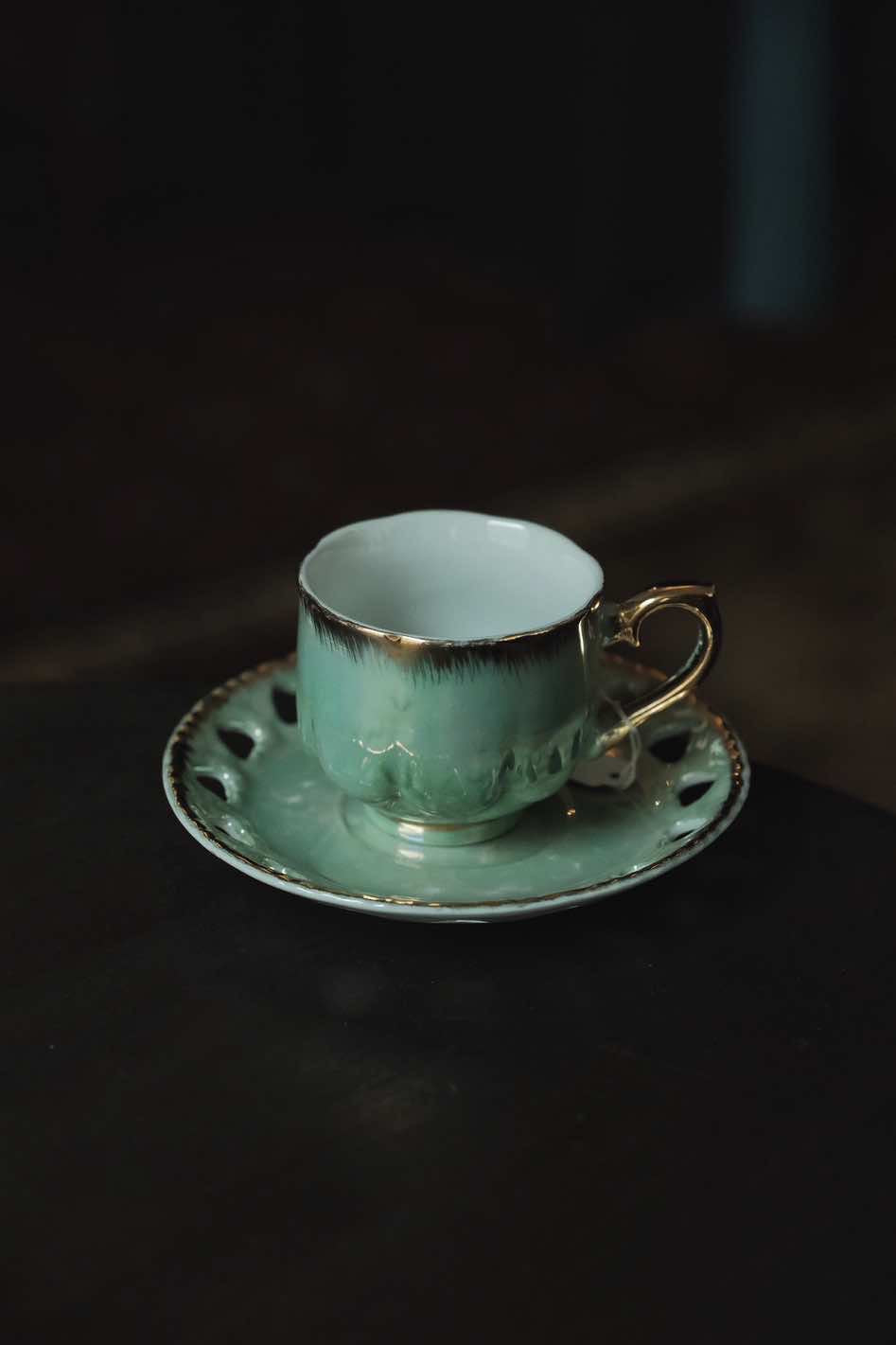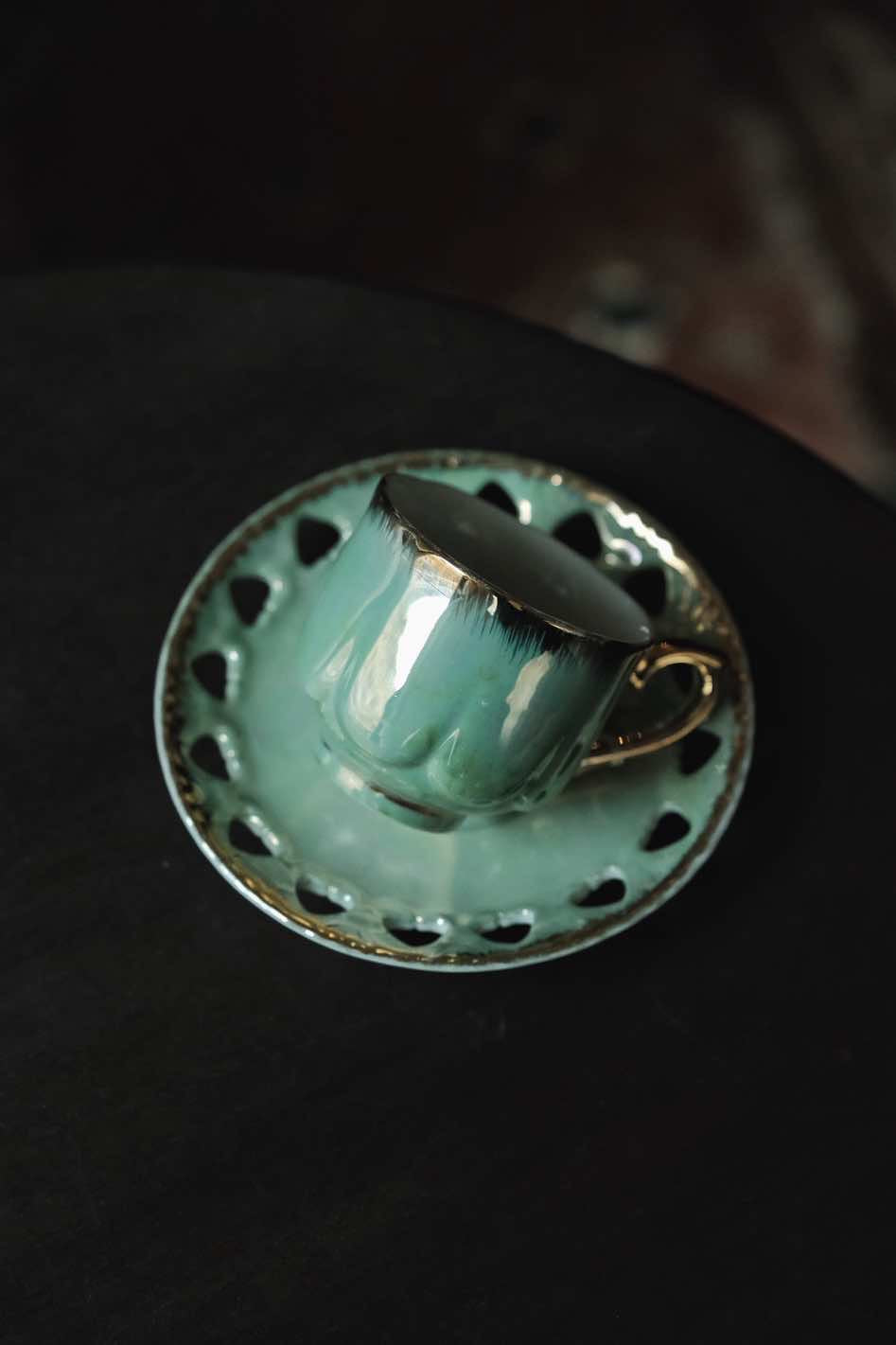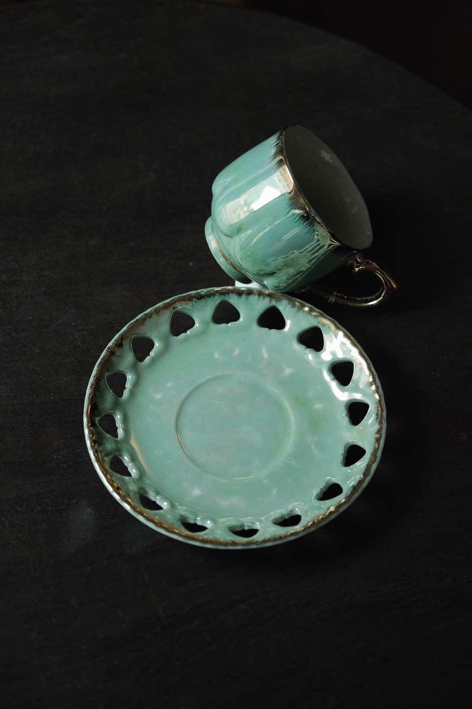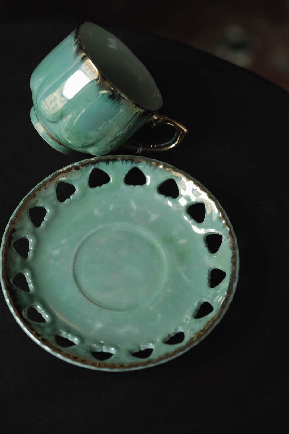 鏤空碟邊,手把全描金 珍珠綠自然色優雅美感,花瓣般形狀的浮雕杯身碟身,光線照射呈現的七彩珍珠色落為簡潔配色呈現高貴感。