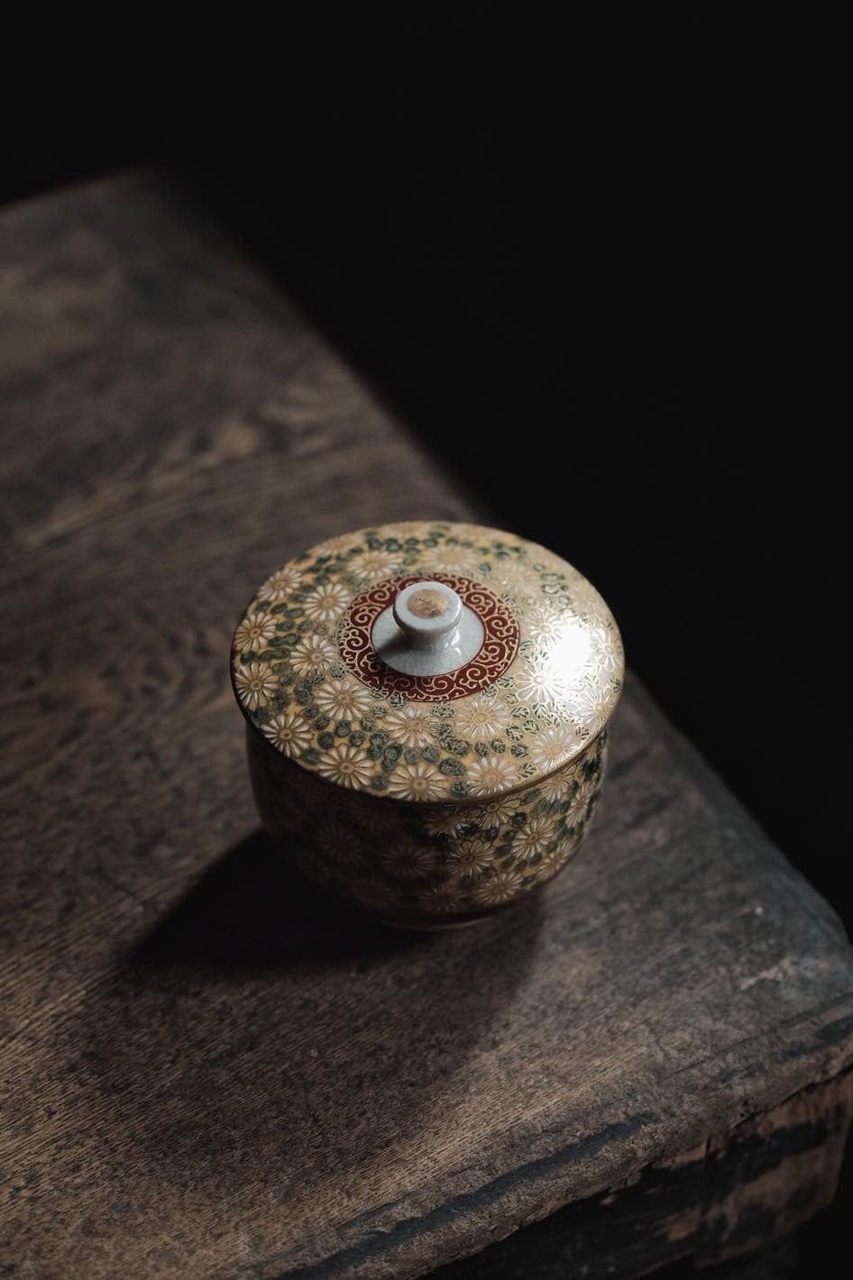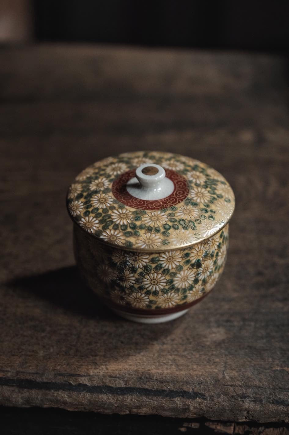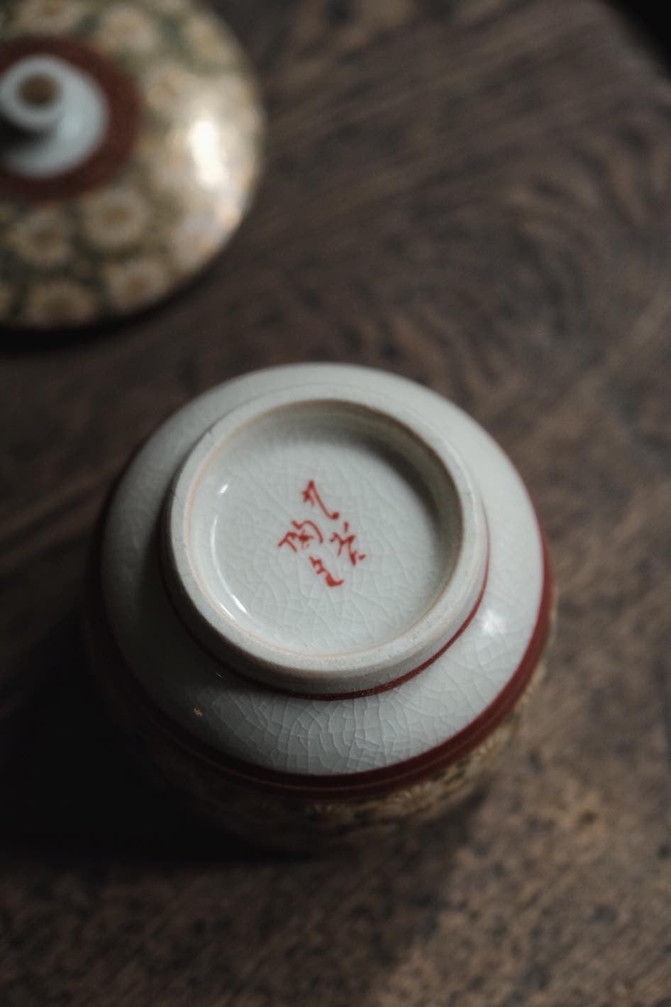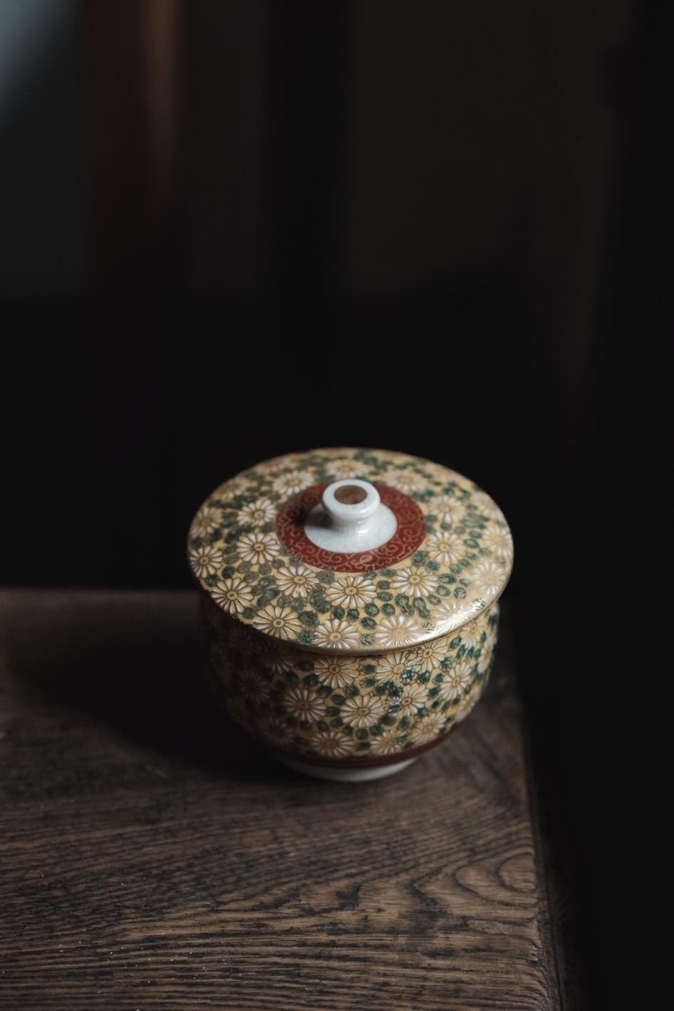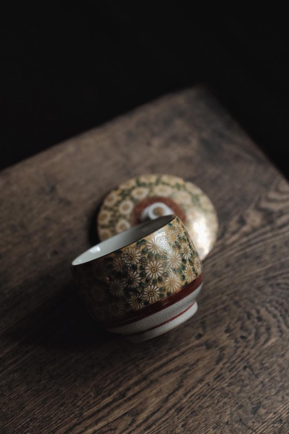 日本九谷燒百花不落地赤繪描金蓋杯(180ml)