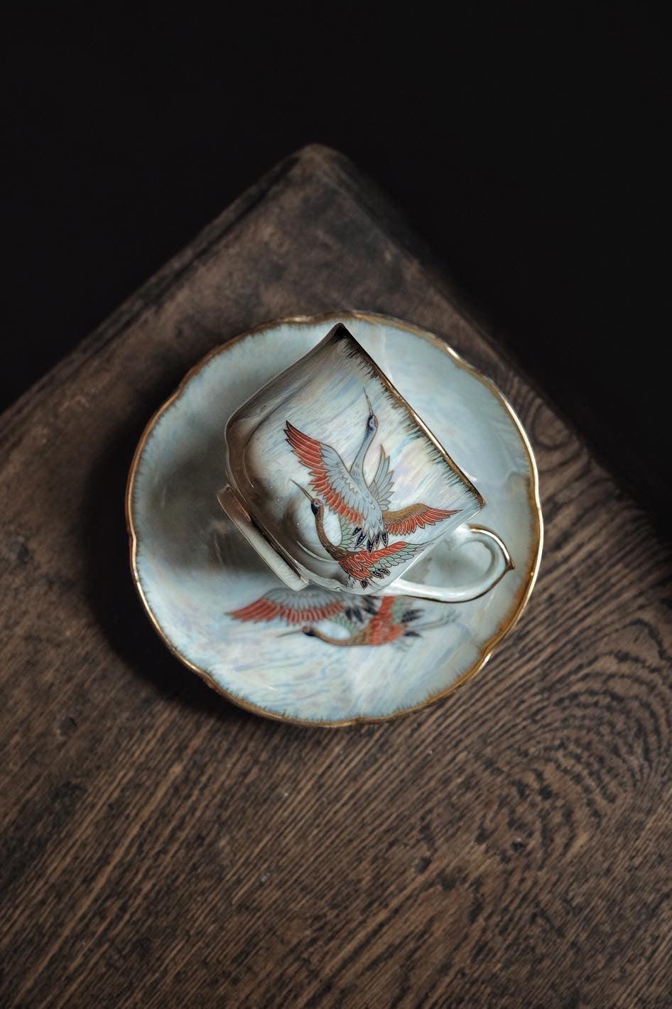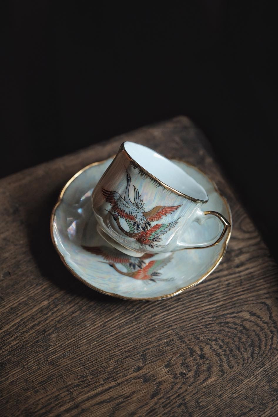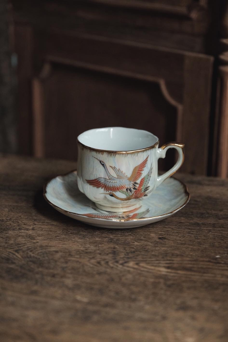 咖啡杯把手及杯口套有精緻描金,杯身碟身皆有日本丹頂鶴花。