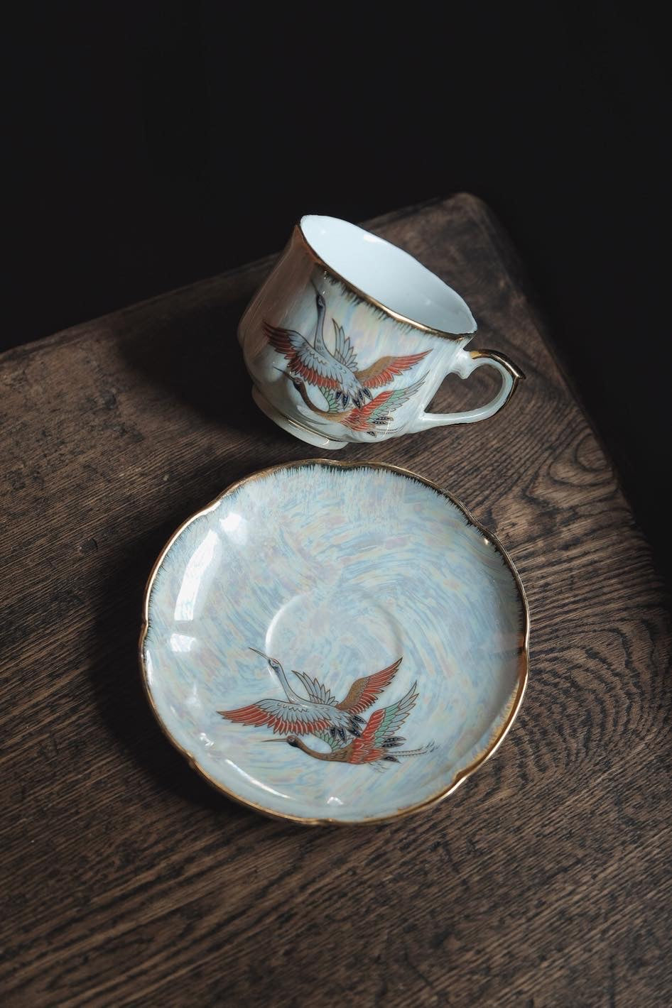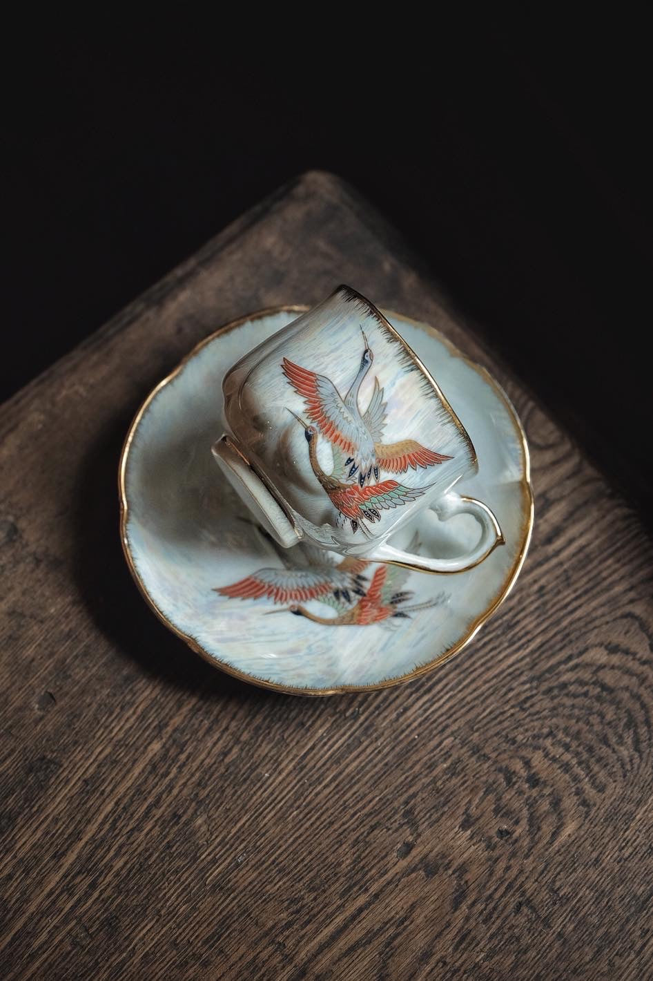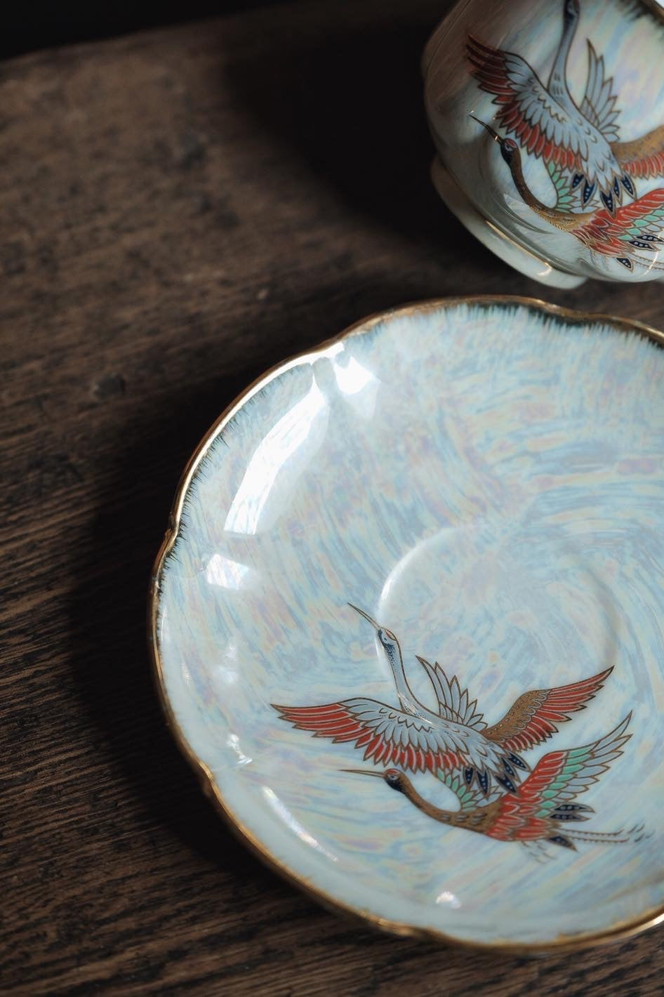 咖啡杯把手及杯口套有精緻描金,杯身碟身皆有日本丹頂鶴花。