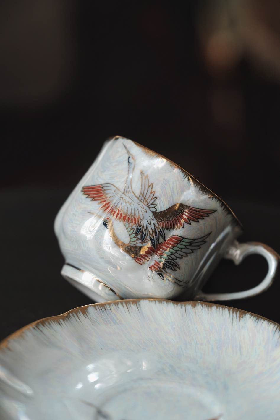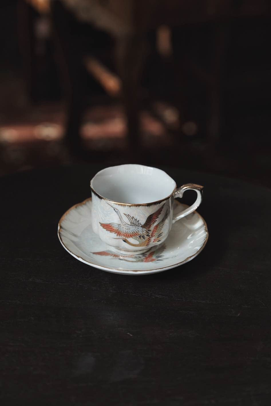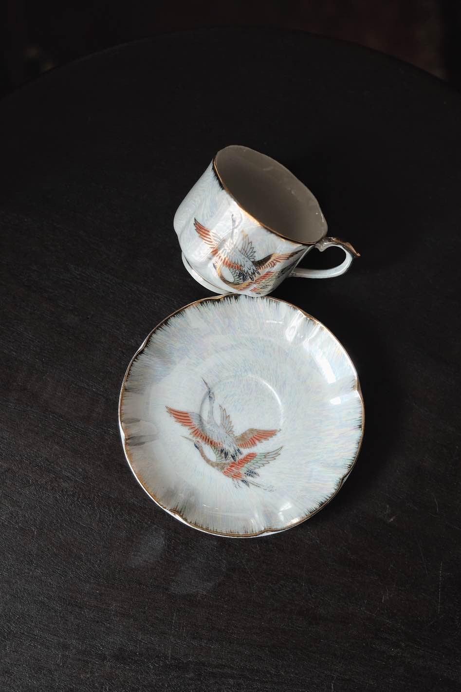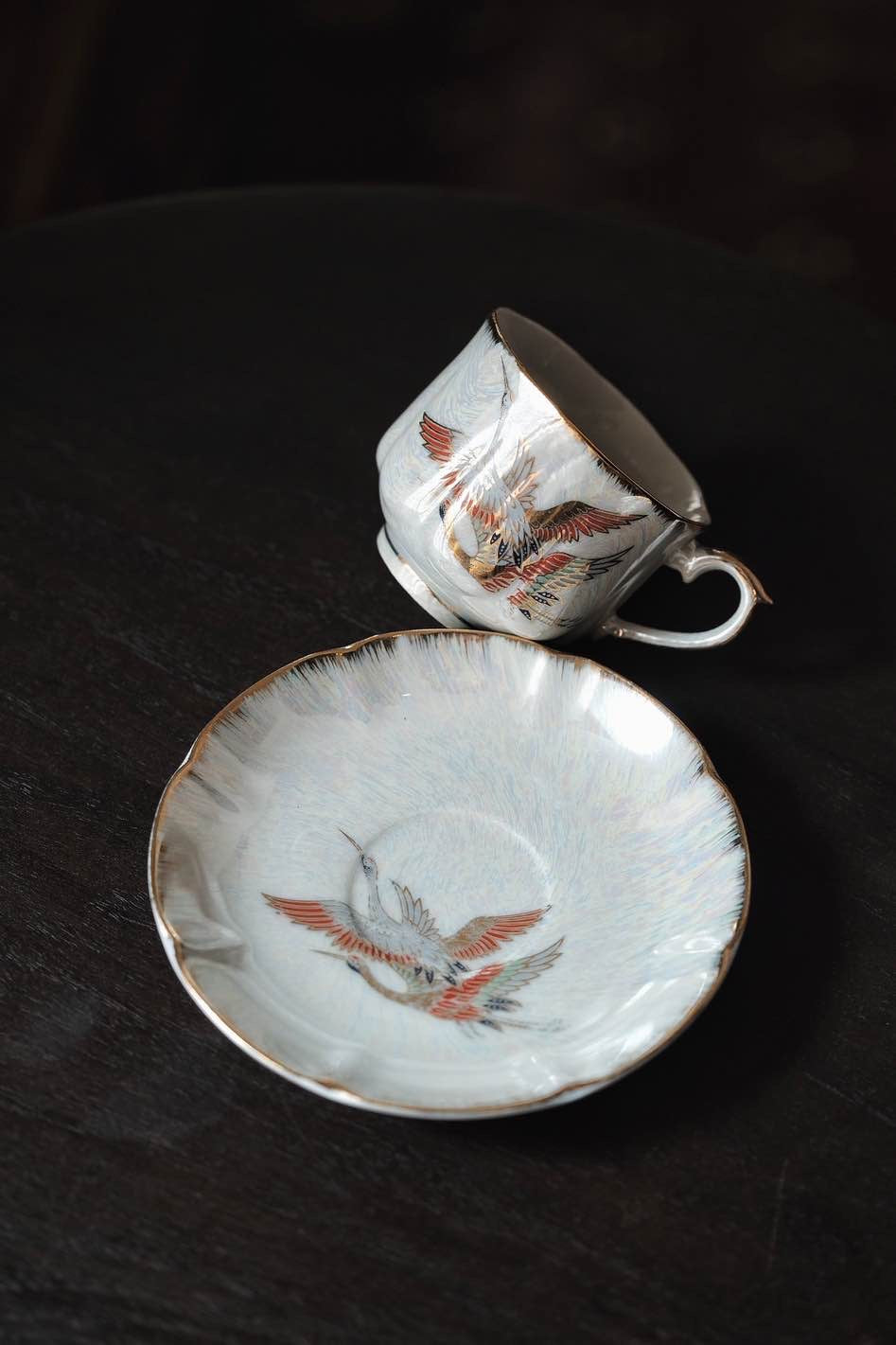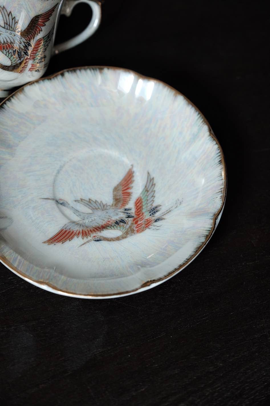咖啡杯把手及杯口套有精緻描金,杯身碟身皆有日本丹頂鶴花。