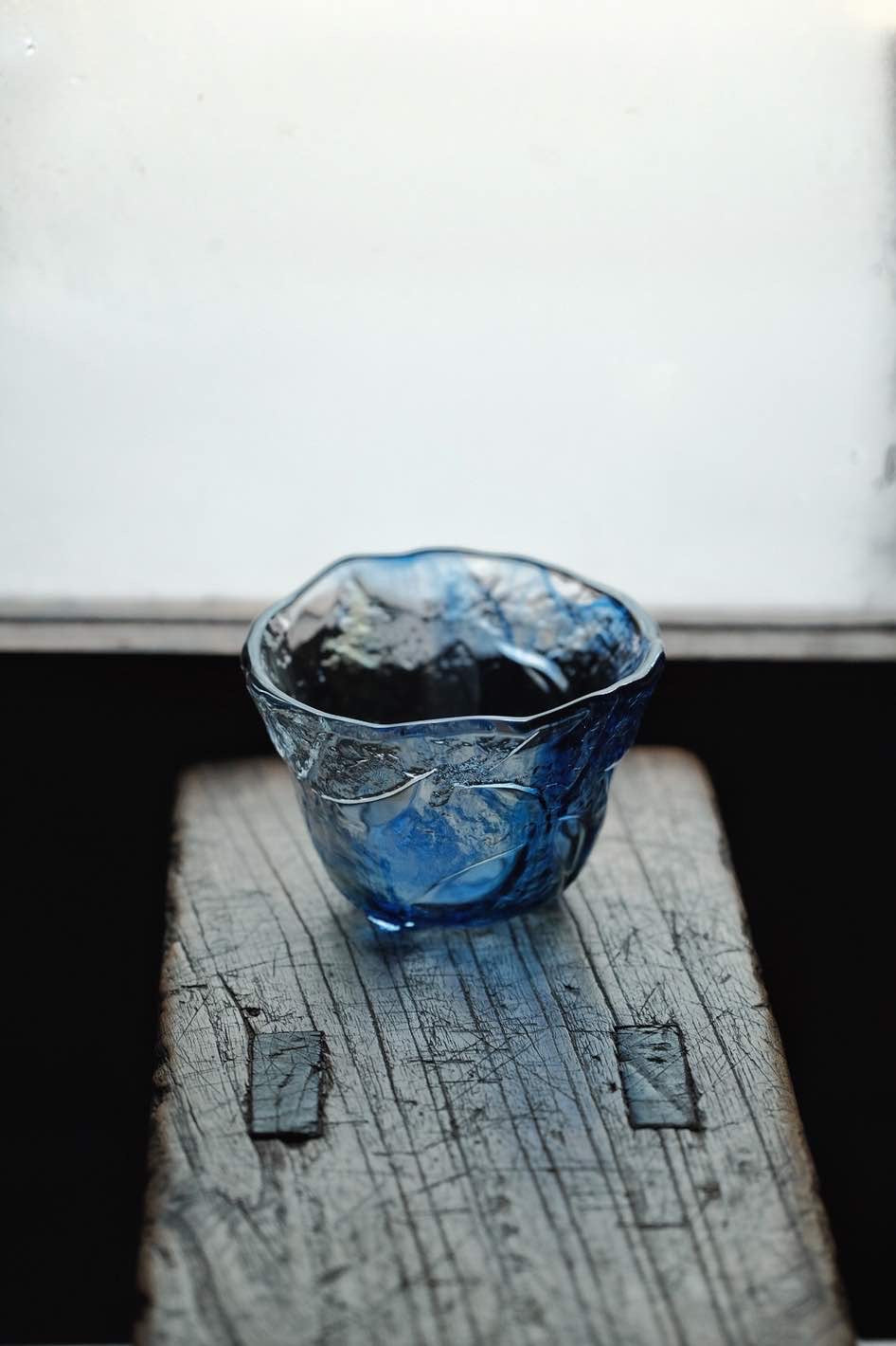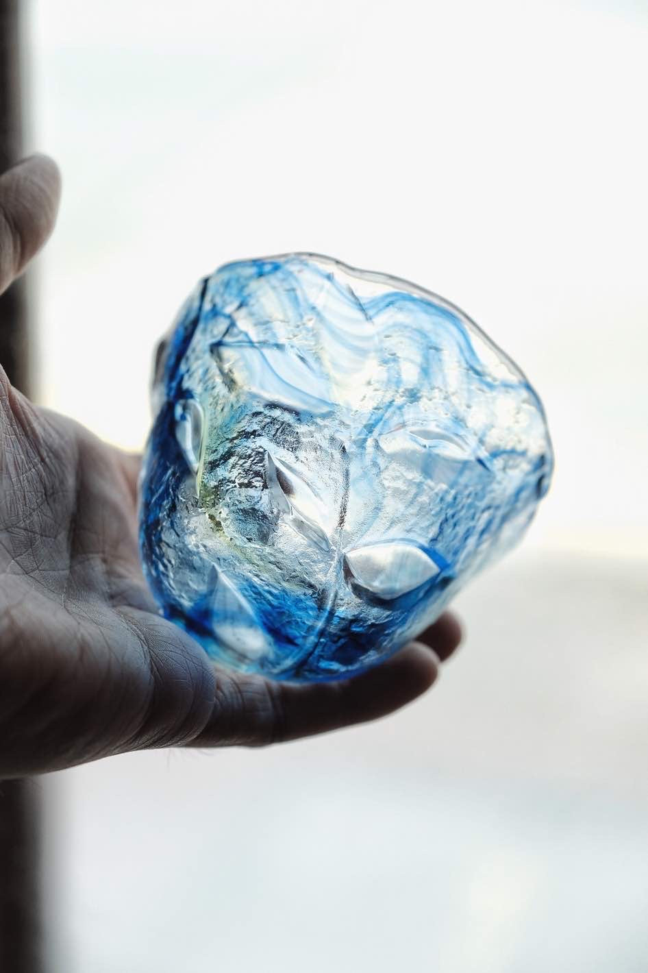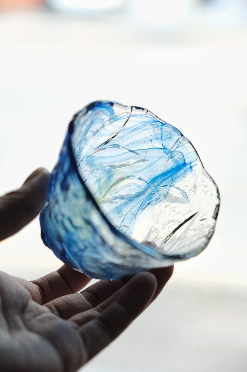 琉璃大杯或沾麵汁碗使用,三足設計,杯身反刻櫻花花瓣凹凸質感,幻彩三色,似海洋魅影
