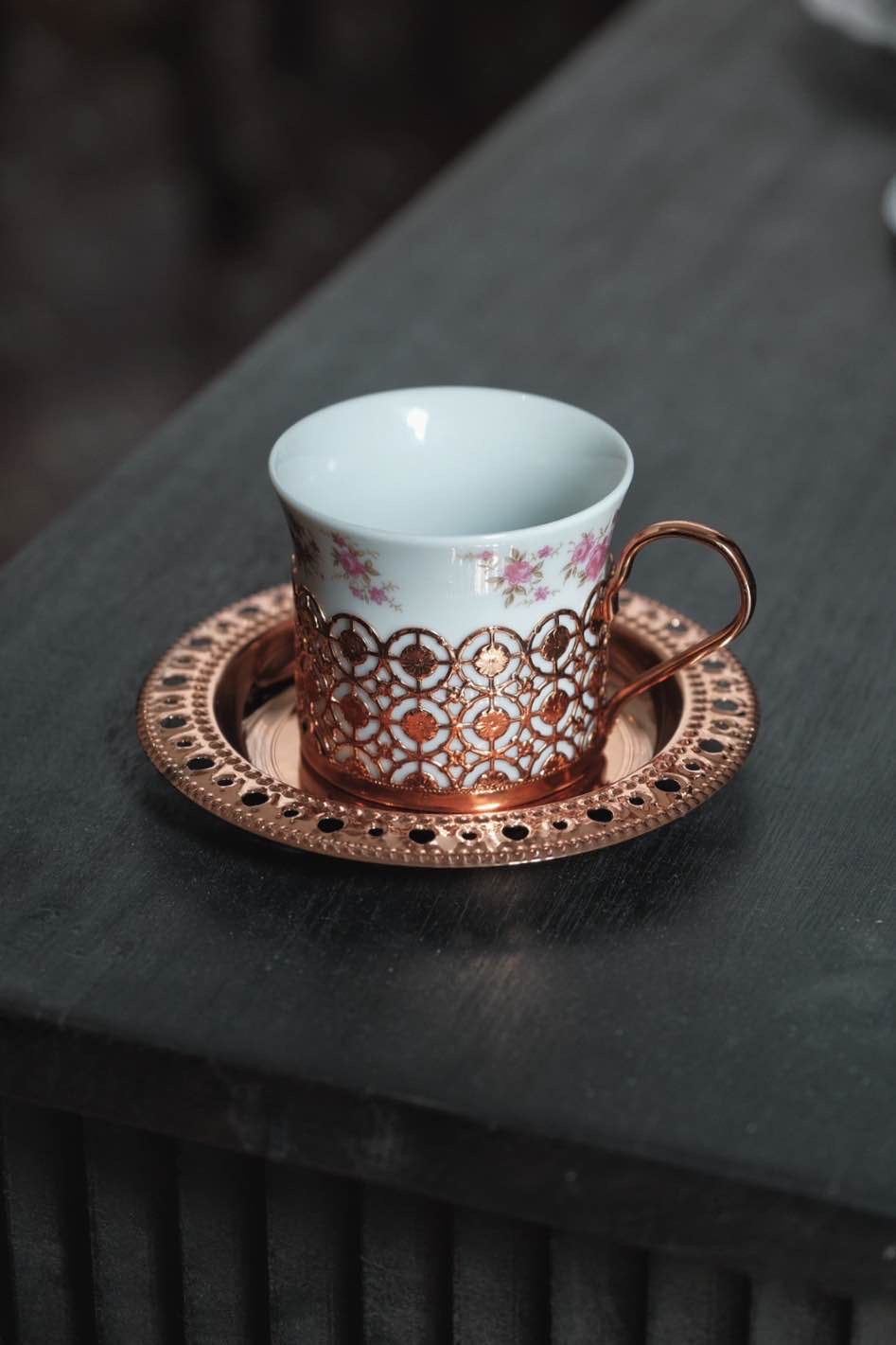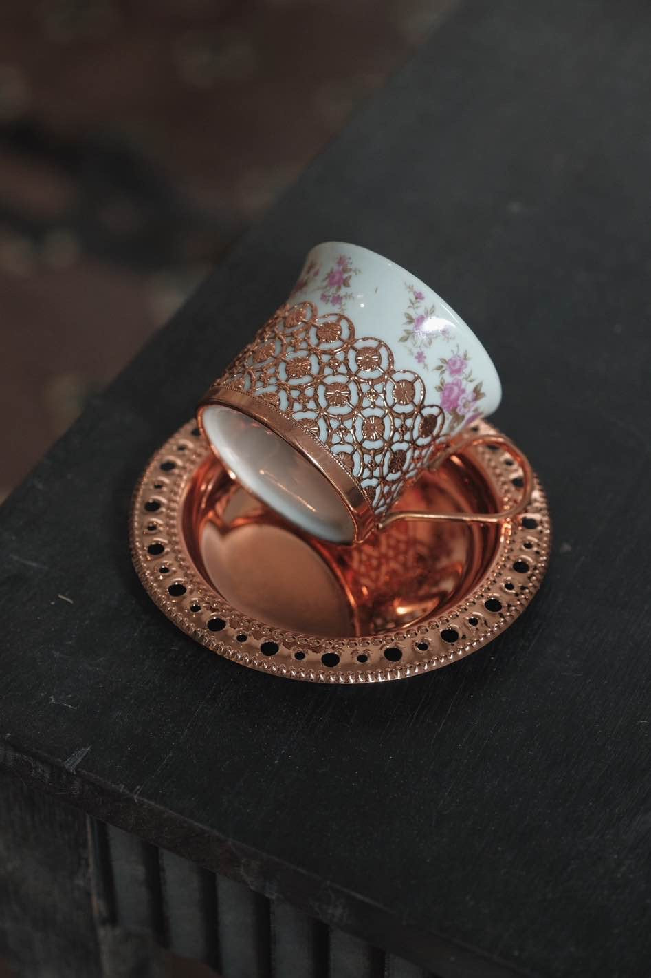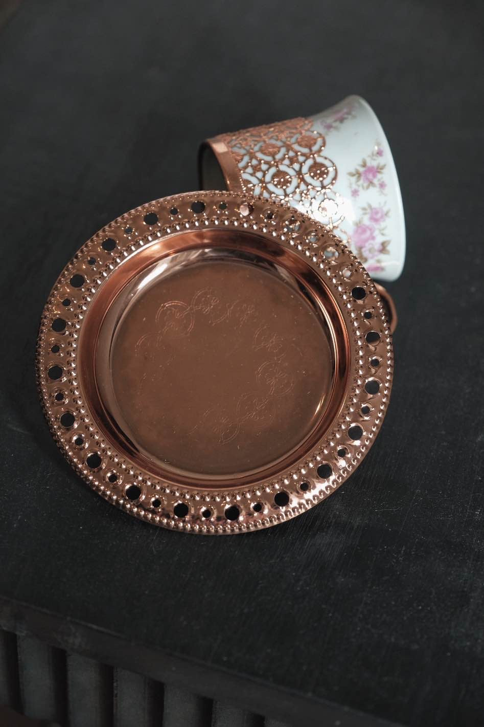 少有紅銅鏤空金屬花紋配花瓷杯,紅銅花型細緻,碟面也有細節刻紋整體高雅,陶瓷杯可獨立拆出清潔