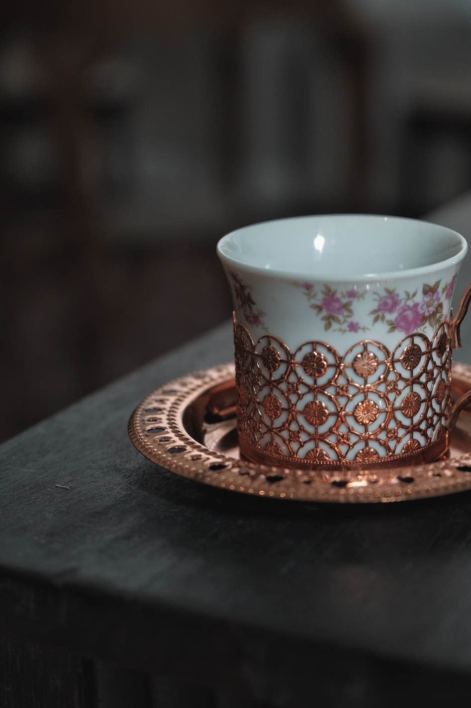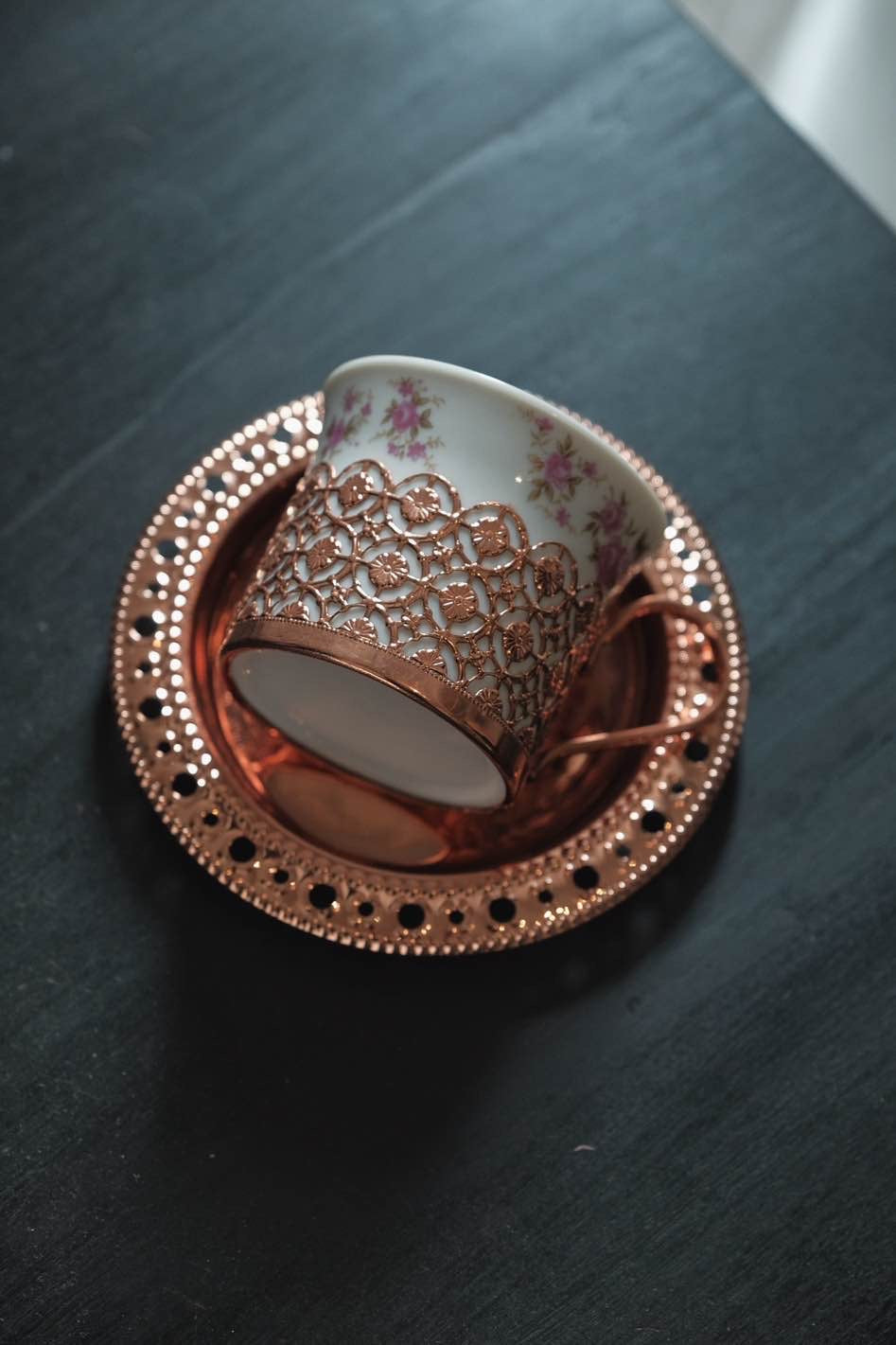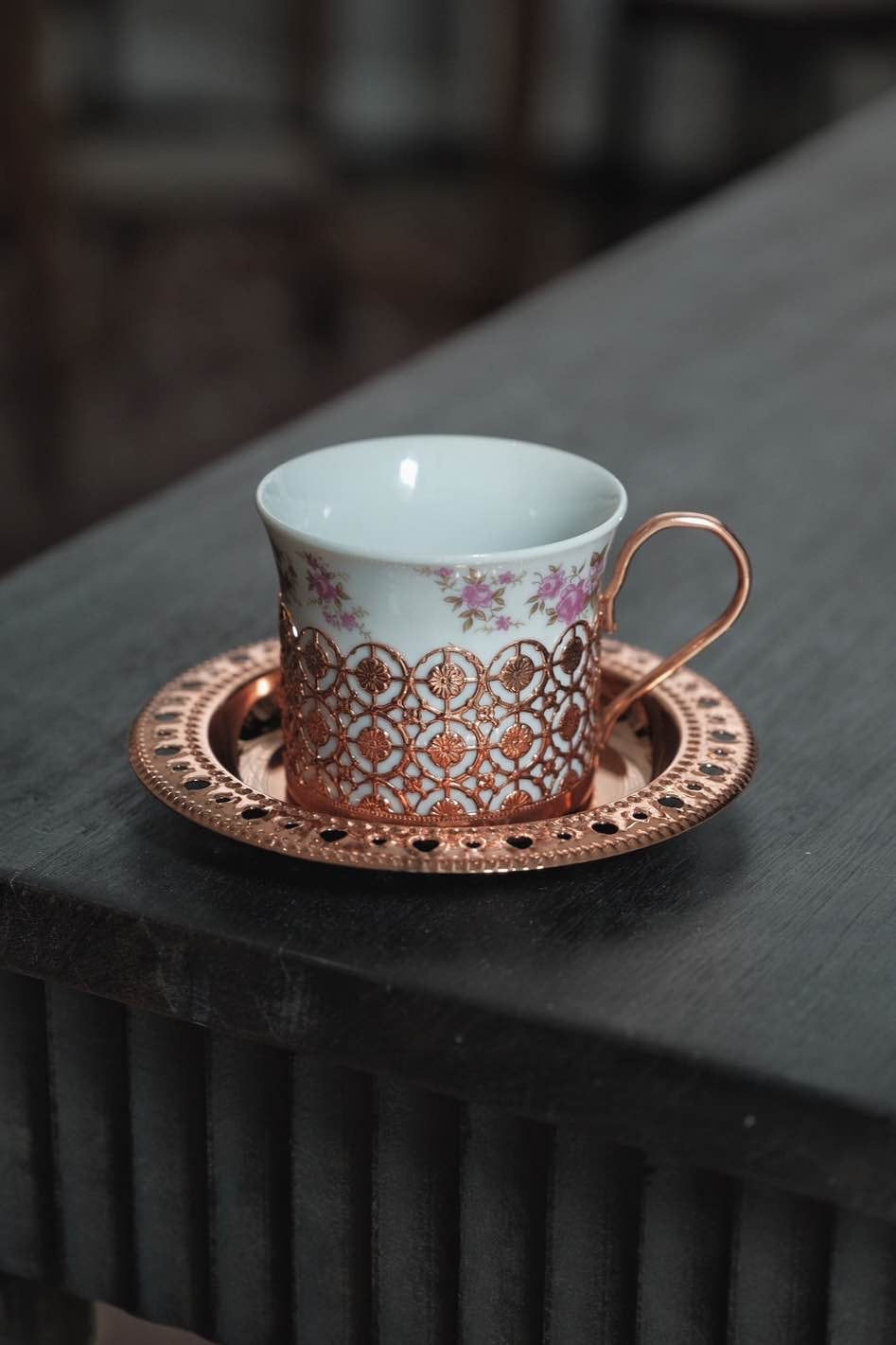 少有紅銅鏤空金屬花紋配花瓷杯,紅銅花型細緻,碟面也有細節刻紋整體高雅,陶瓷杯可獨立拆出清潔