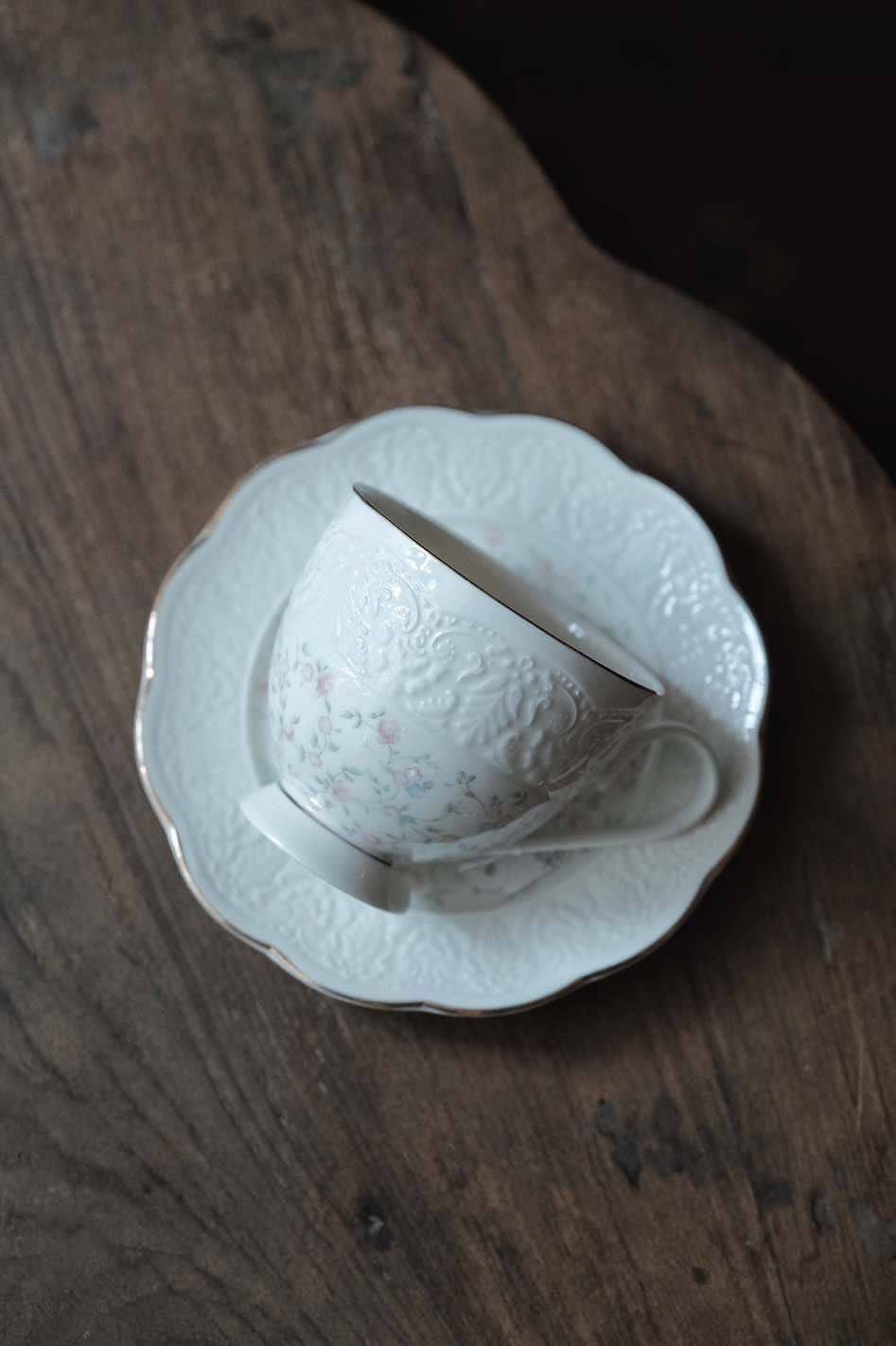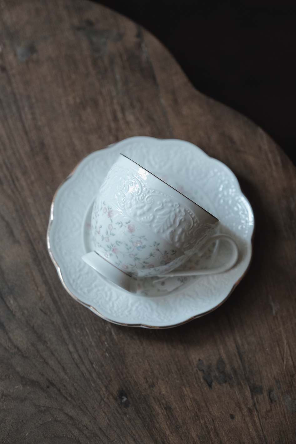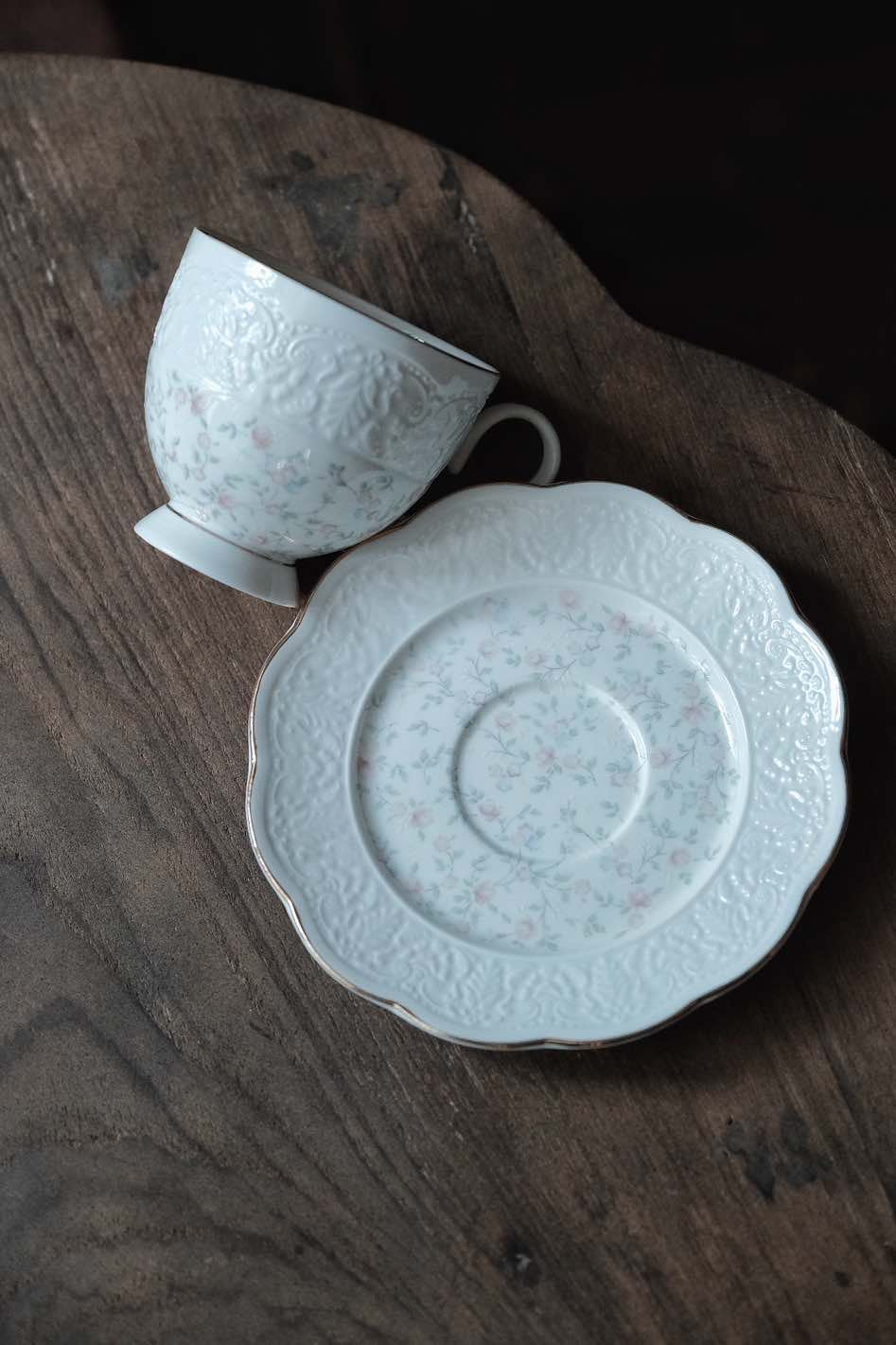 Moss rose 小碎花配浮雕草紋,雅致柔和,高足杯型,描金完整,容量大,十分適合陽光在窗邊和朋友度過下午茶敘