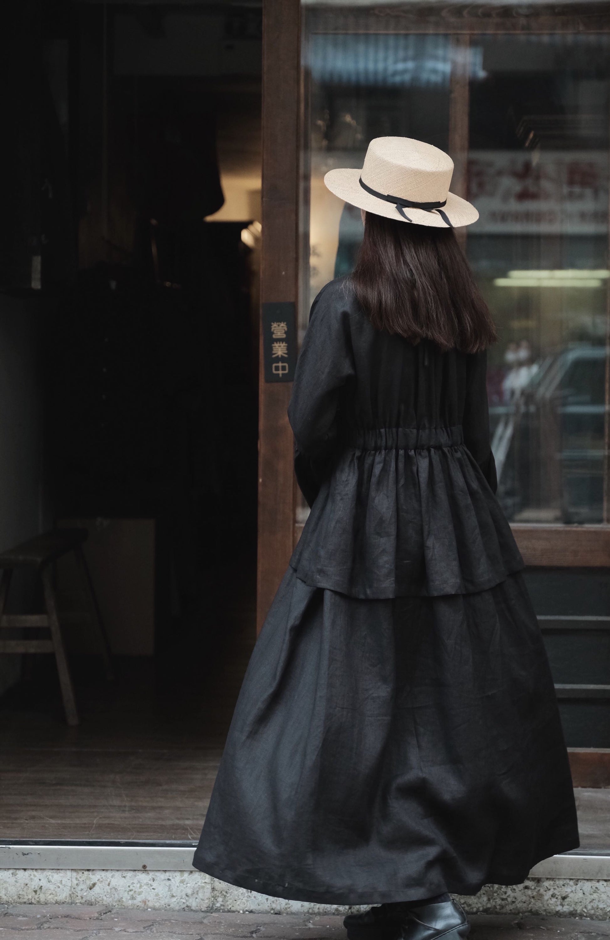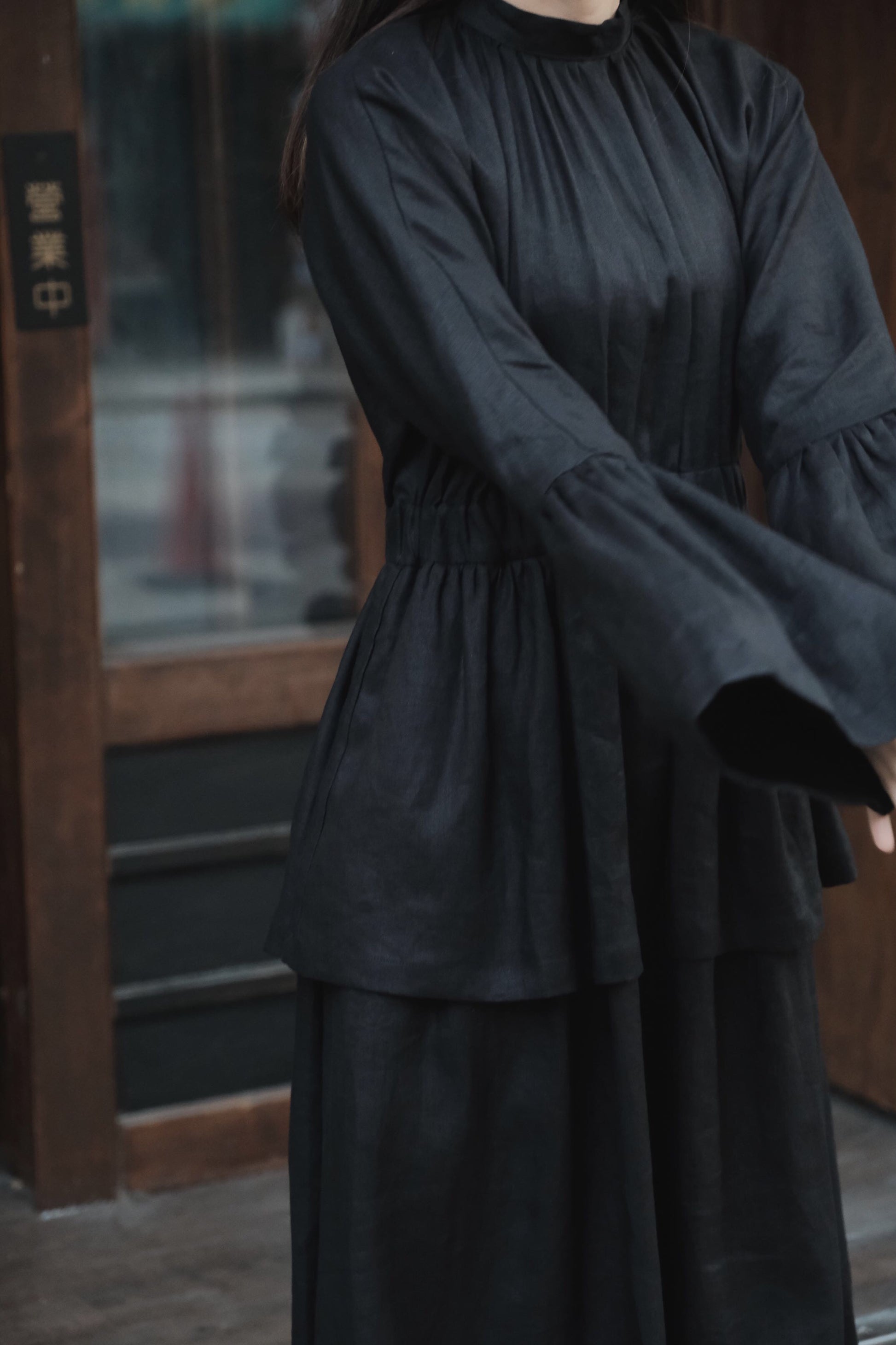 黑亞麻雙傘洋裙