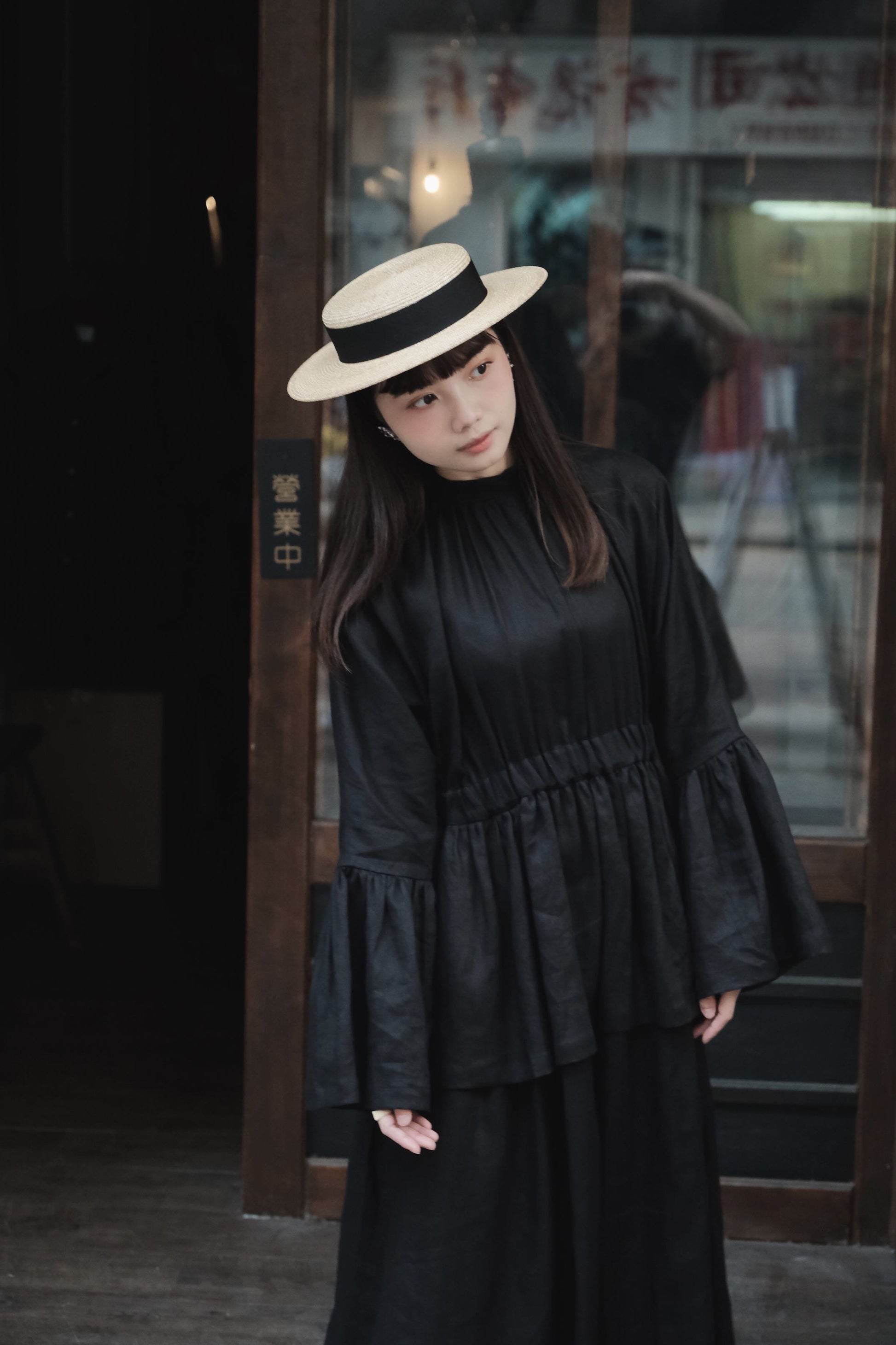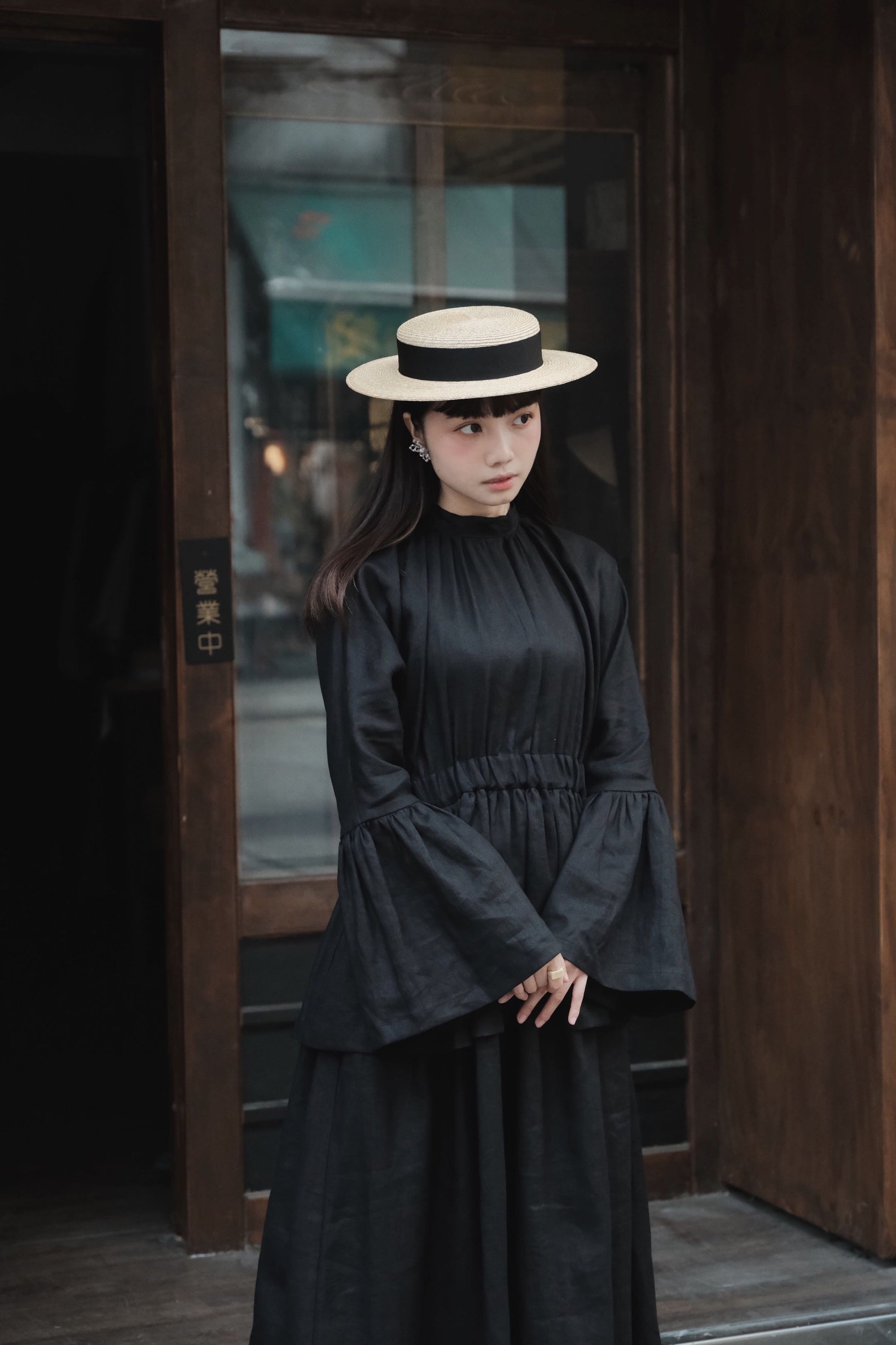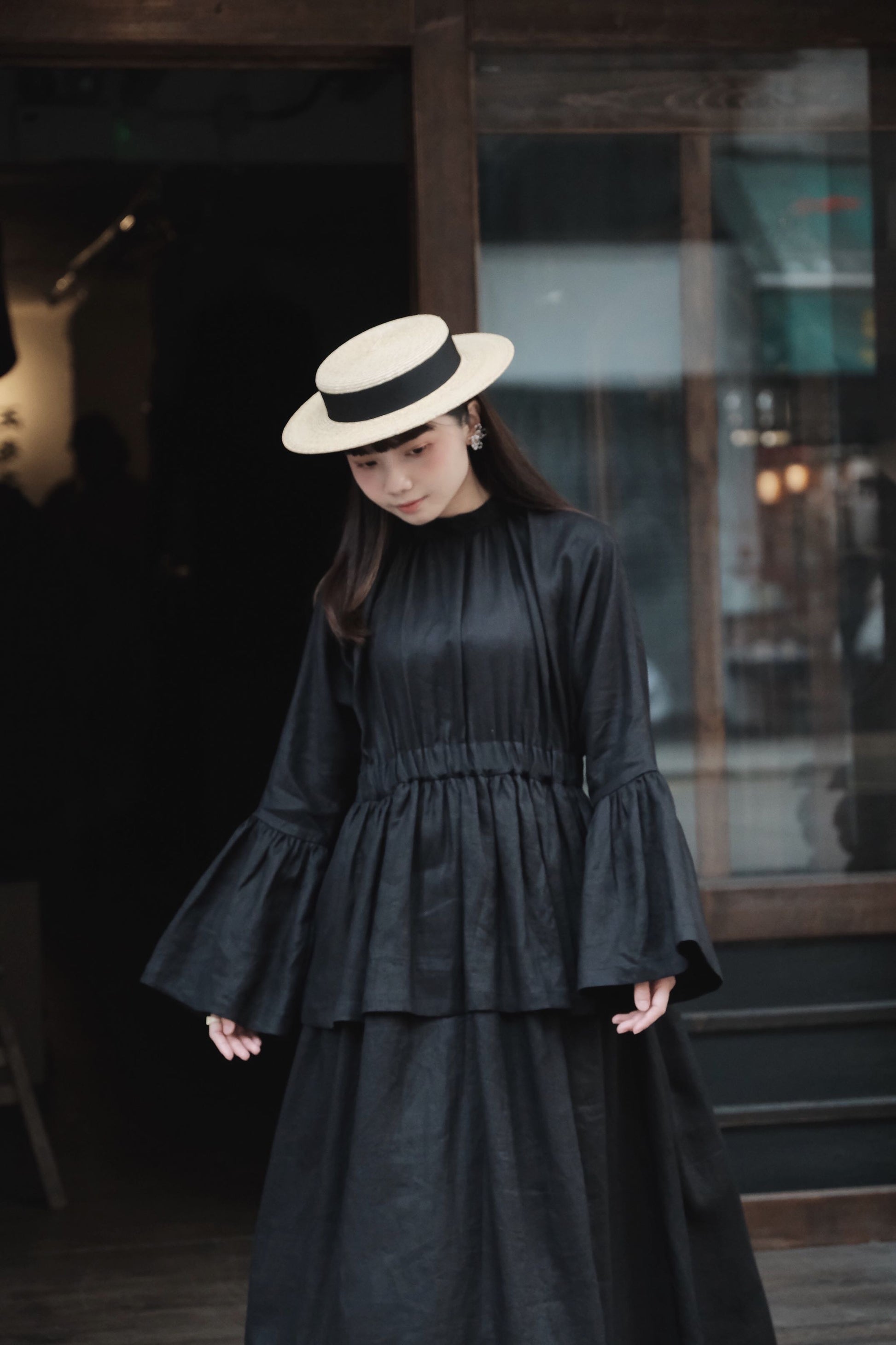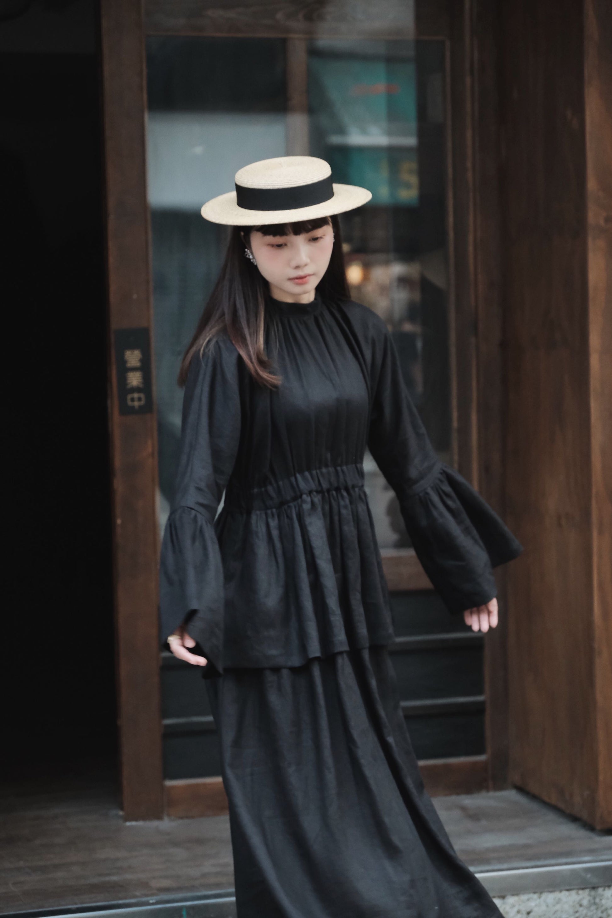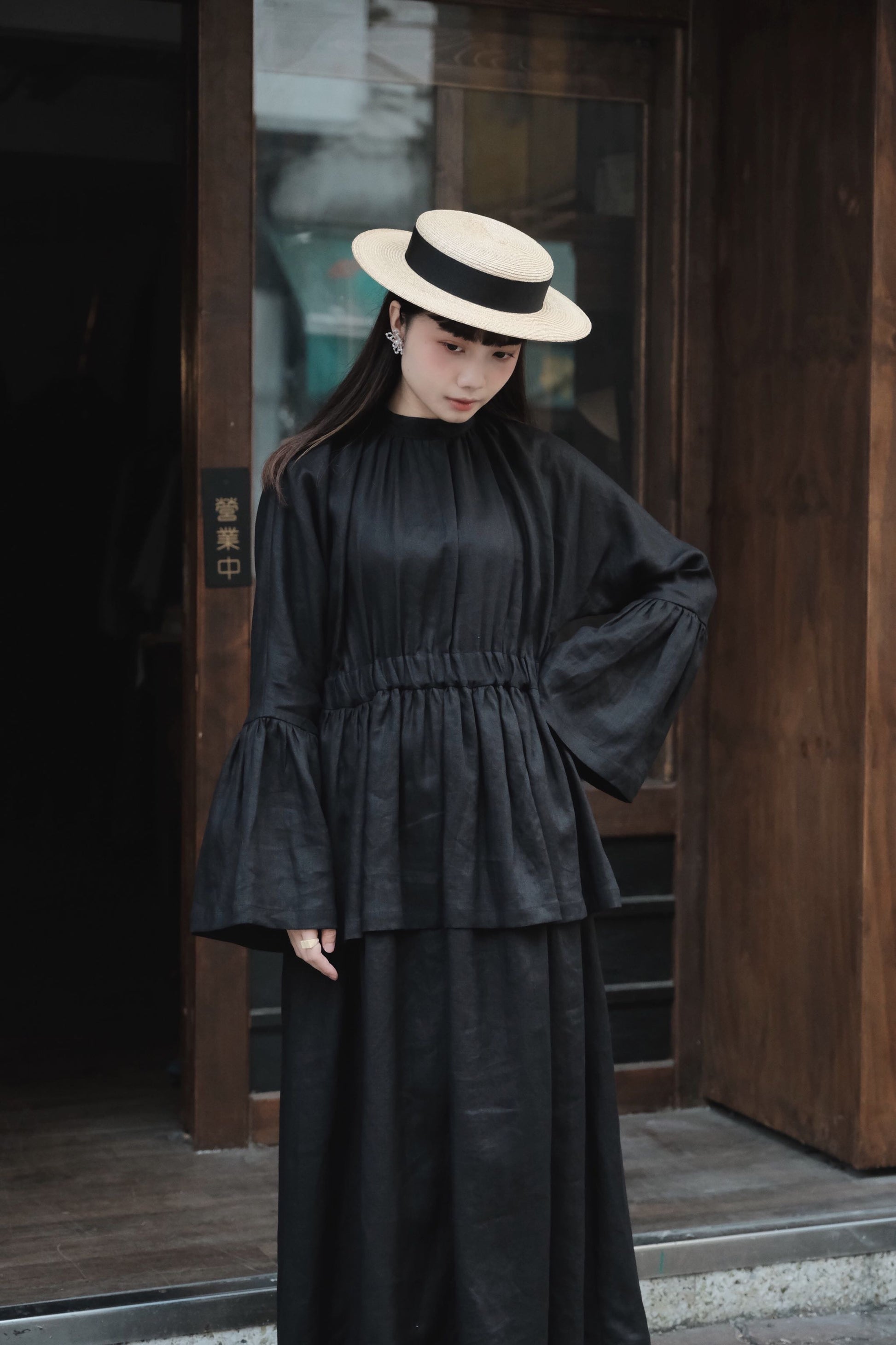 袖破荷葉口,闊袖遮蓋半手,長度和攞裙一置能呈現出視覺平衡感,腰部抽摺橡筋增加皺褶布量,雙層一件式裙裝。