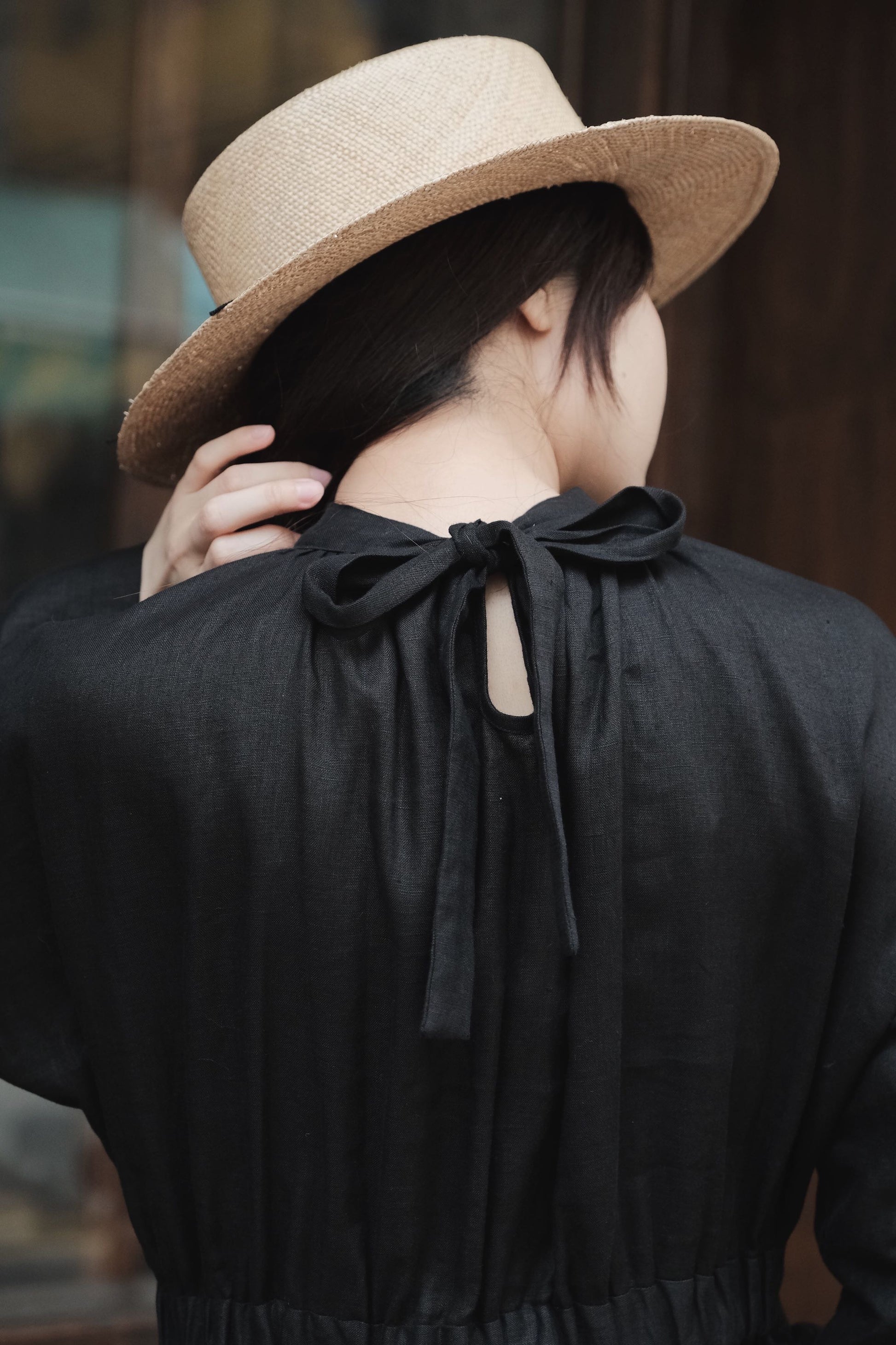 領為小企領,領底有碎摺增加典雅感,後領綁帶長度能做各種結形。