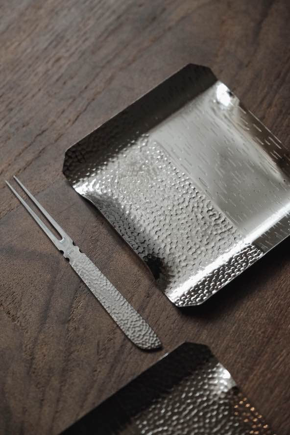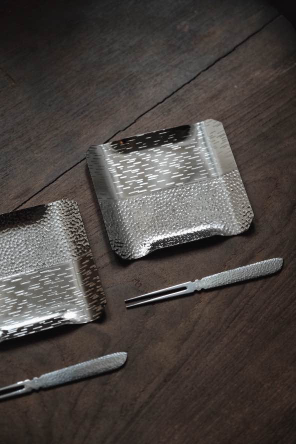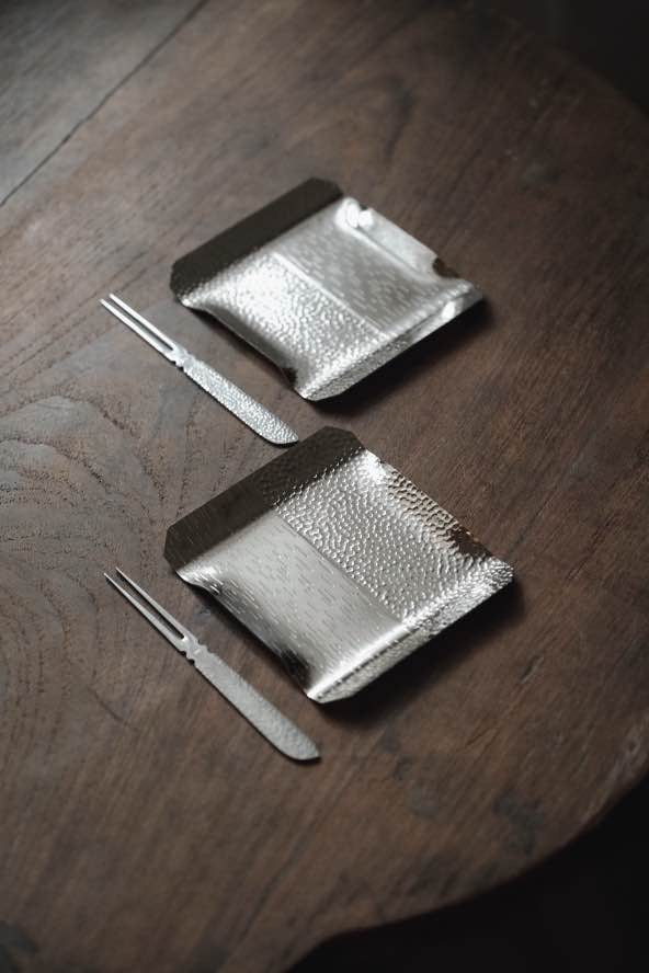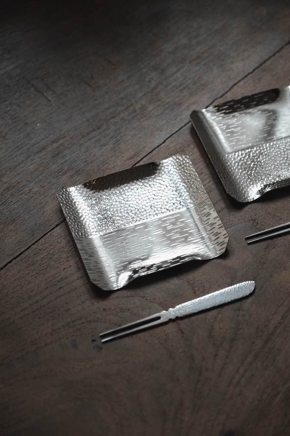 ($100)日本製· 銀仕上仿錘紋點心碟連叉