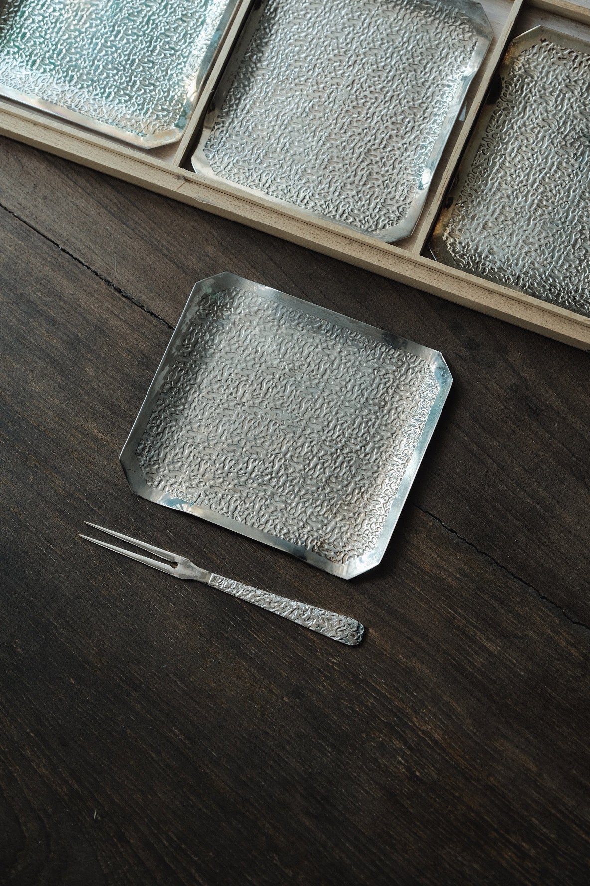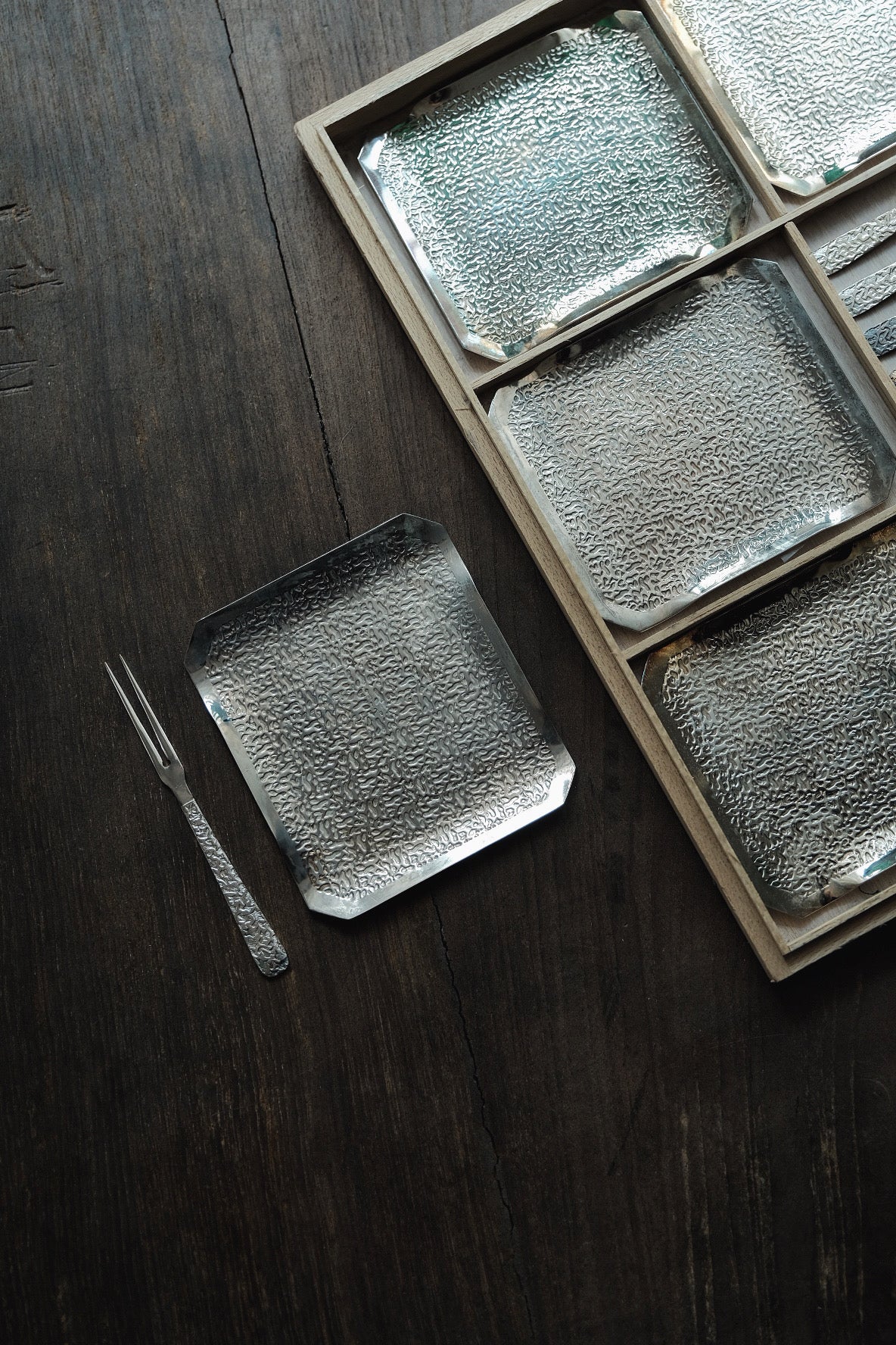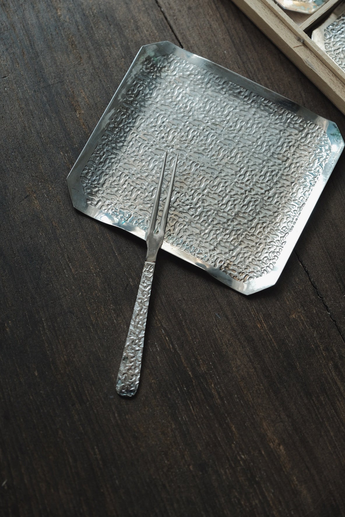 碟連叉 ,方型仿錘紋,表面有少許氧化痕跡,無傷大雅。