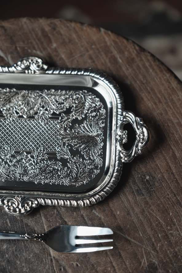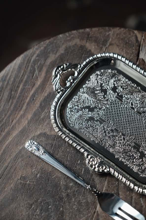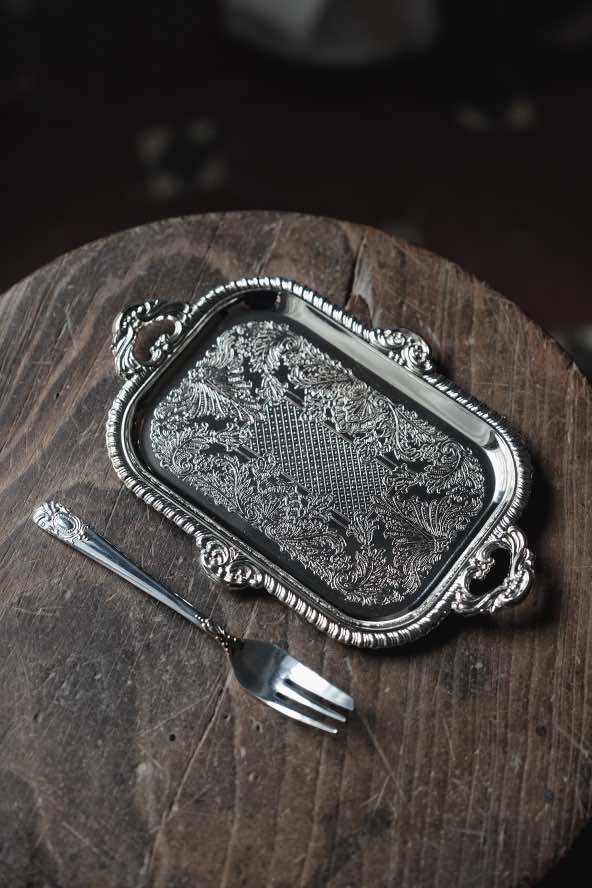 ($150)日本製· 洋食甜點浮雕不鏽鋼方刻花碟連叉