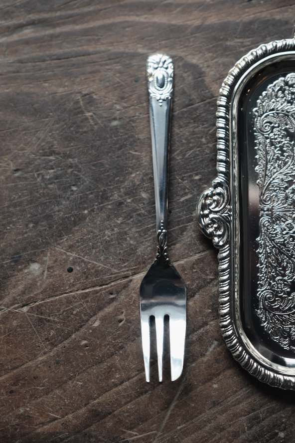 長型碟型可放切餅或蛋圈,叉形有刀位方便切開蛋糕,浮雕碟面圓打磨反光有層次,