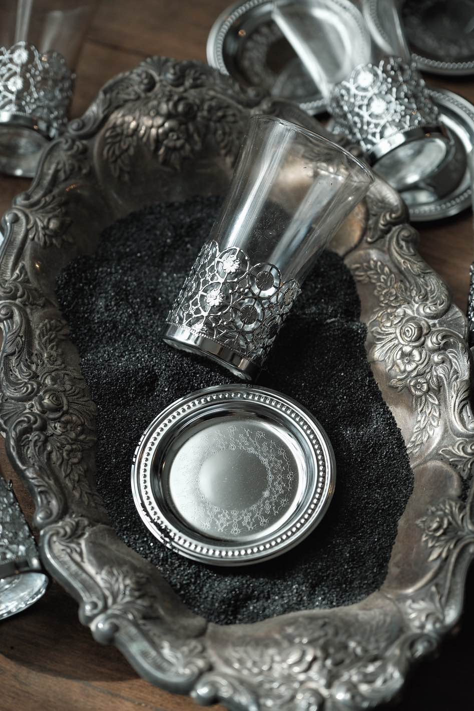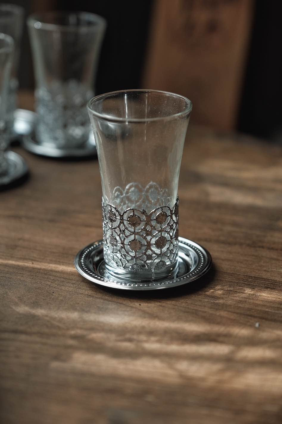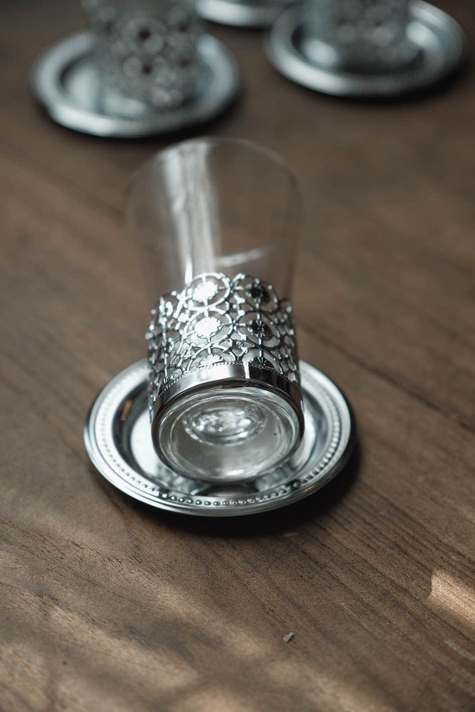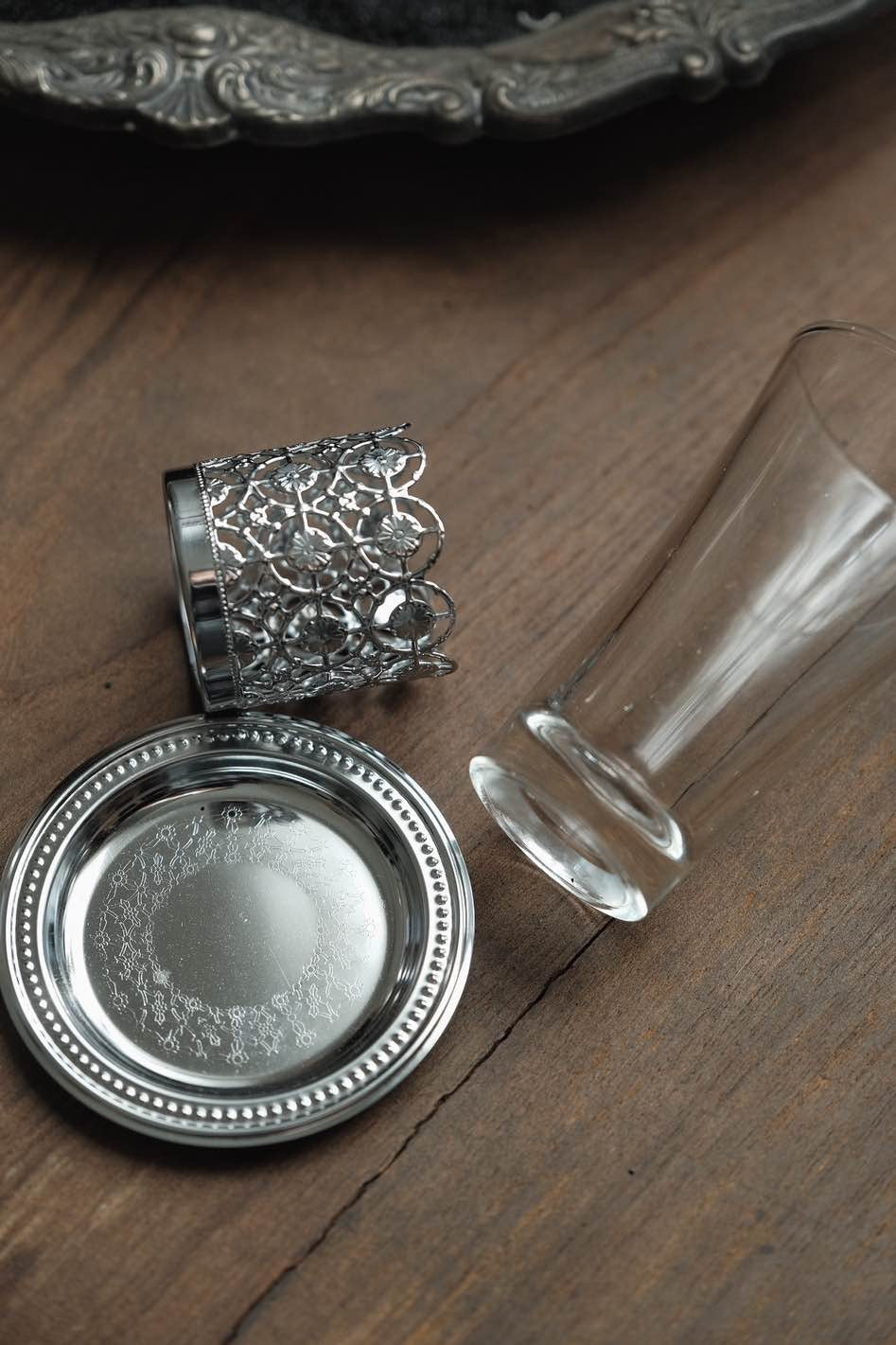 配刻花碟,鏤空金屬花紋擴口型杯身,小型杯身可細品更種酒飲,不失典雅,也適合用作啤酒杯,玻璃杯可獨立拆出清潔