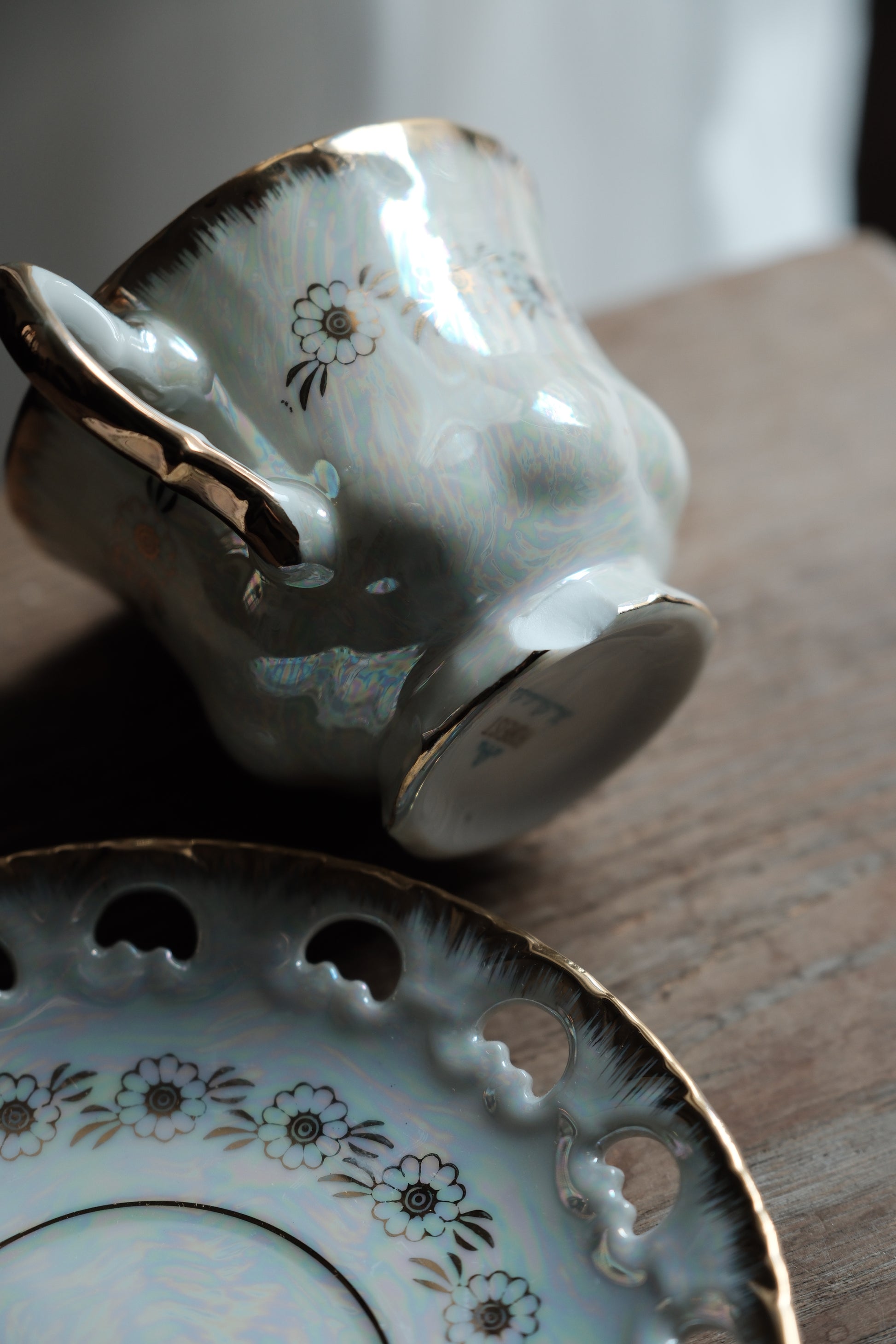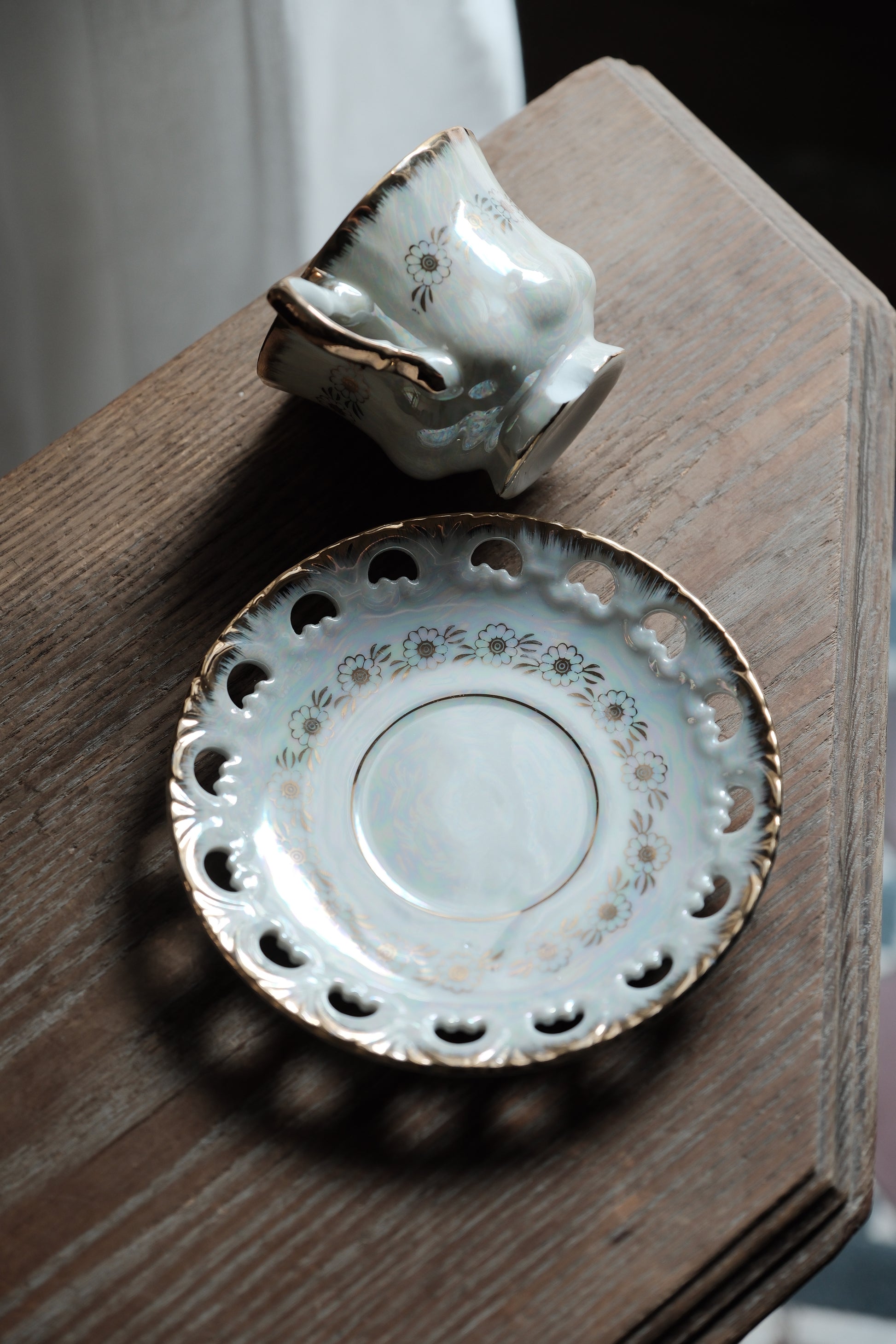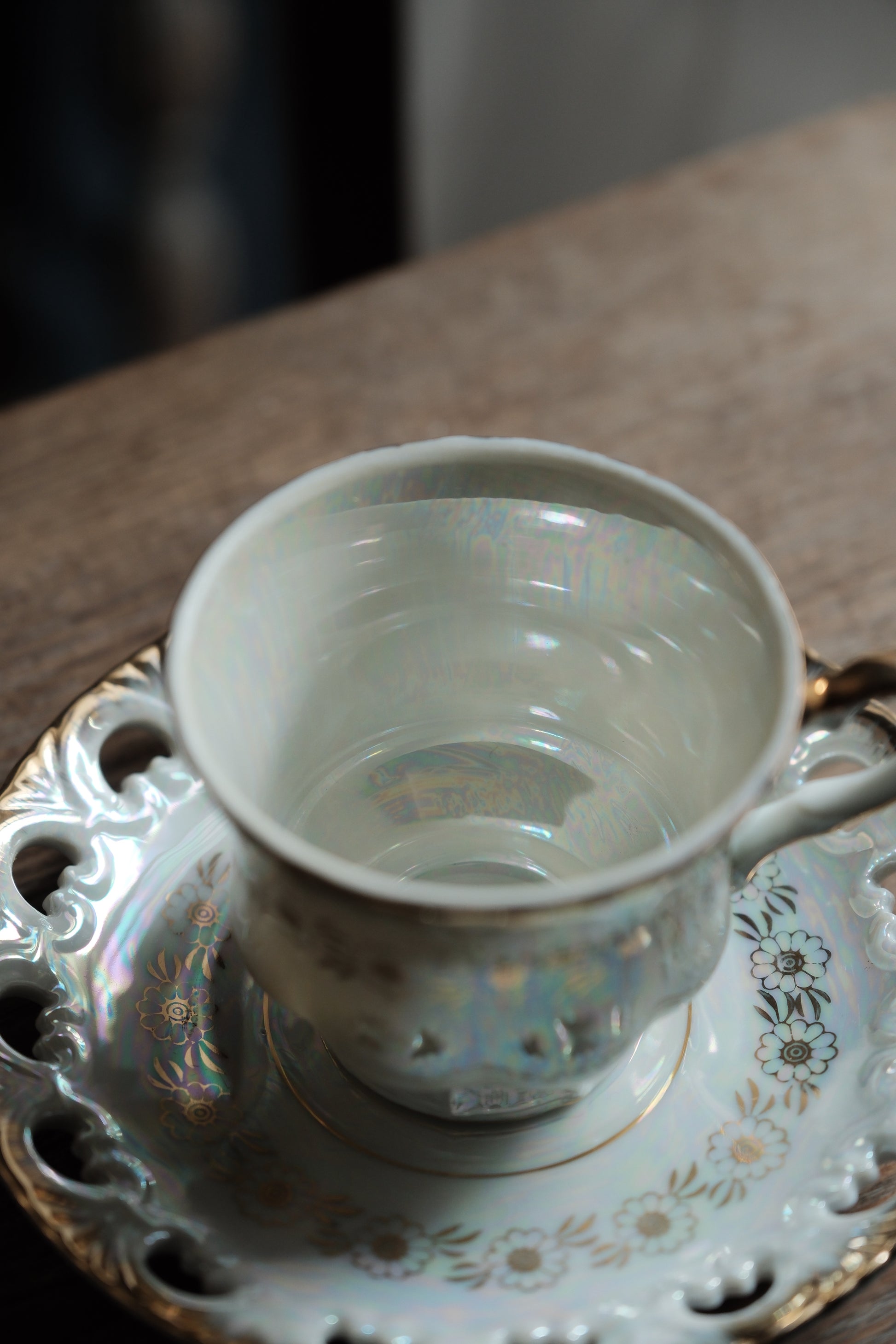 ($60有小瑕疵)日本製·高足貝殼釉浮雕描金花茶紅茶杯(180ml)