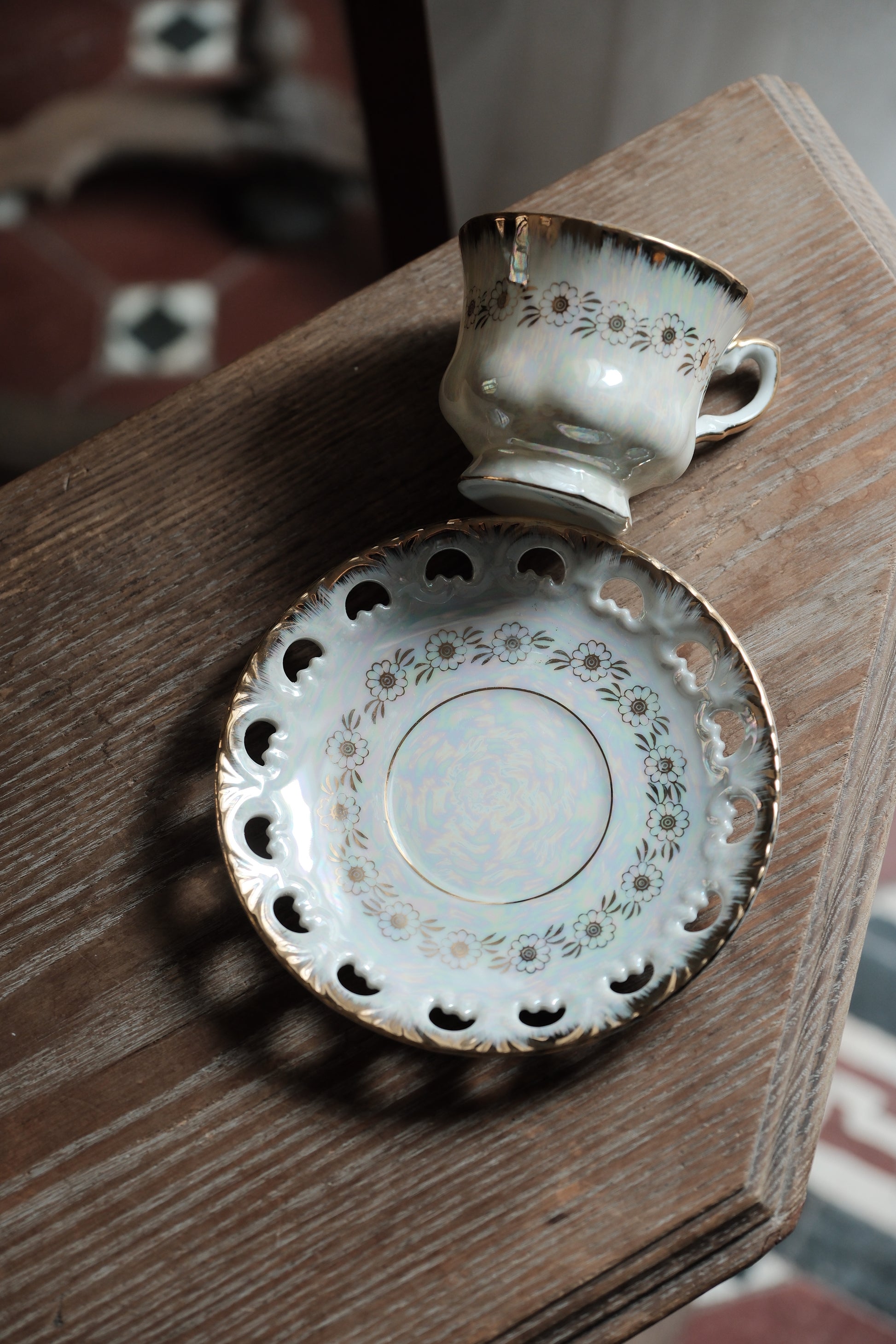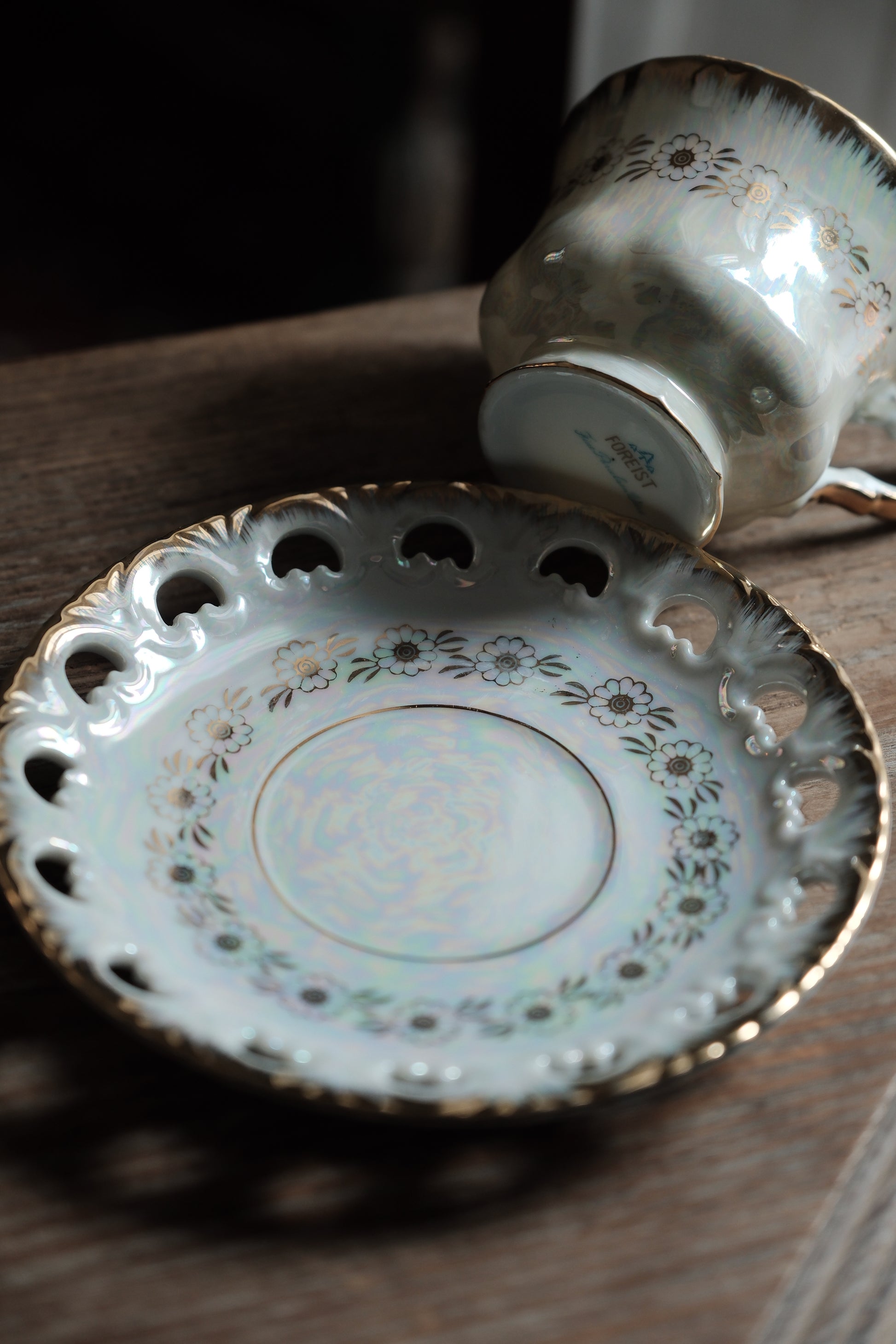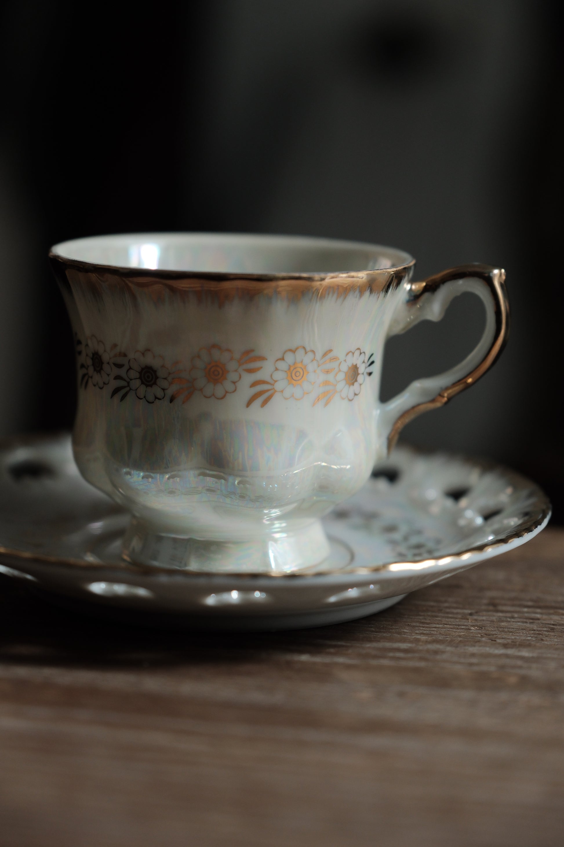 ($60有小瑕疵)日本製·高足貝殼釉浮雕描金花茶紅茶杯(180ml)